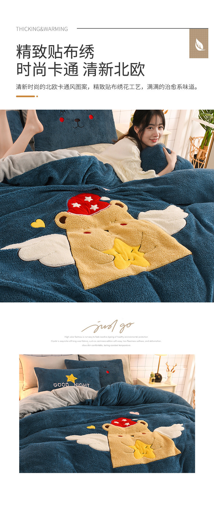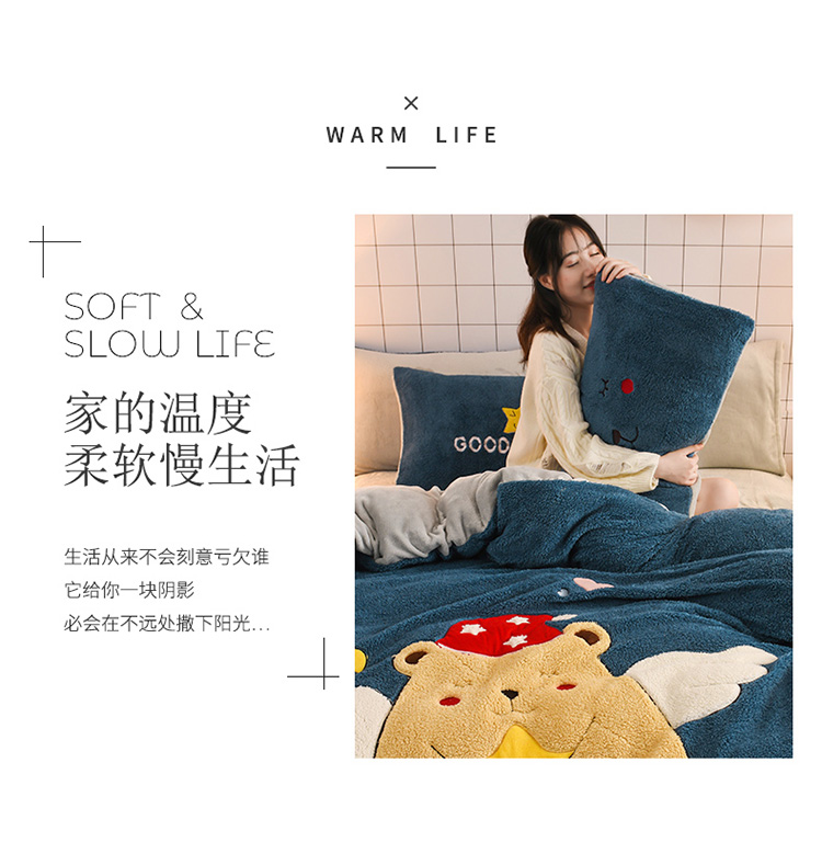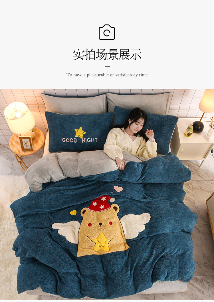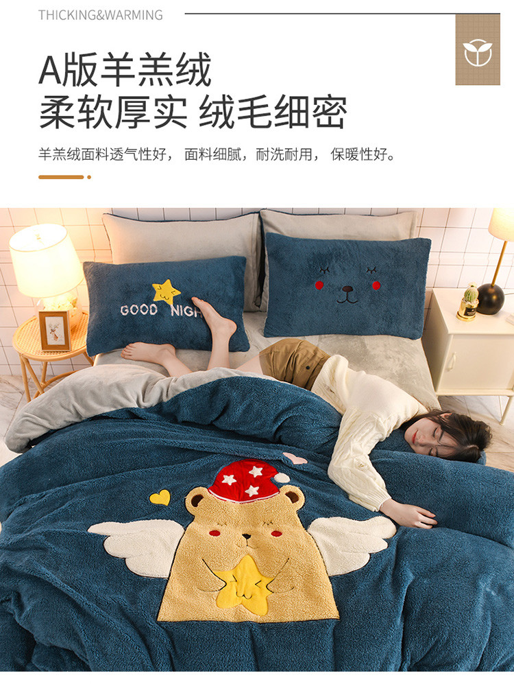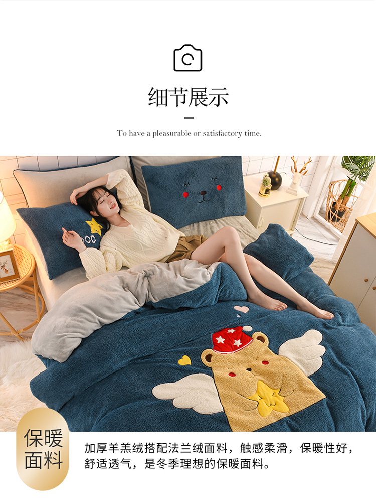 朗莎家纺 2020新款羊羔绒法兰绒四件套 天使熊-宾利蓝