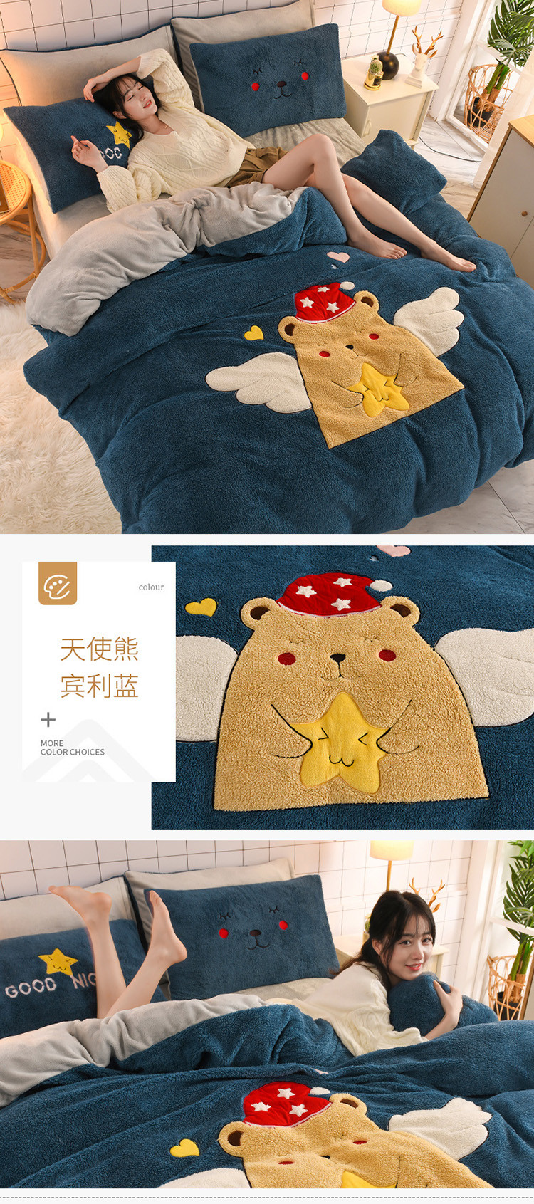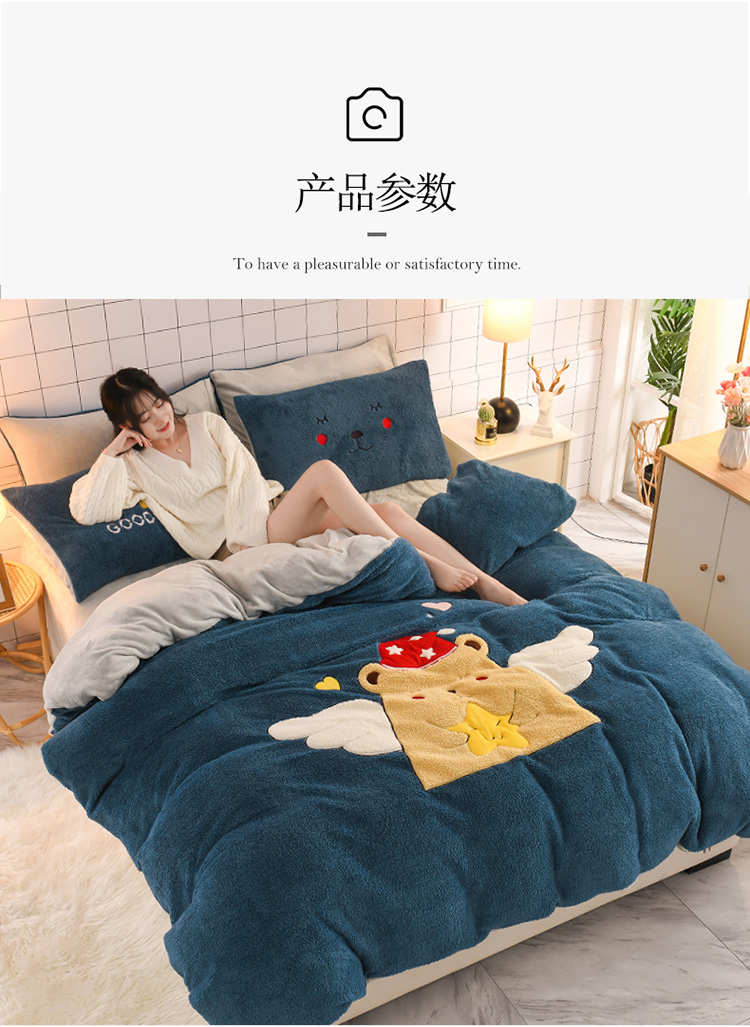 商品名称:朗莎家纺 2020新款羊羔绒法兰绒四件套 天使熊-宾利蓝