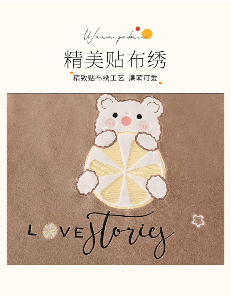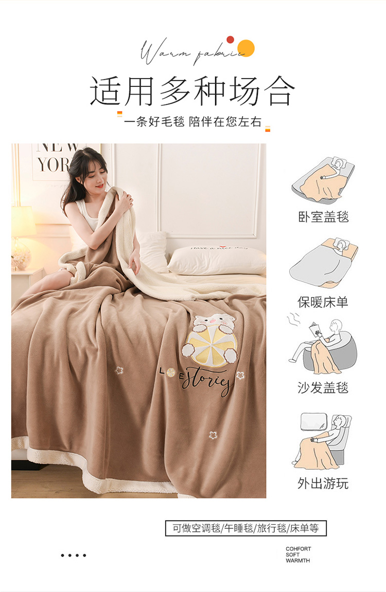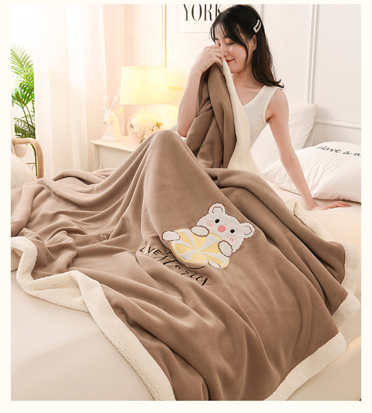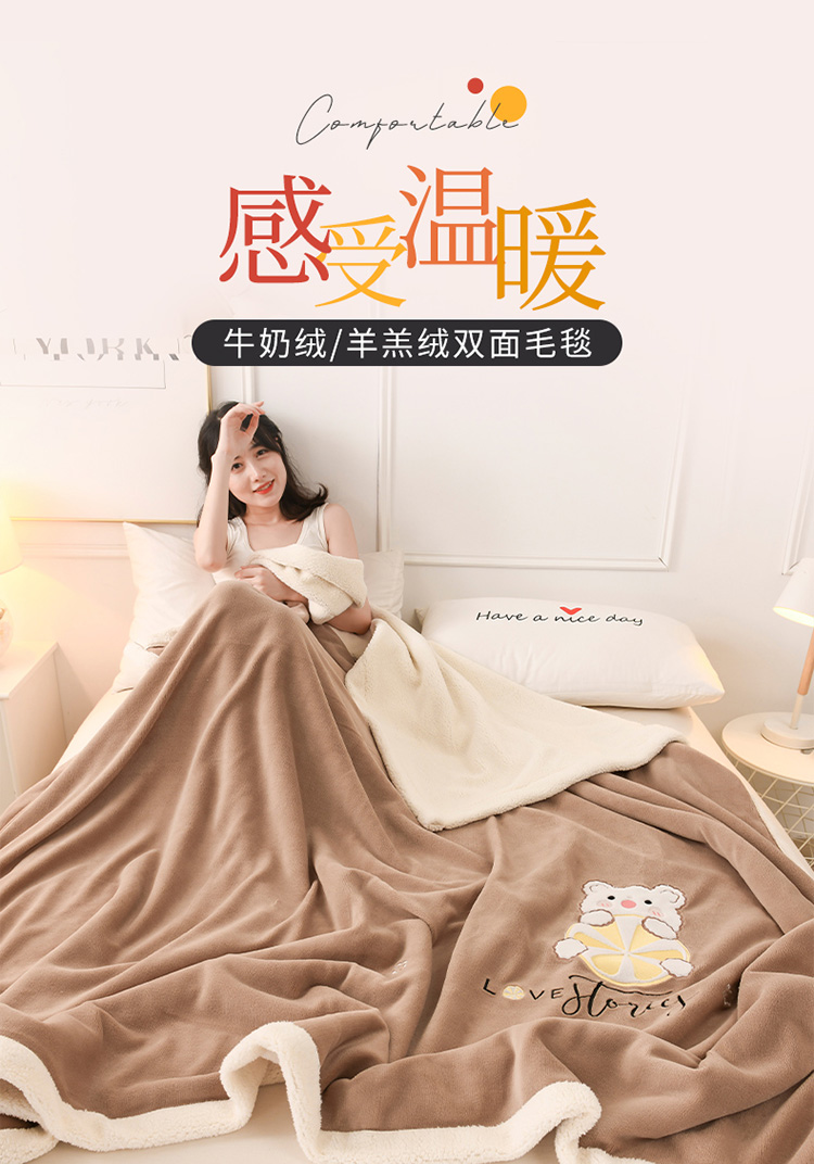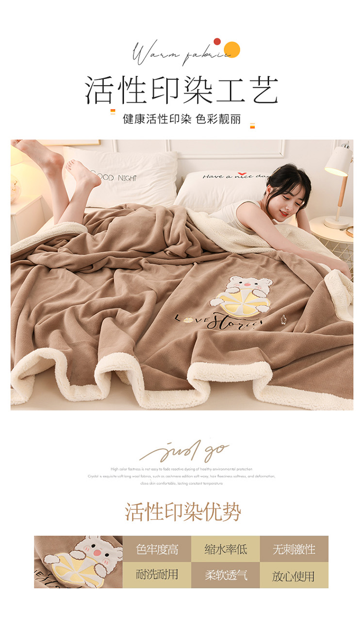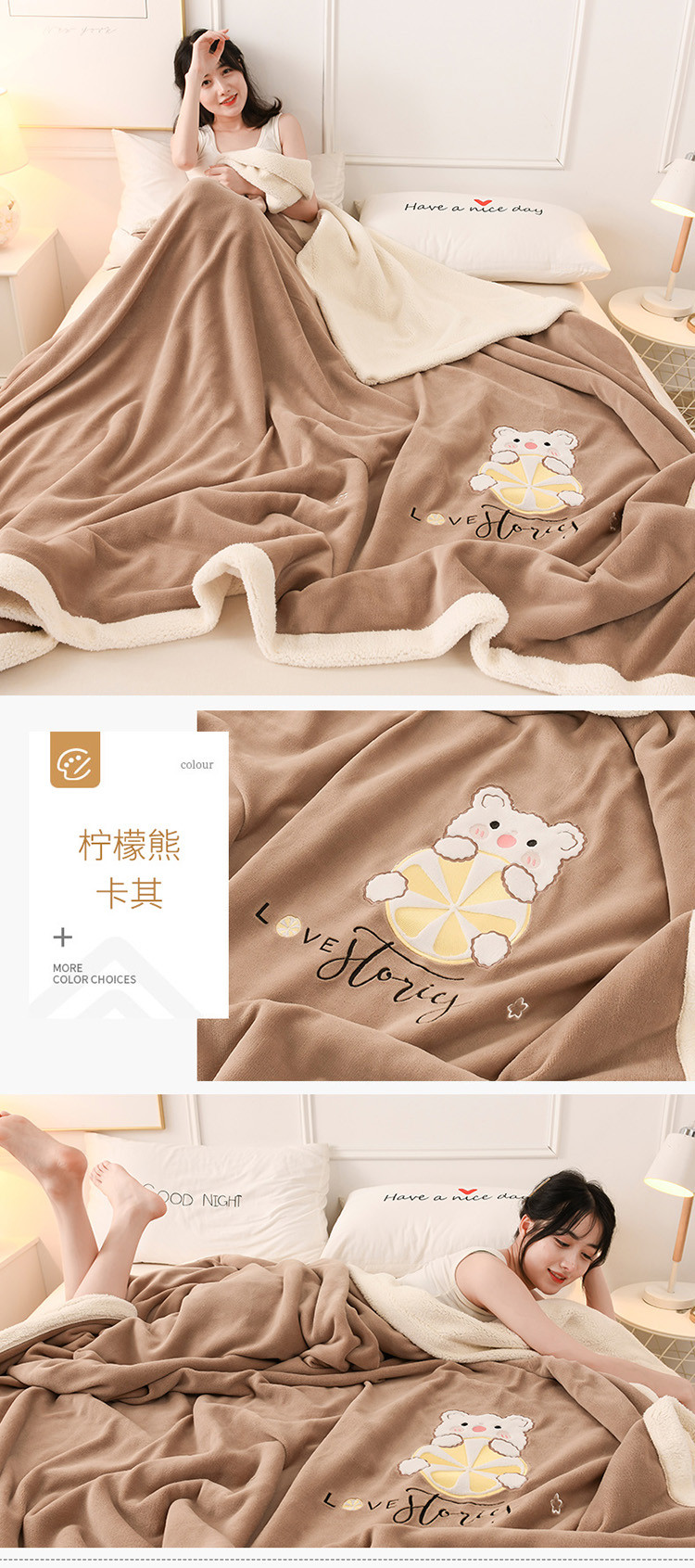 商品名称:朗莎家纺 2020新款羊羔绒+牛奶绒毛毯 柠檬熊-卡其