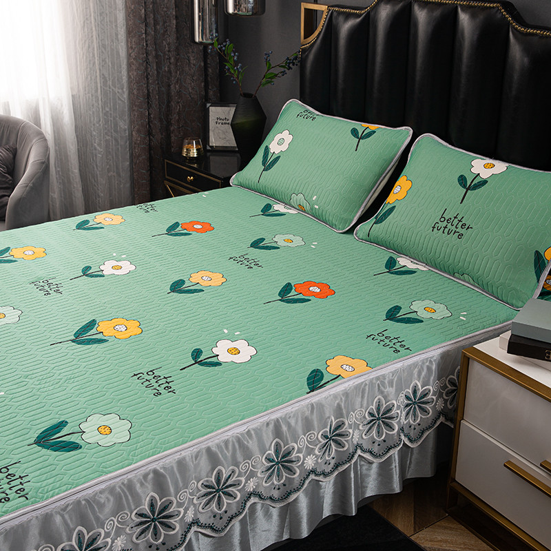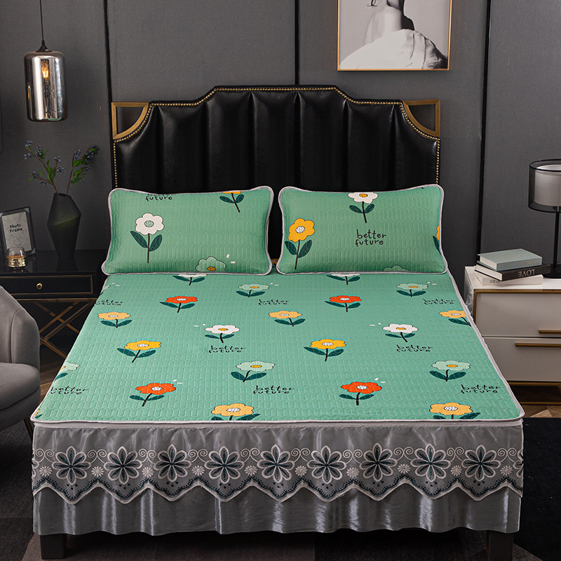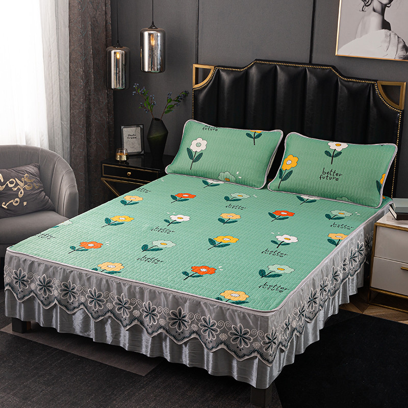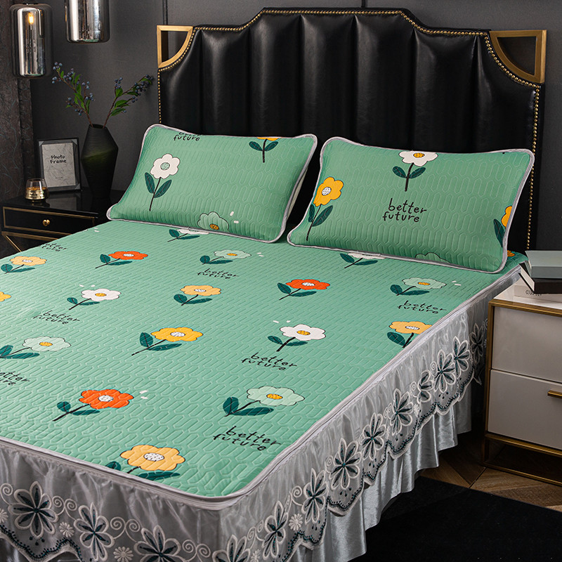 商品名称:纽缦家纺 2021新款凉感丝乳胶凉席可拆卸床裙款三件套 绿野仙踪墨绿