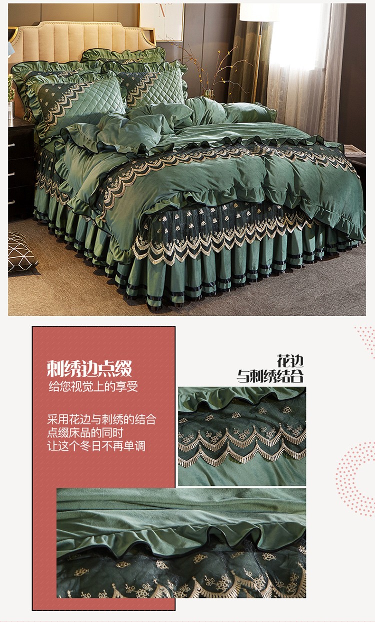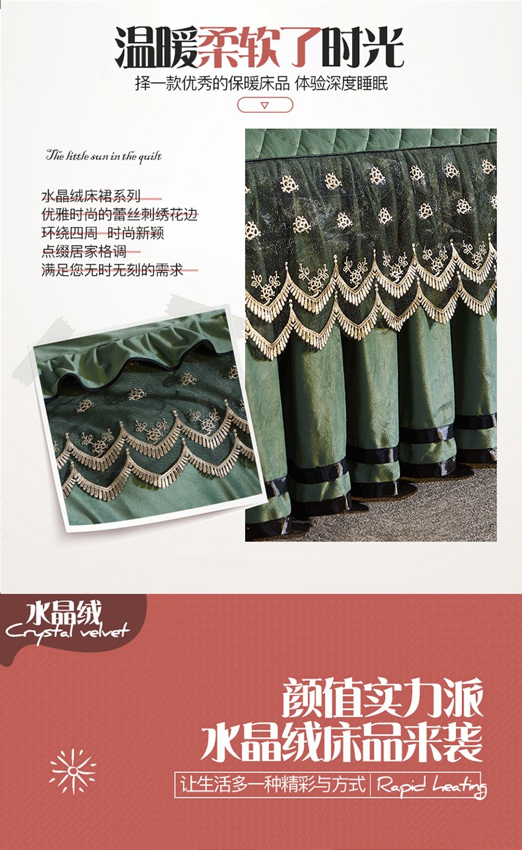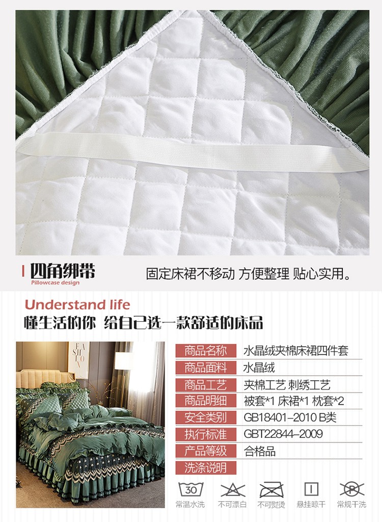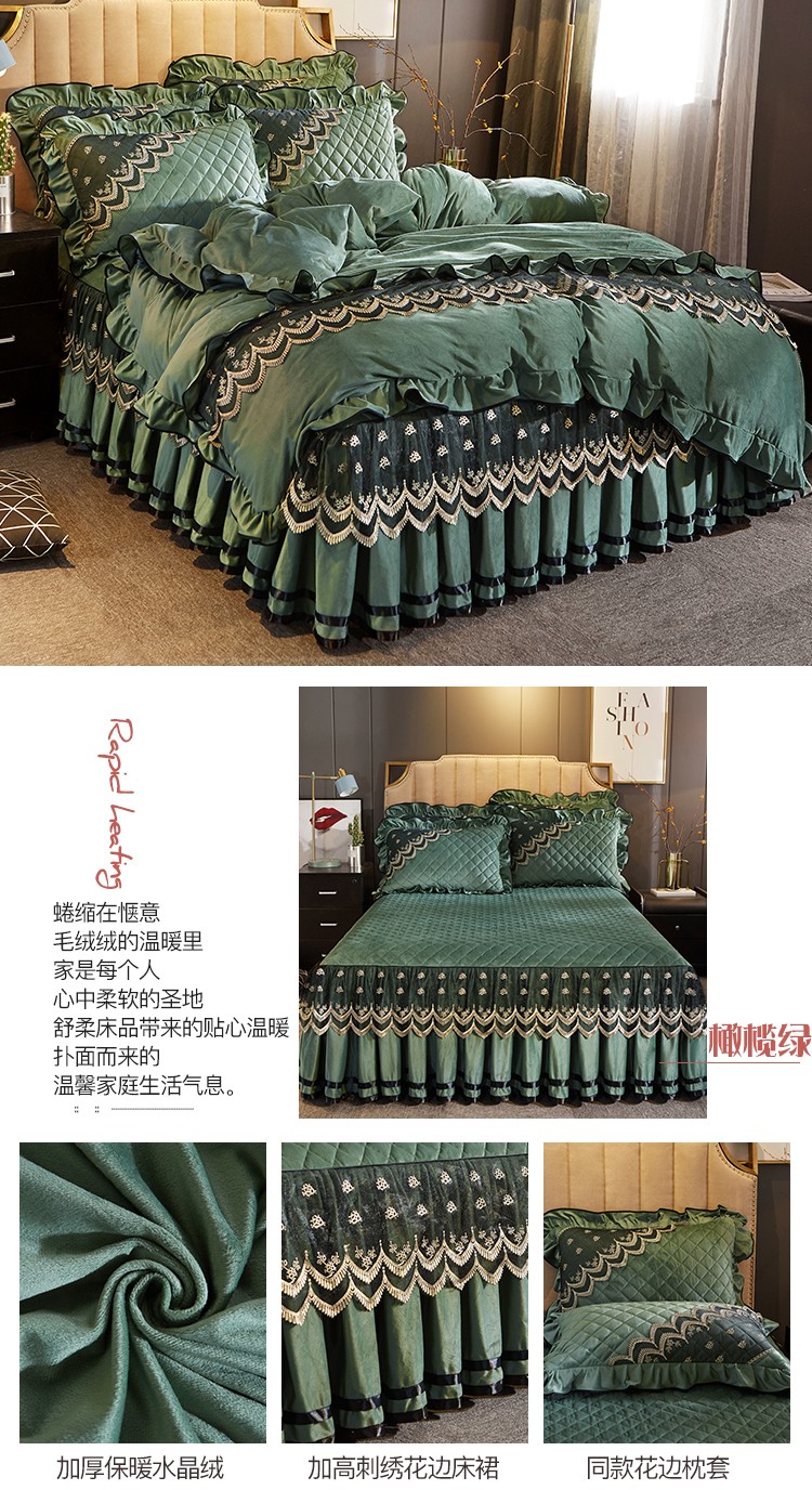 商品名称:网红馆 2025新款玲珑时尚水晶绒夹棉床裙四件套 橄榄绿