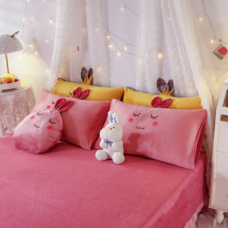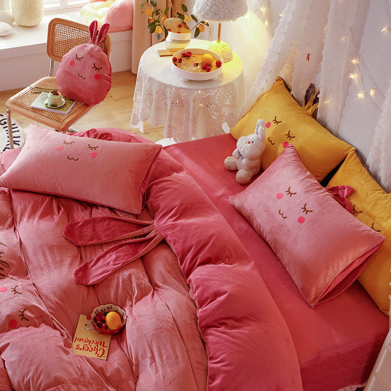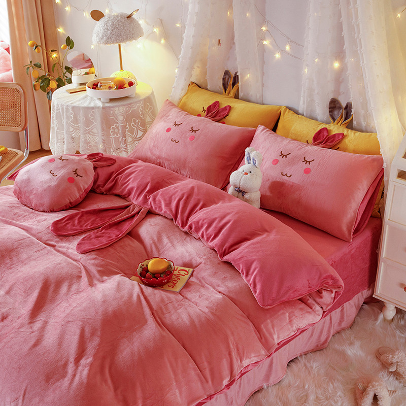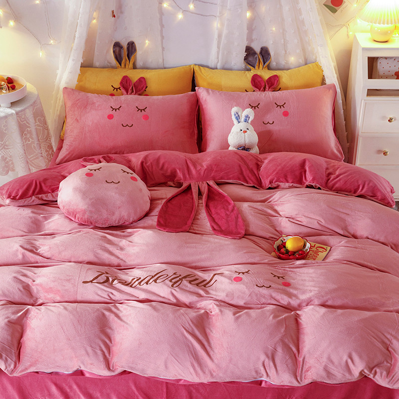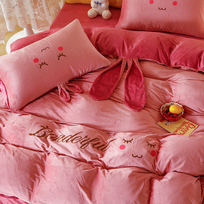 商品名称:纽缦 2021新款兔耳朵水晶绒床单床笠四件套 兔子 深浅豆沙