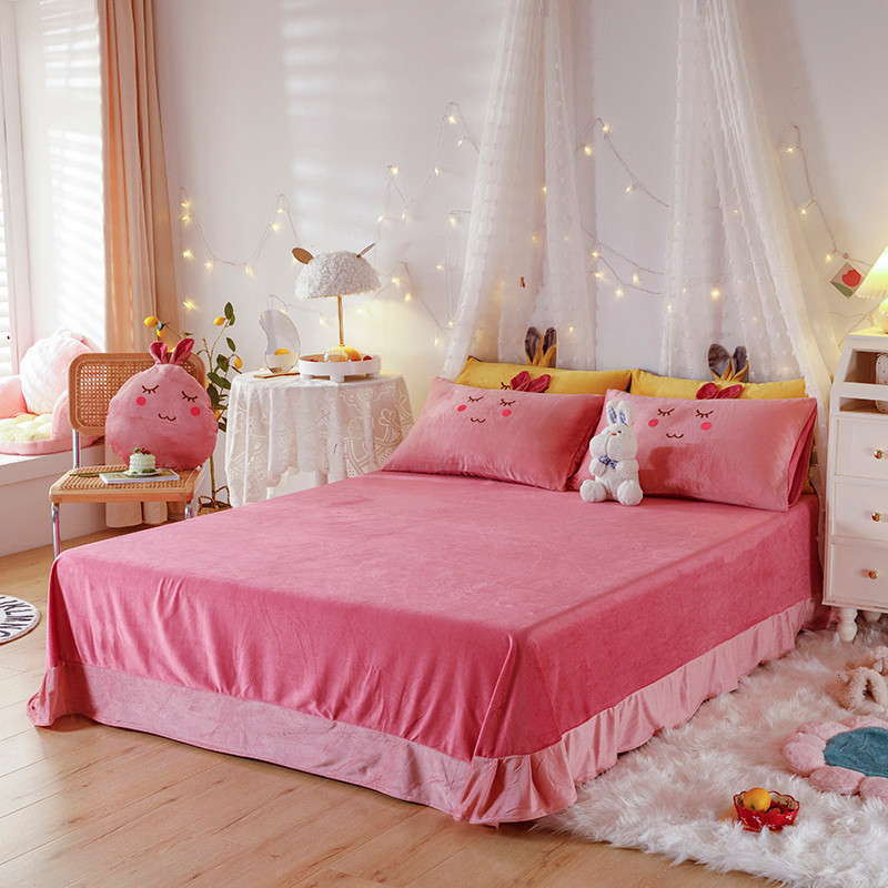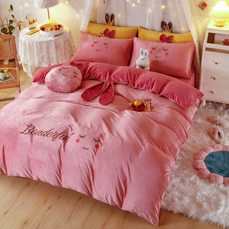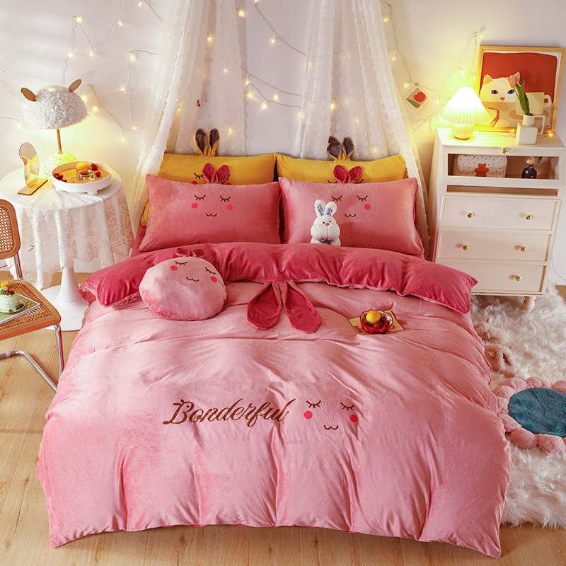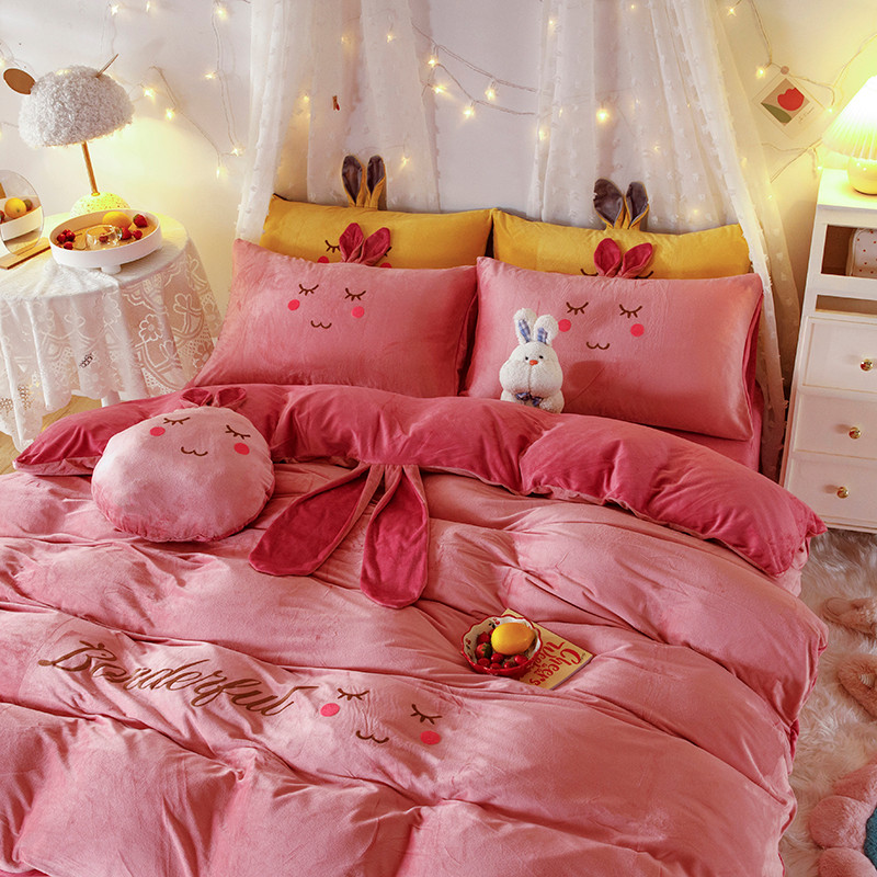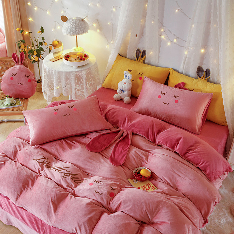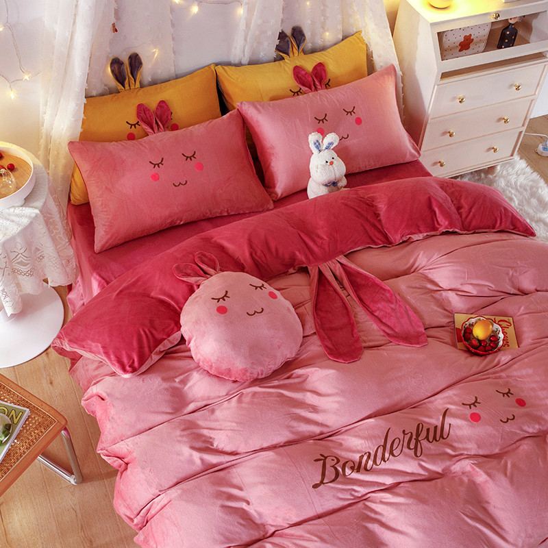 商品名称:纽缦 2021新款兔耳朵水晶绒床单床笠四件套 兔子 深浅豆沙