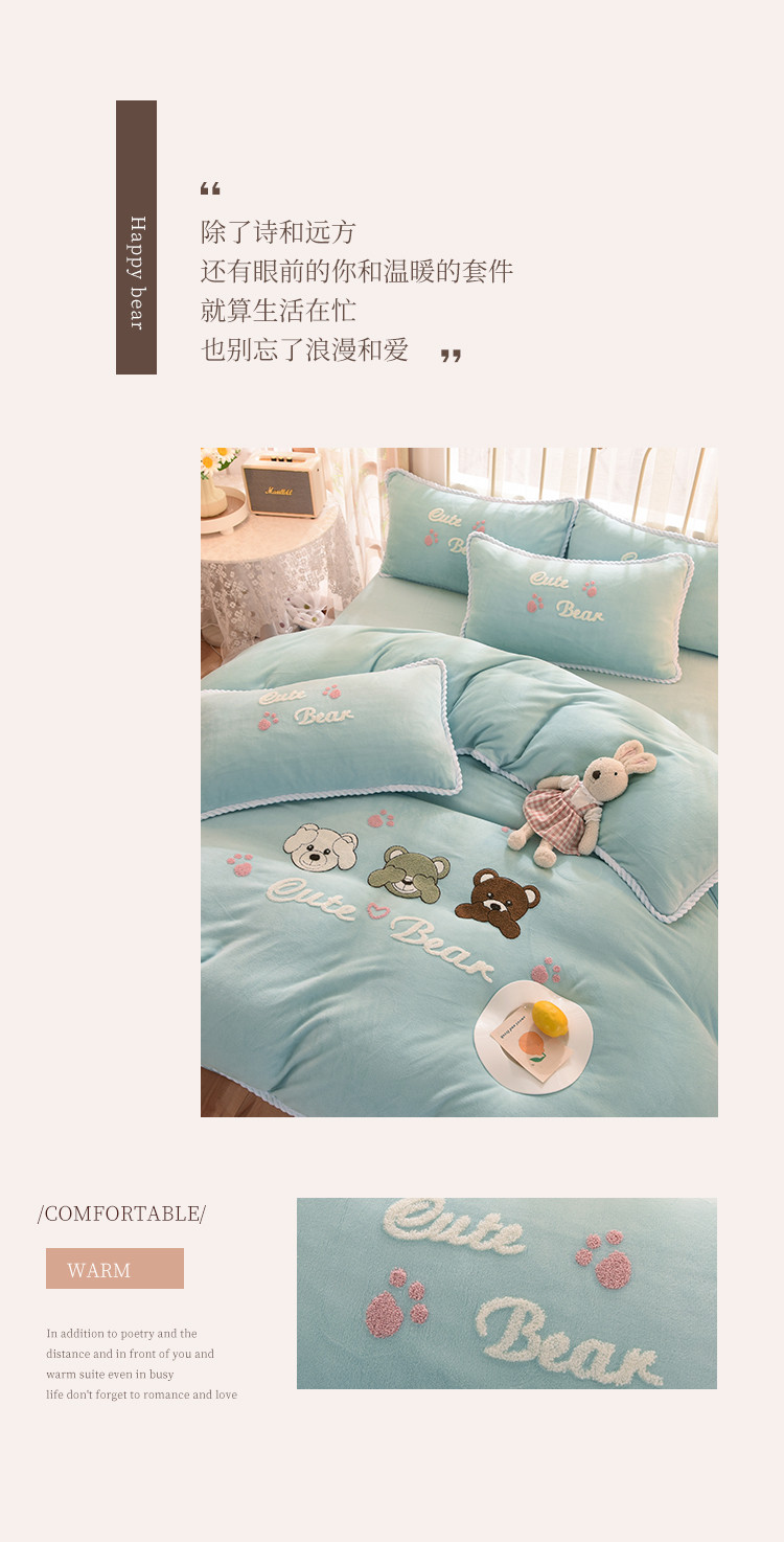 商品名称:菲儿 2021新款牛奶绒四件套法莱水晶绒快乐熊-蔚蓝