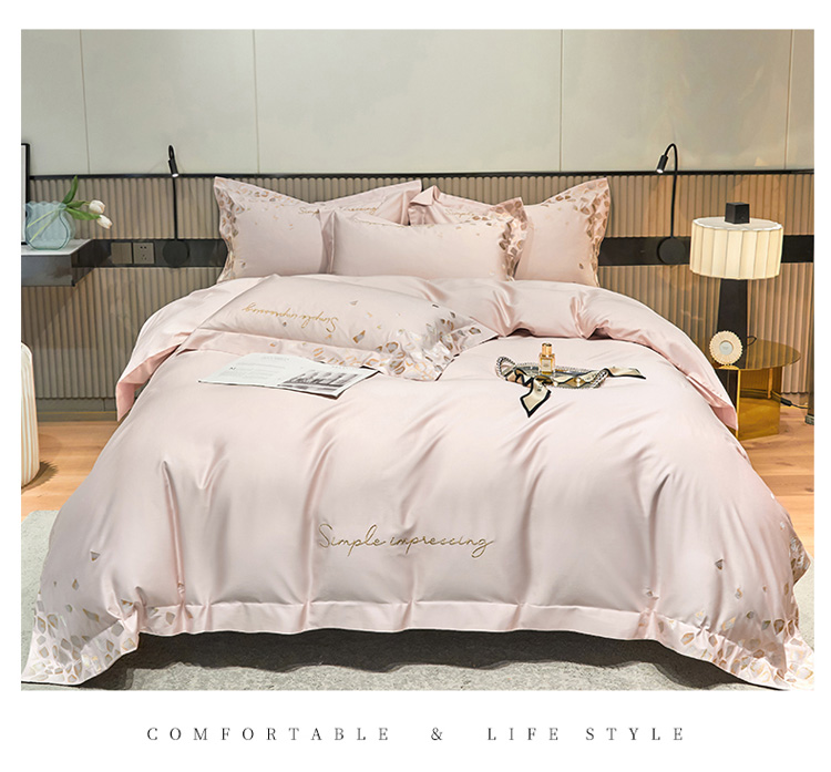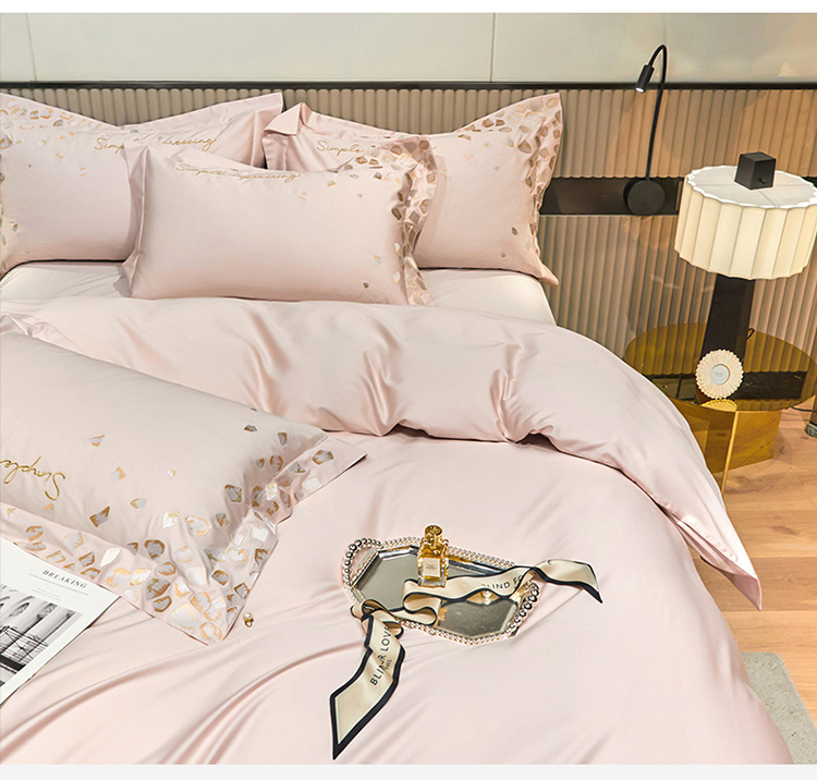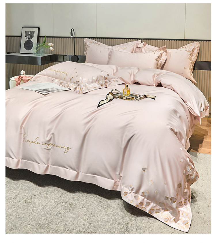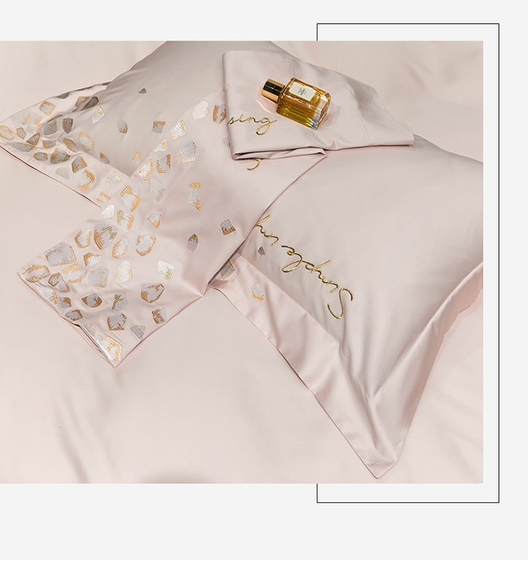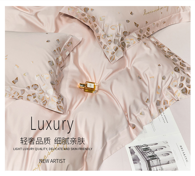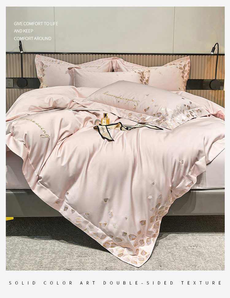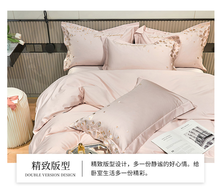 爱缦 新款100支长绒棉贡缎刺绣宽边四件套-耀影系列 仙桃粉