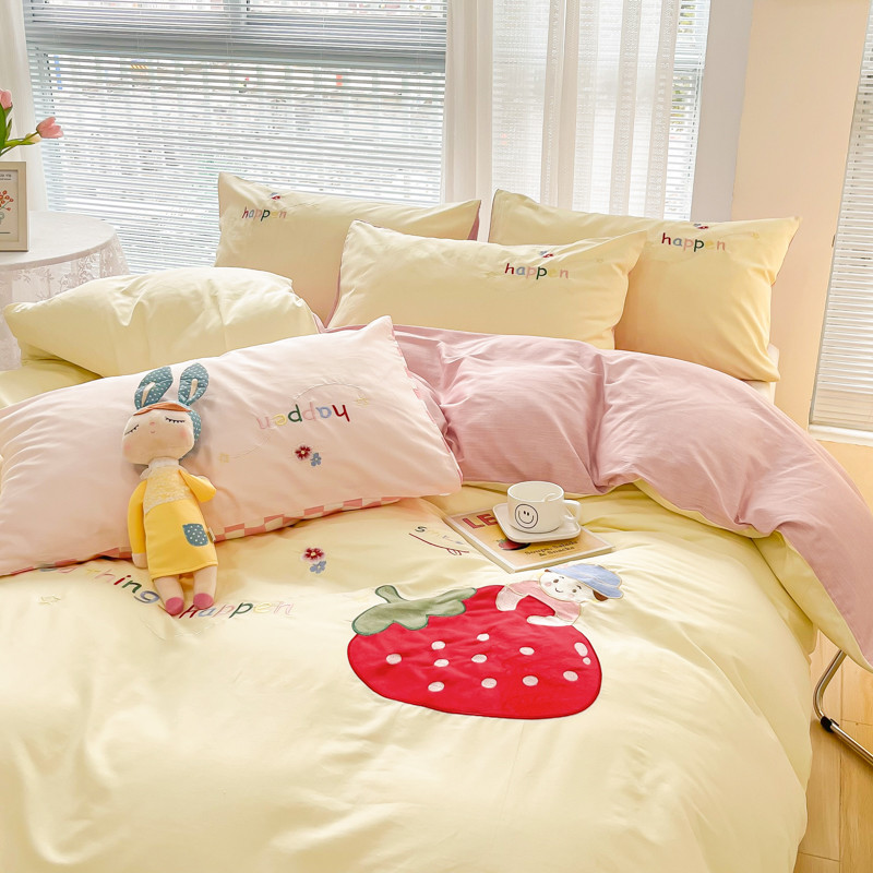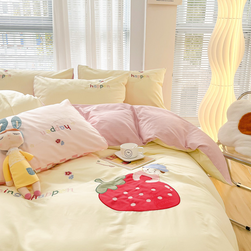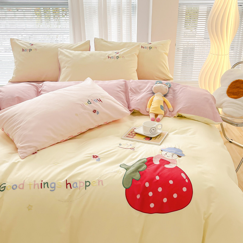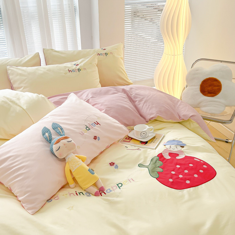 沐辰 2022新款全棉40支绣花草莓女孩系列四件套 草莓女孩-米白