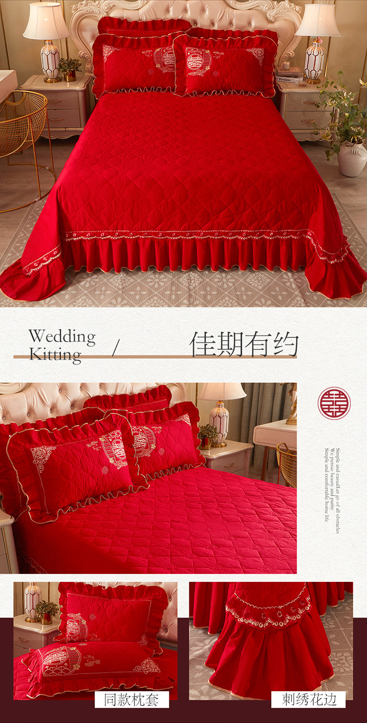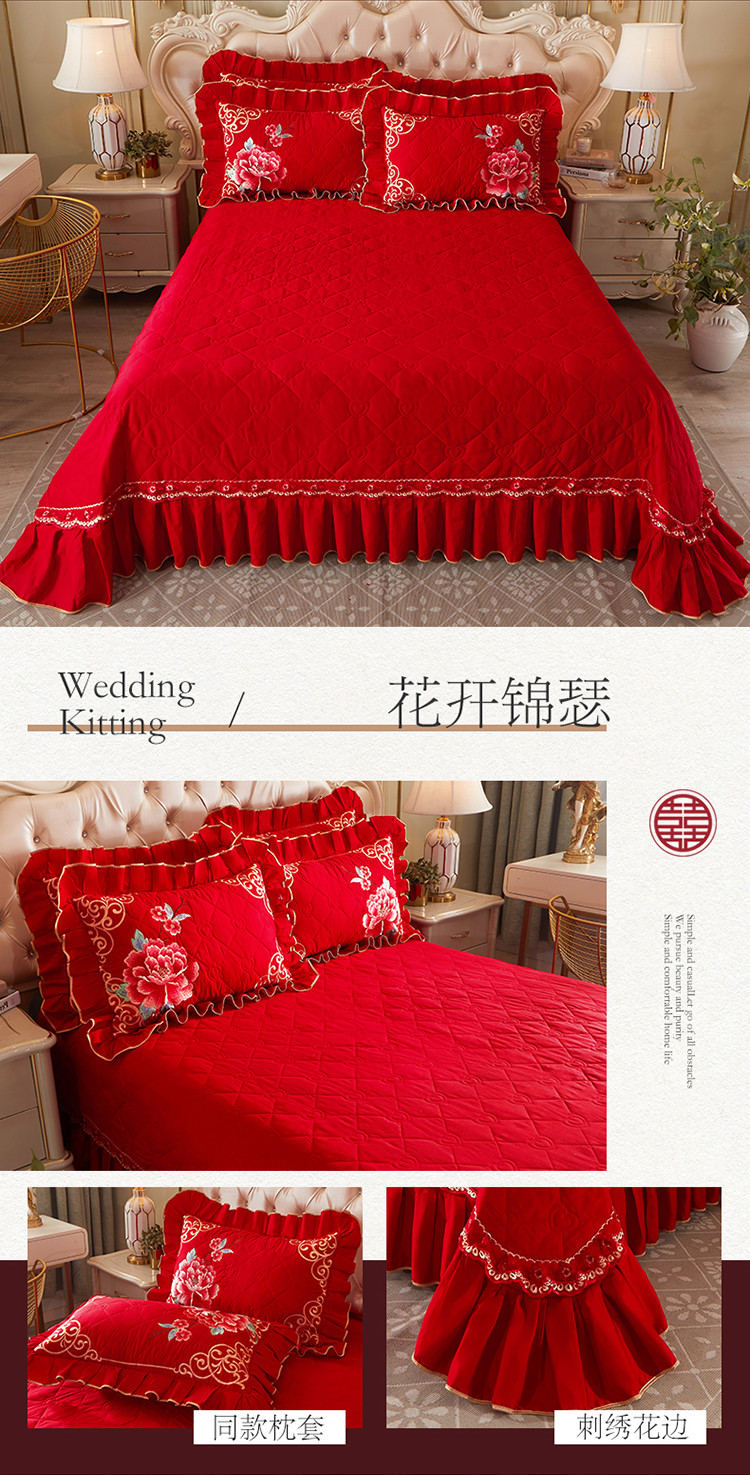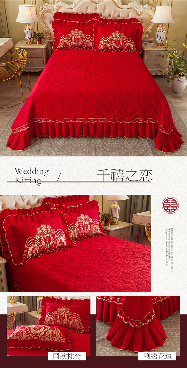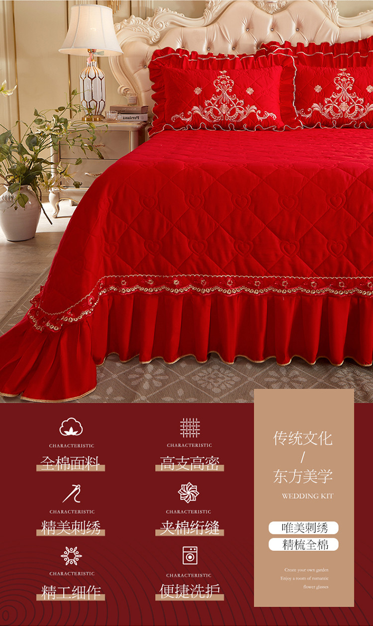 (总)宜凡 2022新款绣花婚庆全棉夹棉床盖三件套