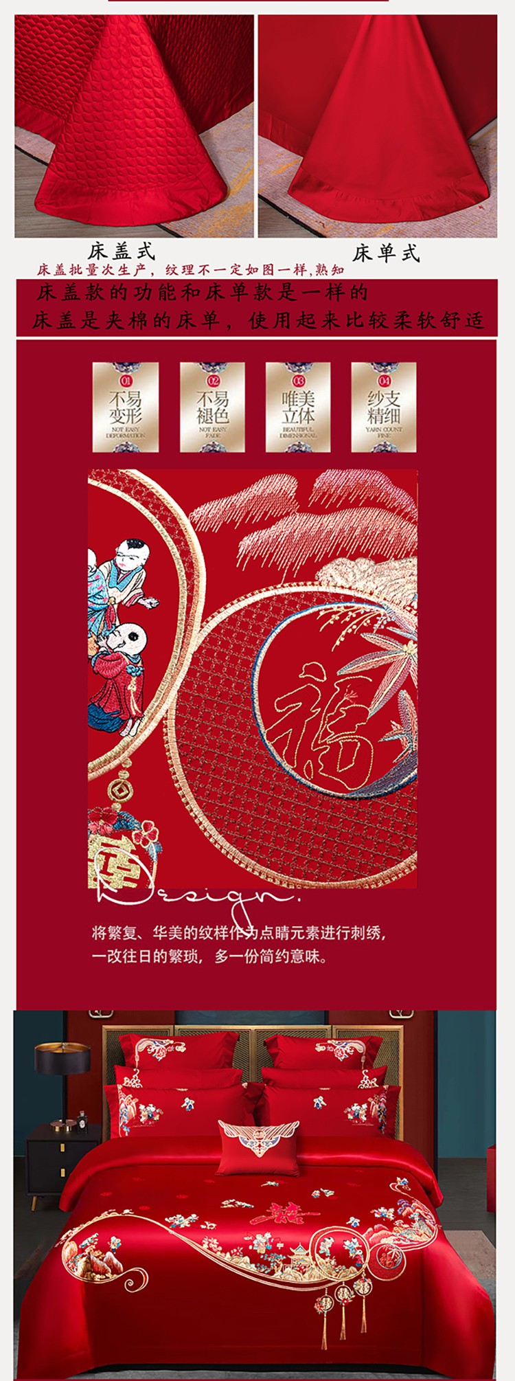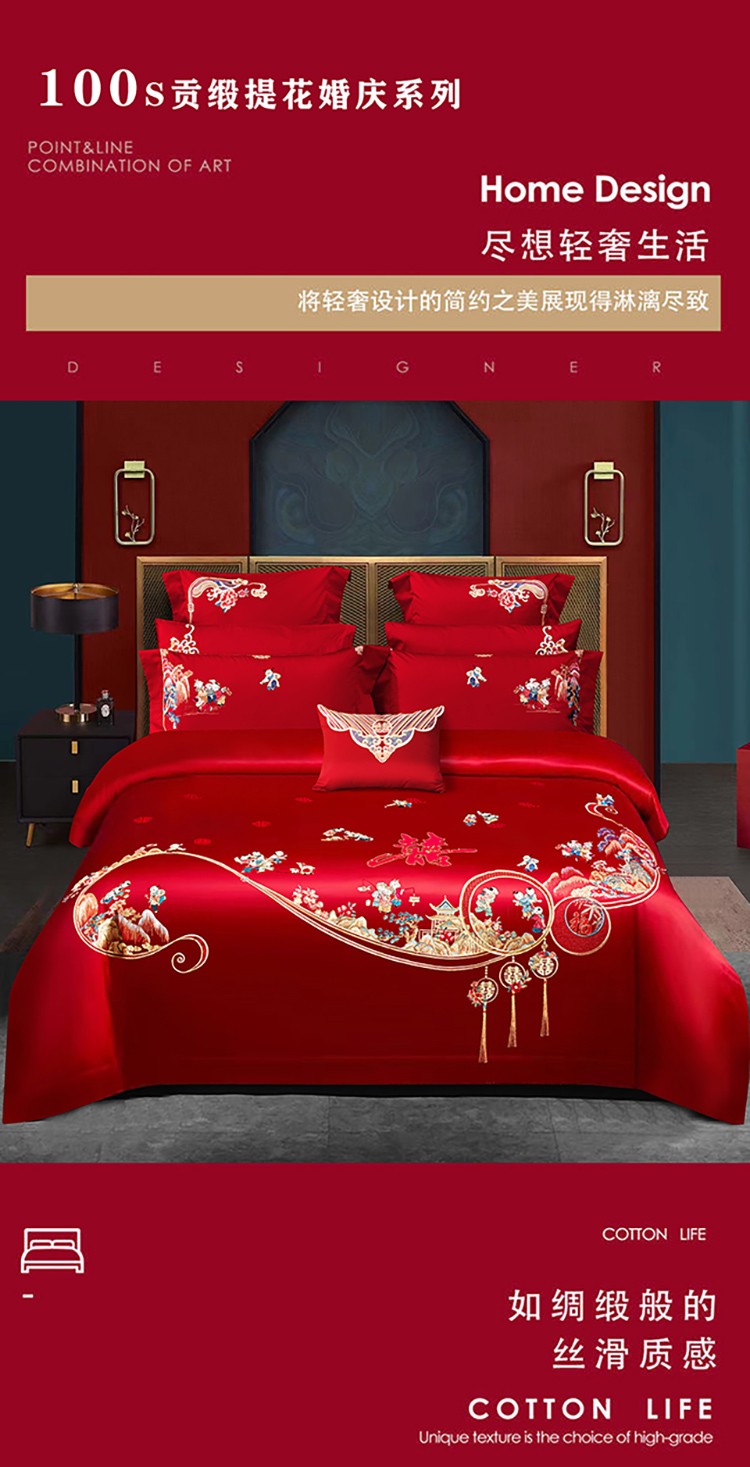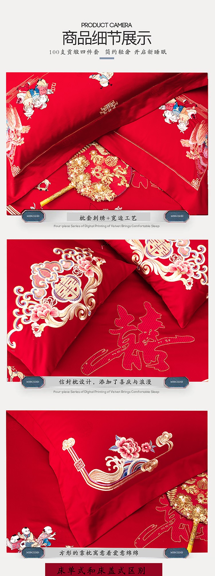 2023新款100s贡缎长绒棉婚庆四件套多件套-国色天香红,床单四件套,床盖四件套,床单六件套,床盖六件套,十件套