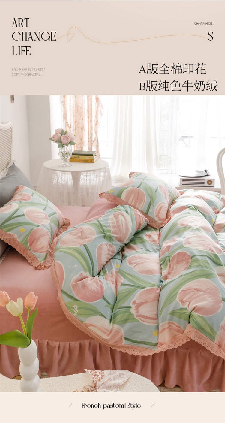 (总)菊上家纺 2023秋冬新品法式花边全棉床盖四件套,安妮紫,花千骨,小欢喜,布拉格,罗蔓莉,玛雅灰,小幸运,卡町绿,恋花影,薇薇安