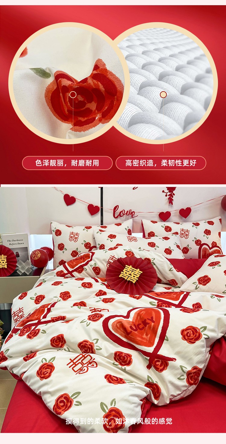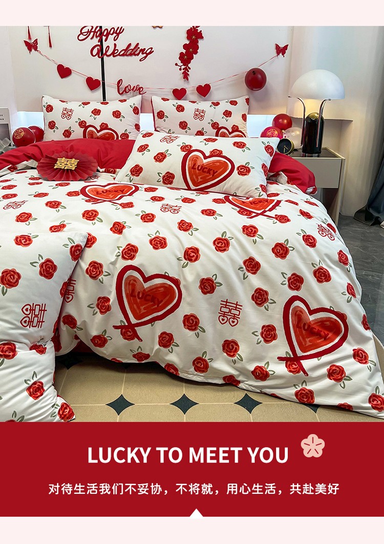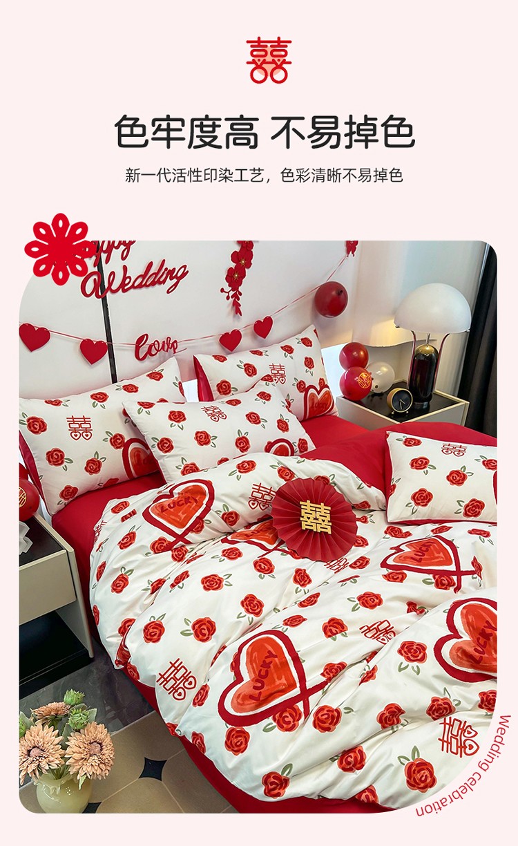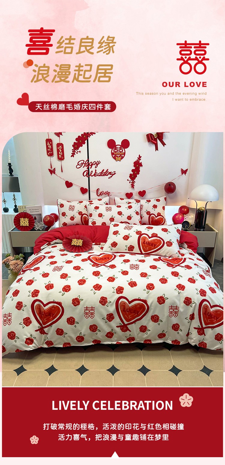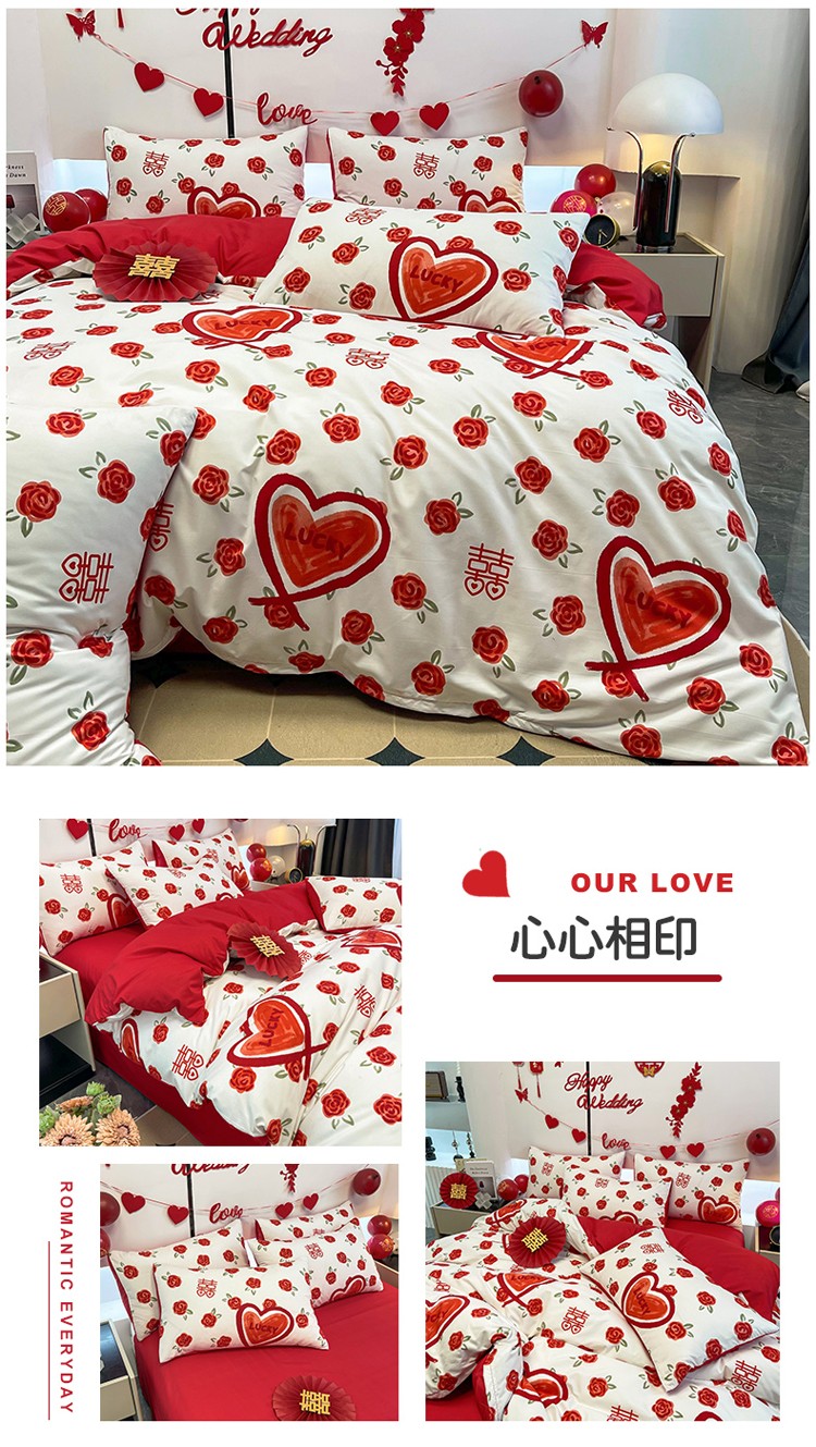 宏源 2022年新款大红时尚磨毛婚庆四件套 心心相印