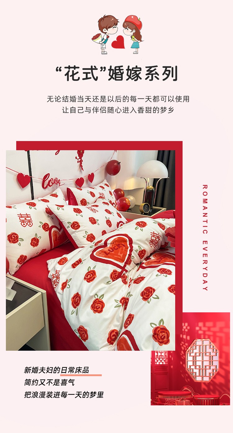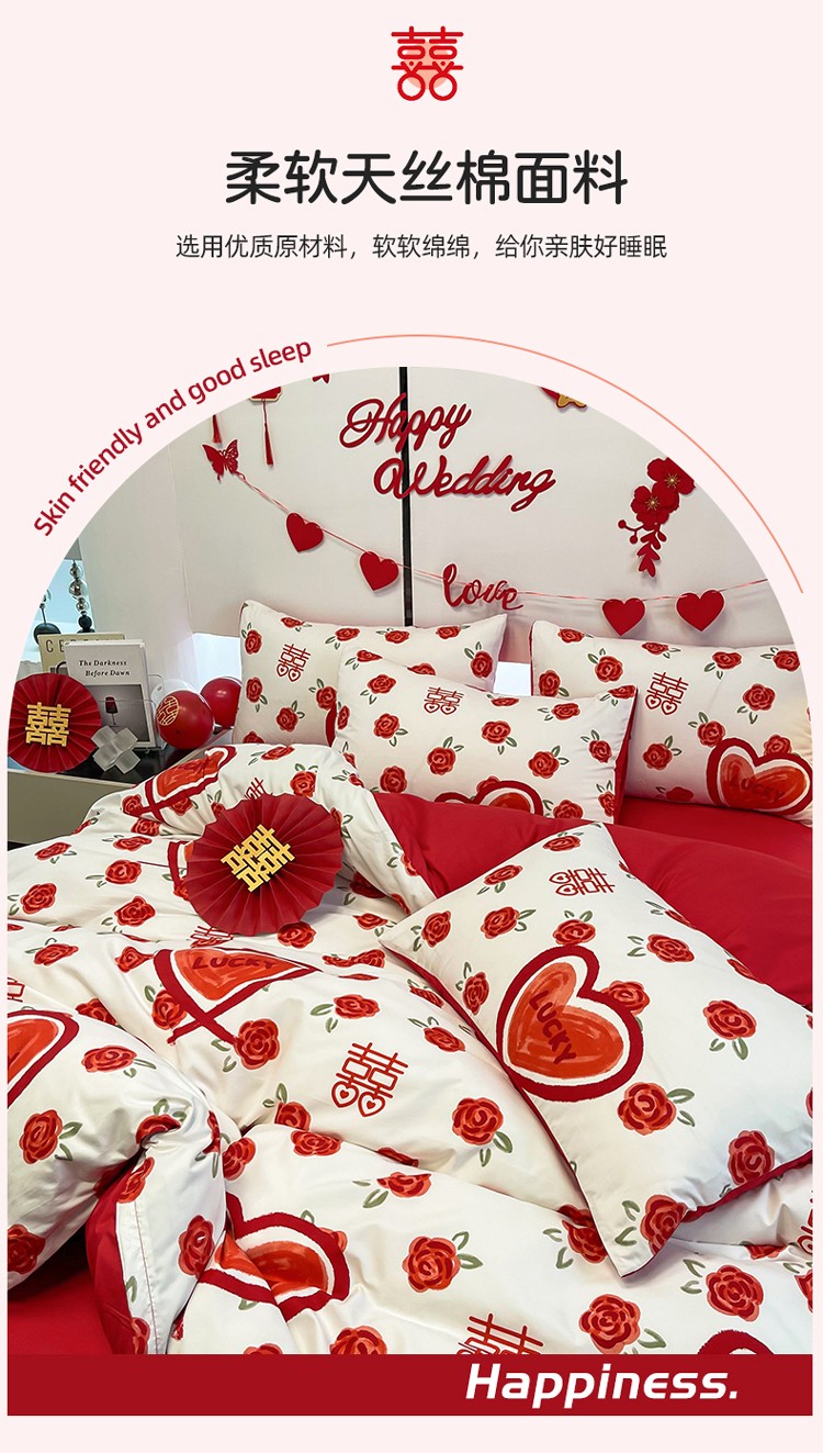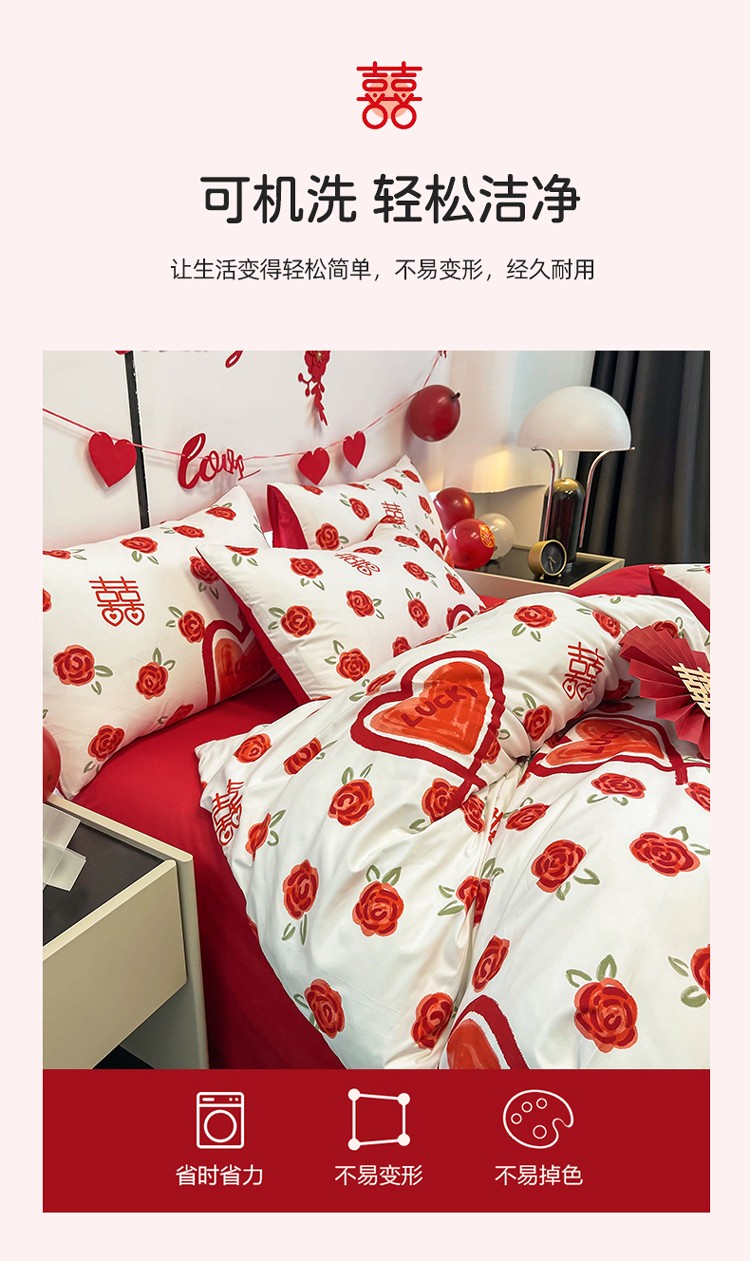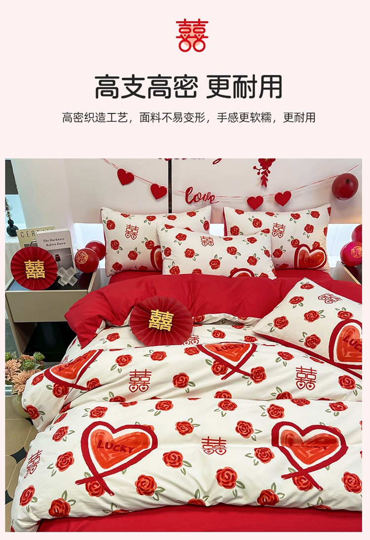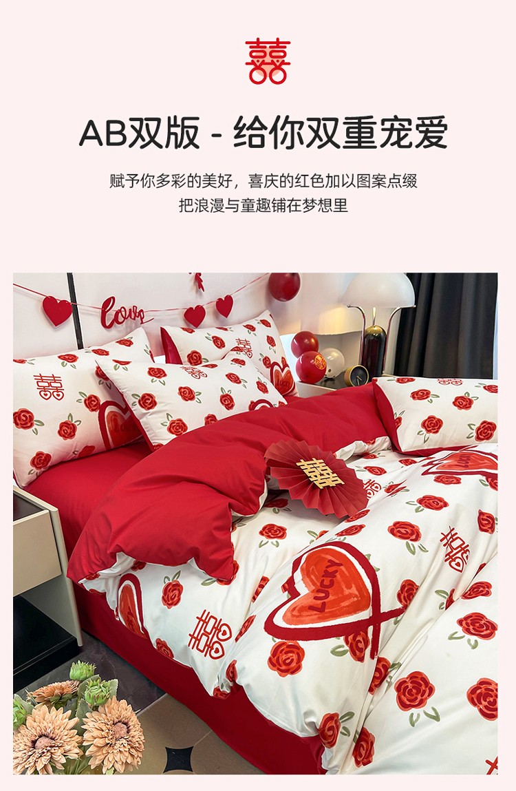 宏源 2022年新款大红时尚磨毛婚庆四件套 心心相印