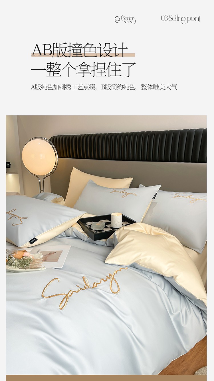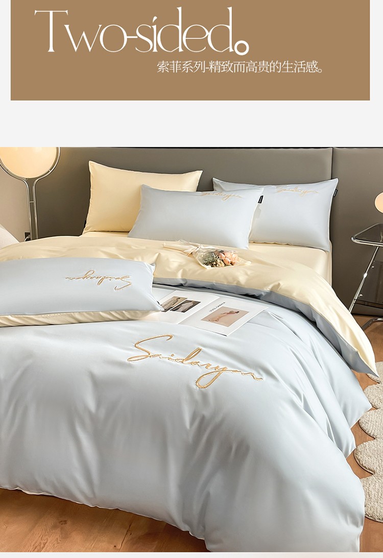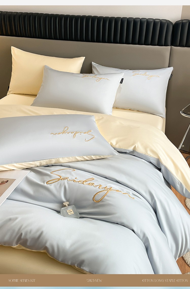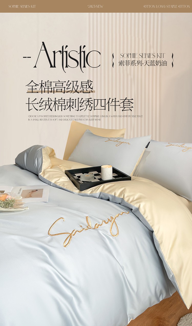 商品名称:蓝米卡夫 2024全棉高级感长绒棉刺绣索菲系列-四件套 索菲-天蓝奶油