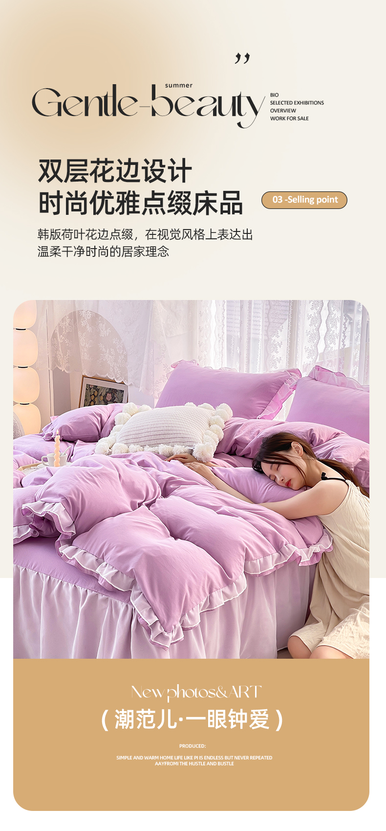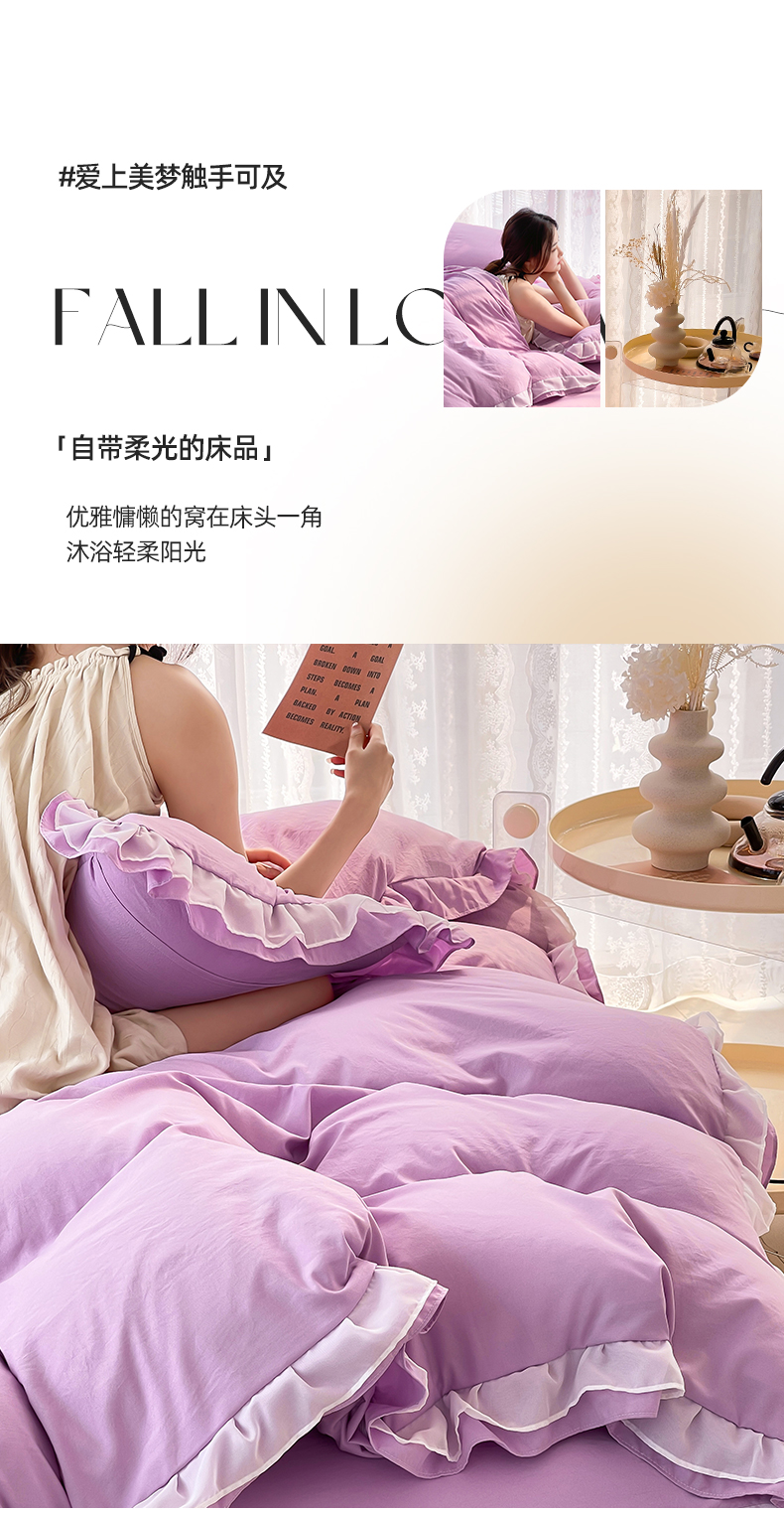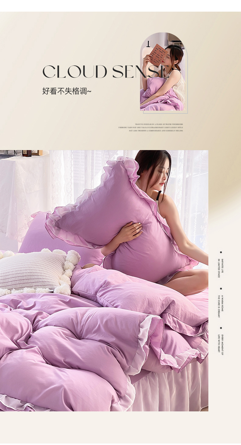 当前位置: 91家纺网 > 商品网购 > 床品套件 > 四件套 > 水洗棉四件套 > 简爱 2025新款水洗棉雪纺双层花边四件套 优雅紫