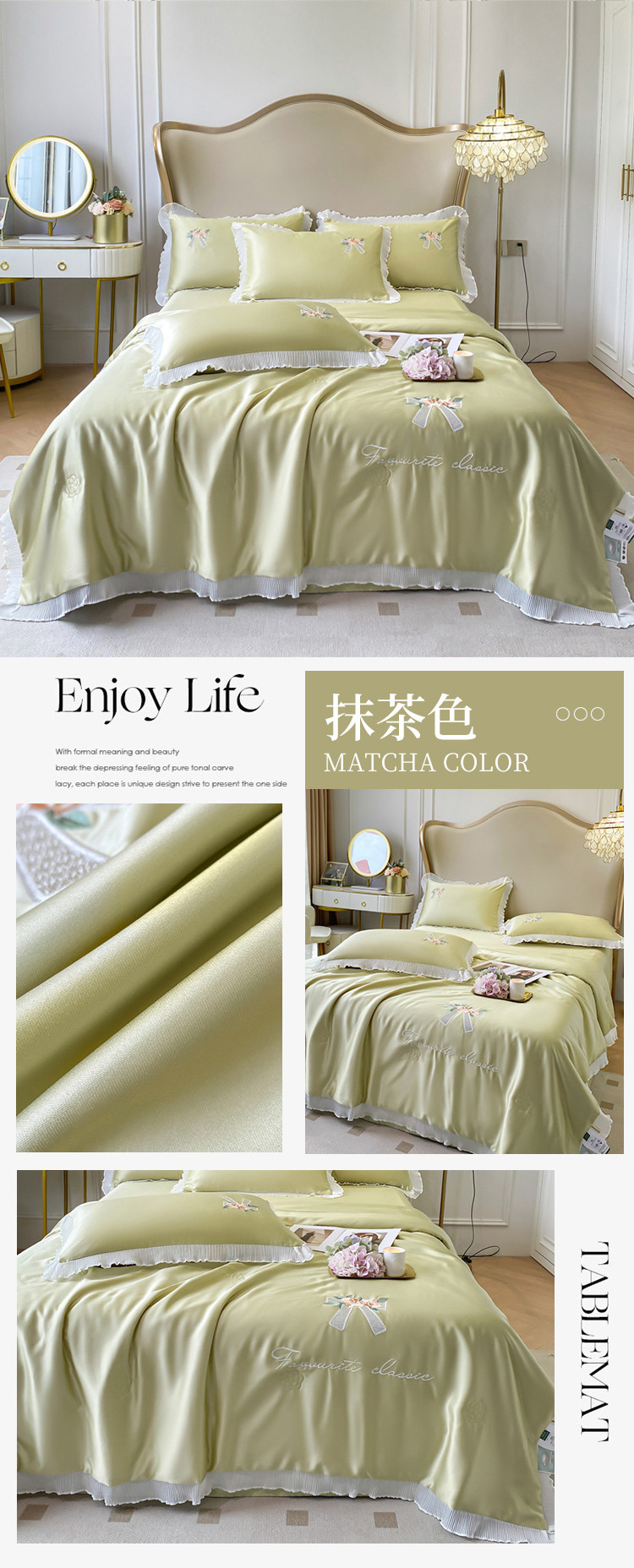 (总)伊人居 2024新款蕾丝款夏被四件套-梦娜系列,梦娜-抹茶金,梦娜-湖水兰,梦娜-珍珠粉,梦娜-薄荷绿,梦娜-香玉紫