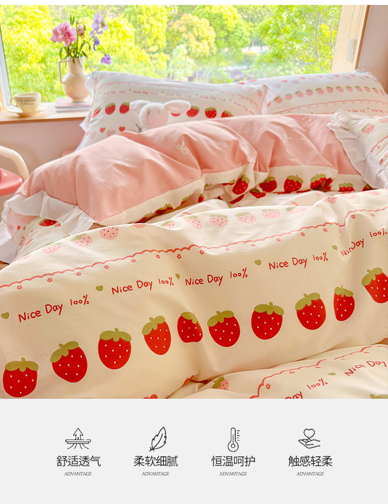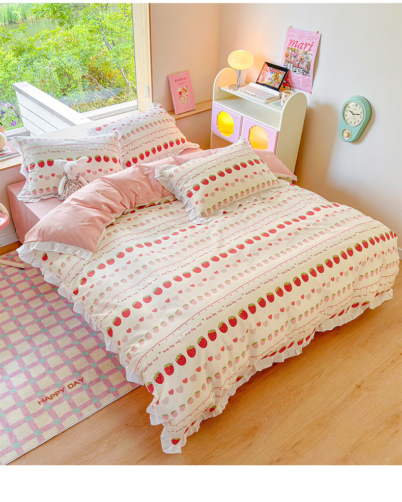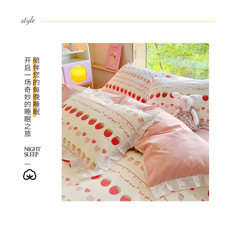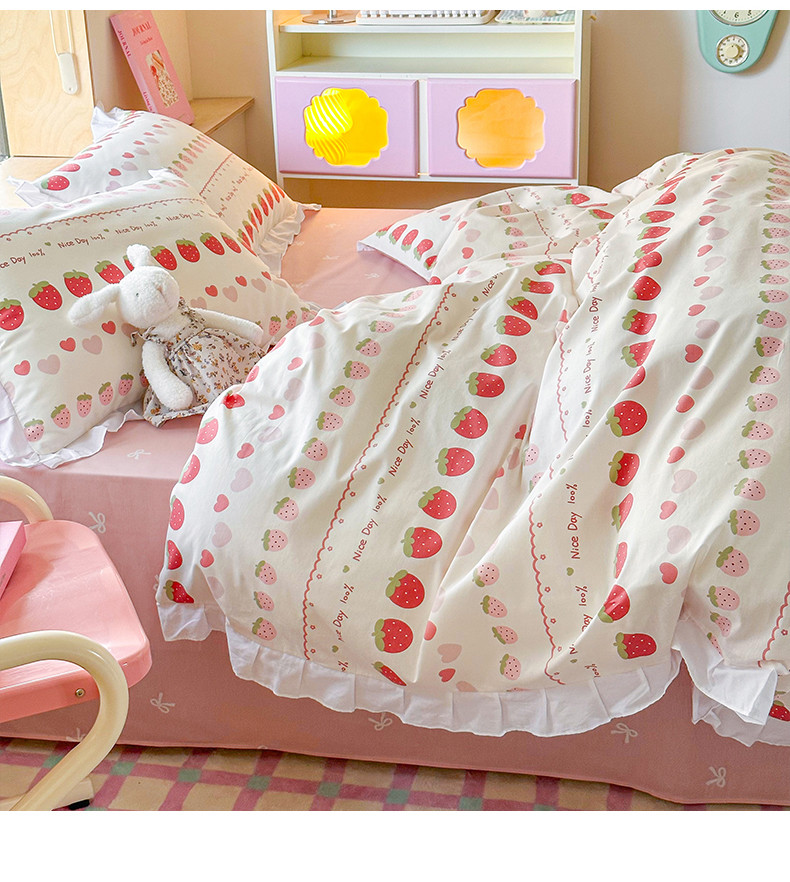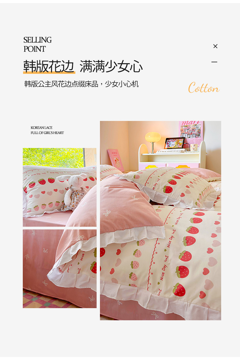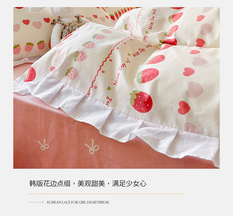 商品名称:桃子 2023新款仙气奶油碎花少女心韩版花边纯棉四件套 花边-草莓多多