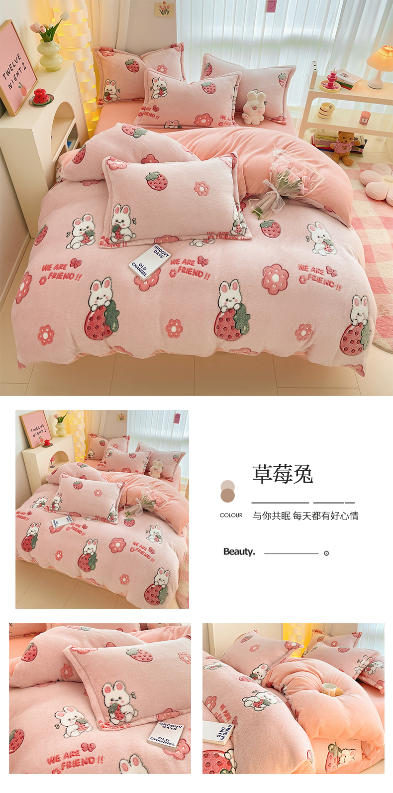 当前位置: 91家纺网 > 商品网购 > 床品套件 > 四件套 > 牛奶绒四件套 > 同田家纺 2024秋冬新品雪花绒牛奶绒印花四件套 草莓兔