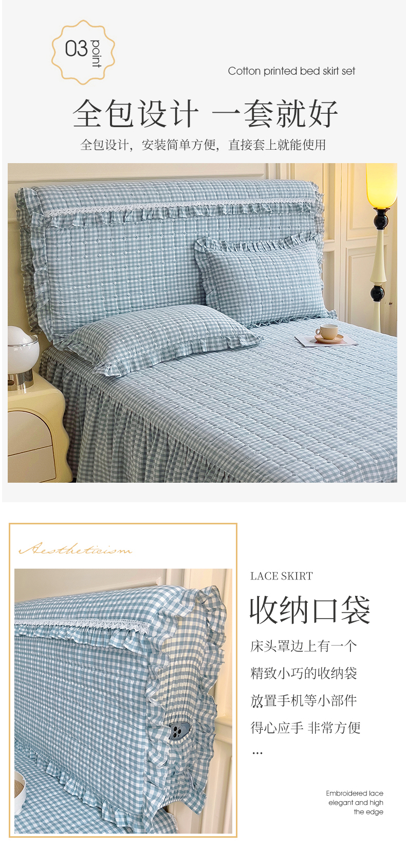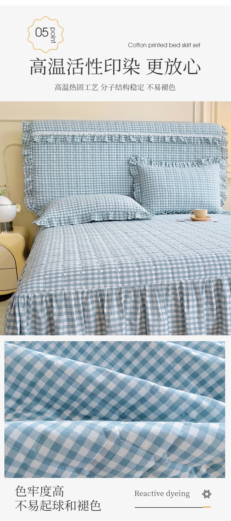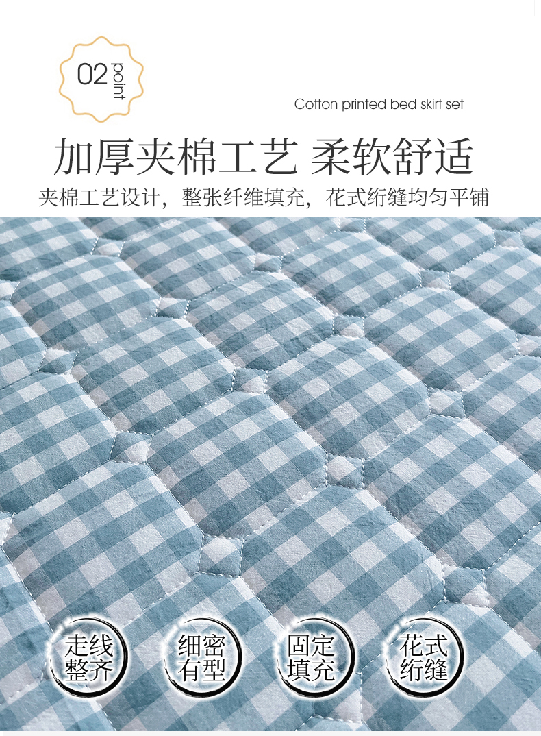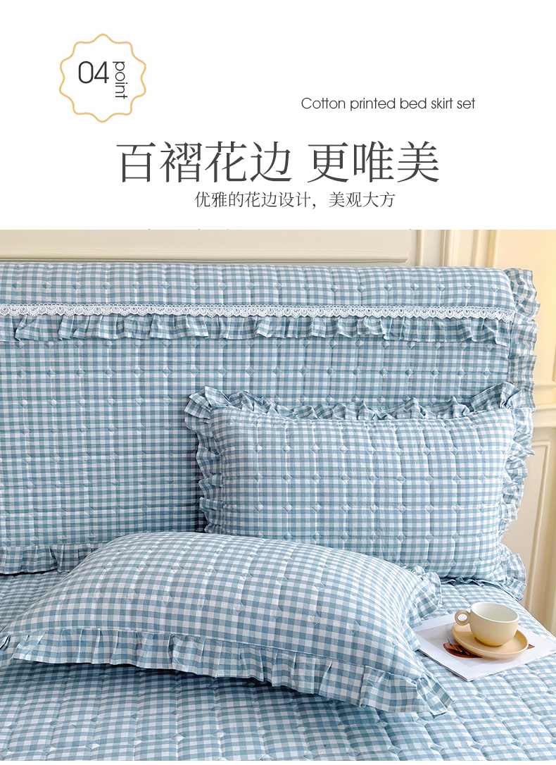 (总)十个点家纺 2025新款千鸟格磨毛绗缝夹棉纯色花边床裙三件套,经典白色,经典兰色,经典浅灰,经典浅驼,经典深灰,经典玉粉