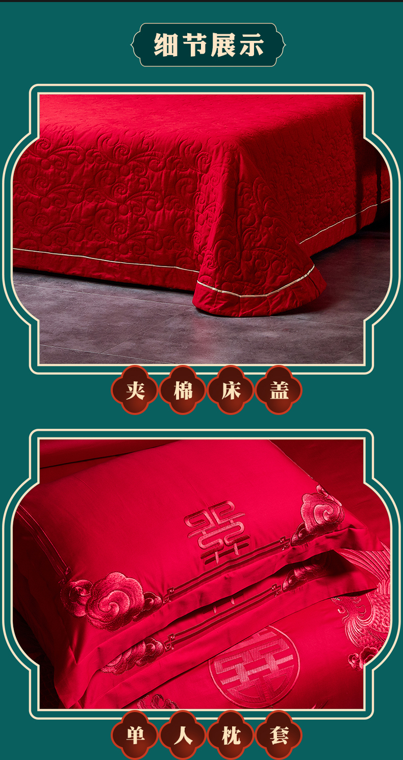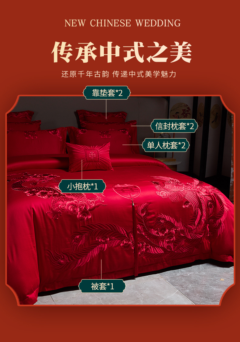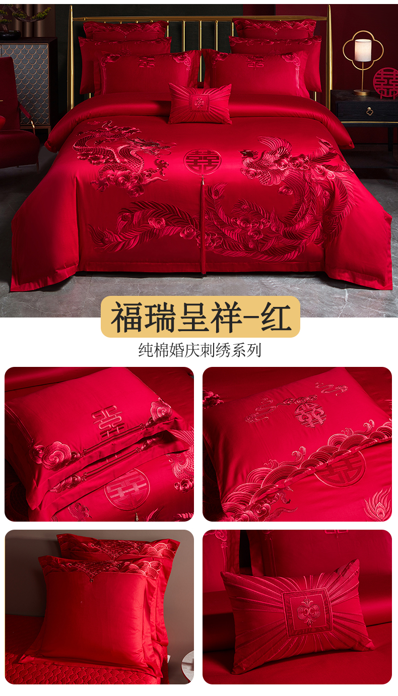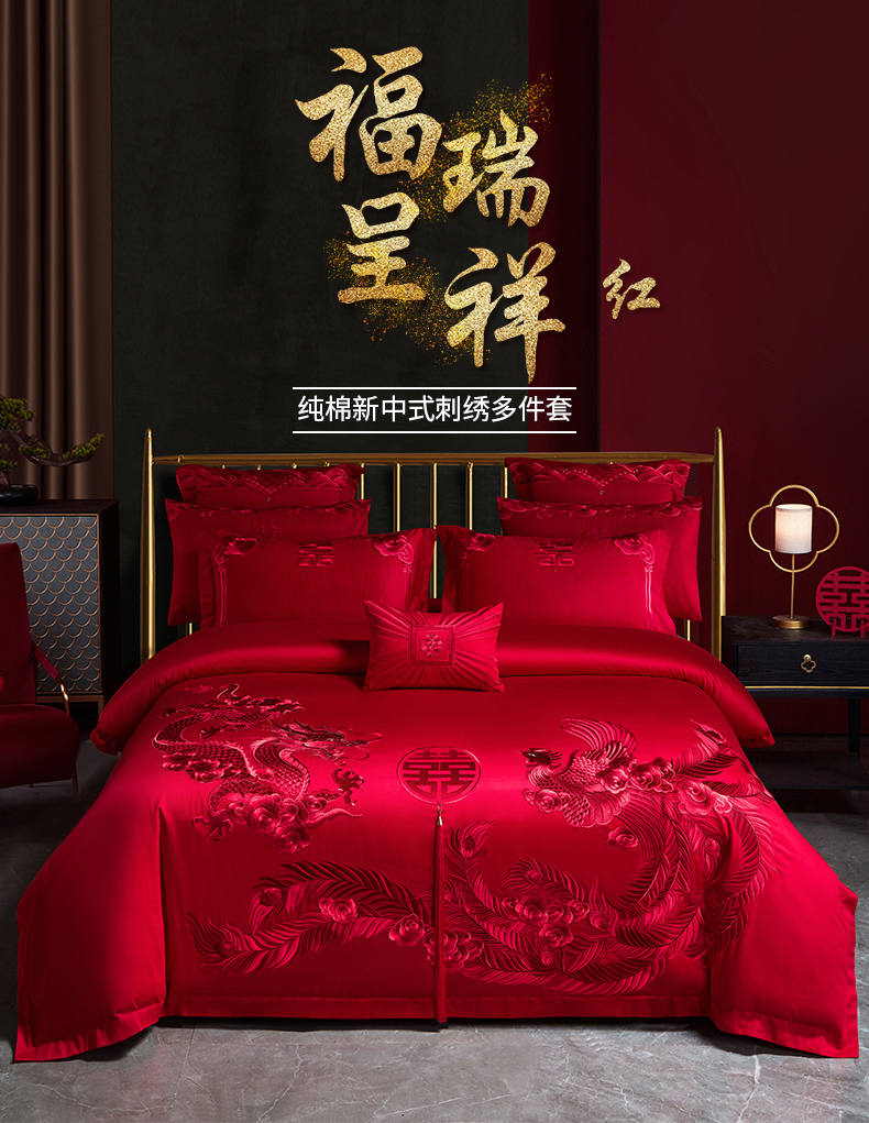 当前位置: 91家纺网 > 商品网购 > 床品套件 > 多件套 > 多件套 > 宏羽纺 2024新款纯棉新中式刺绣婚庆多件套福瑞呈祥-红