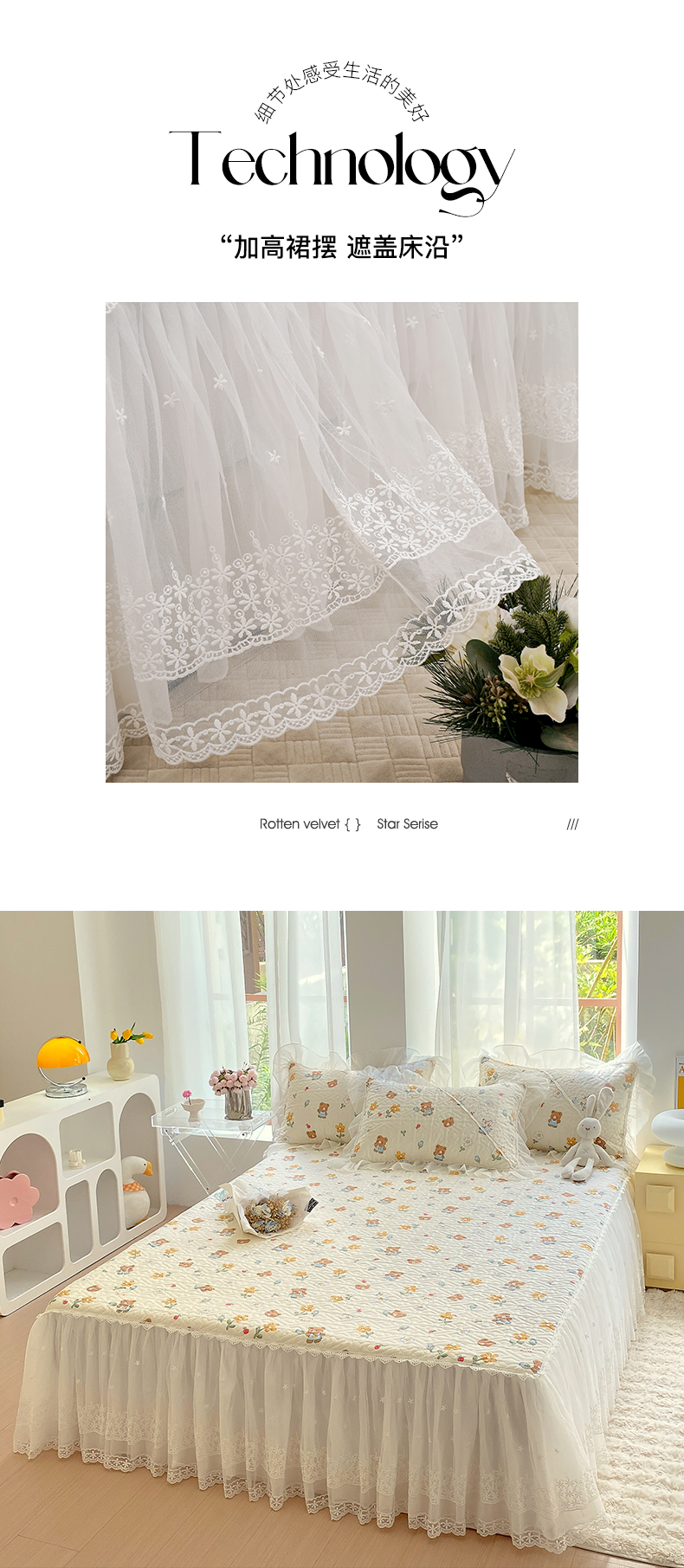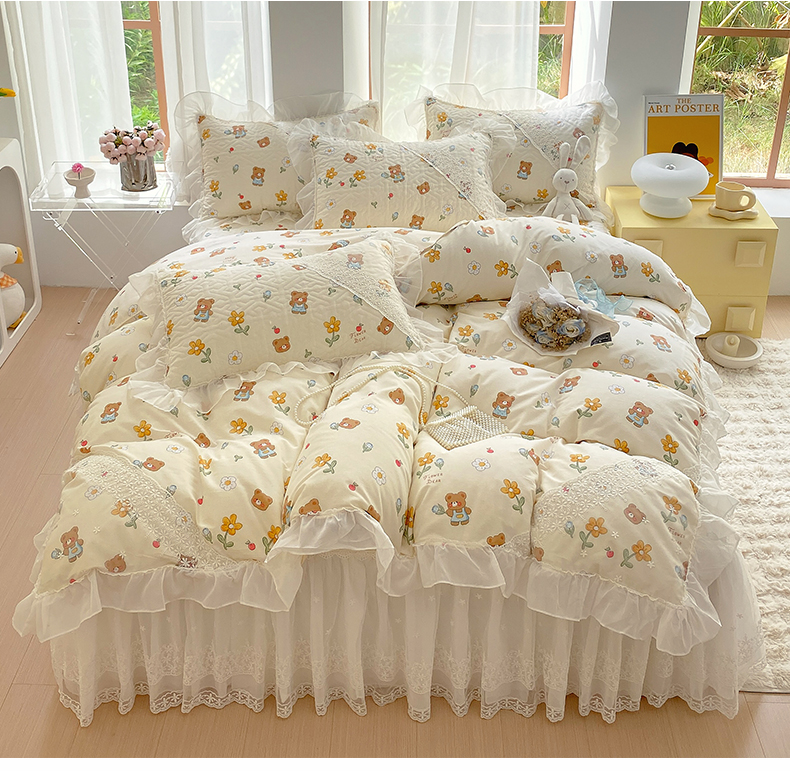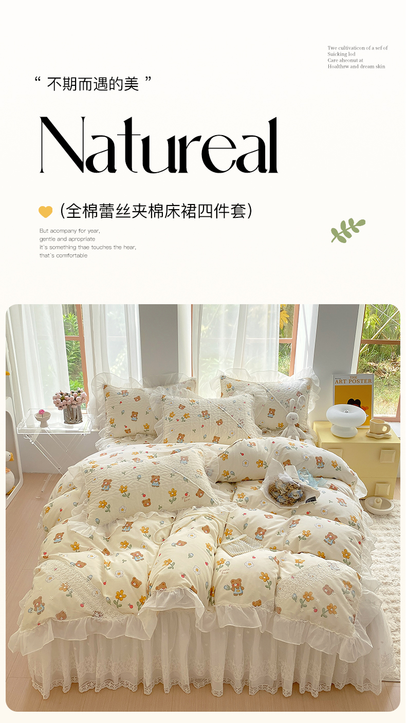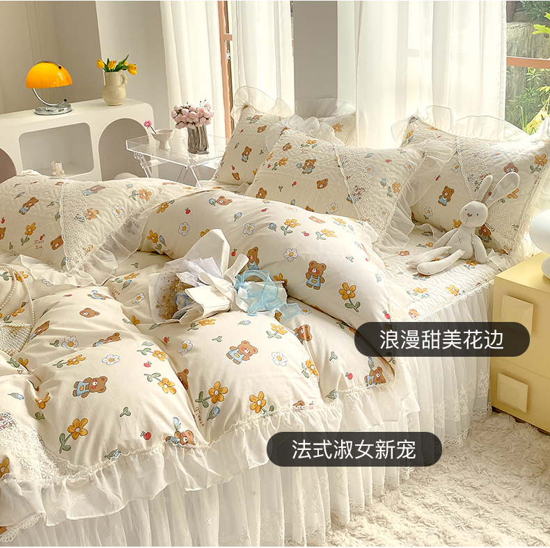 当前位置: 91家纺网 > 商品网购 > 床品套件 > 四件套 > 全棉普通四件套 > 罗艺轩家纺2024新款全棉蕾丝夹棉床裙忆江南系列-四件套 忆江南~安妮小熊