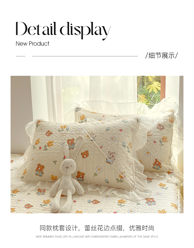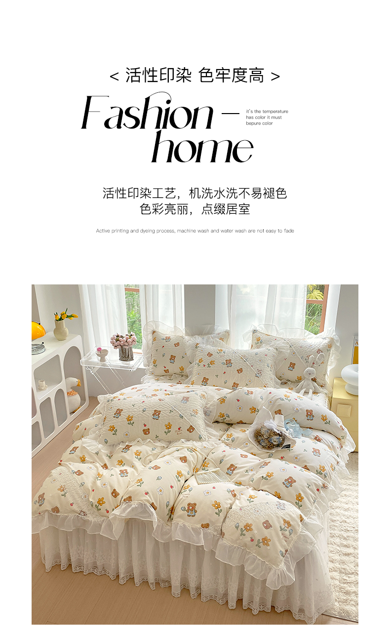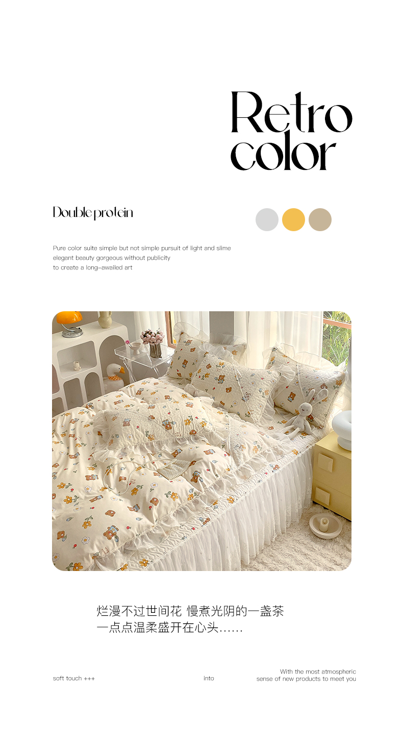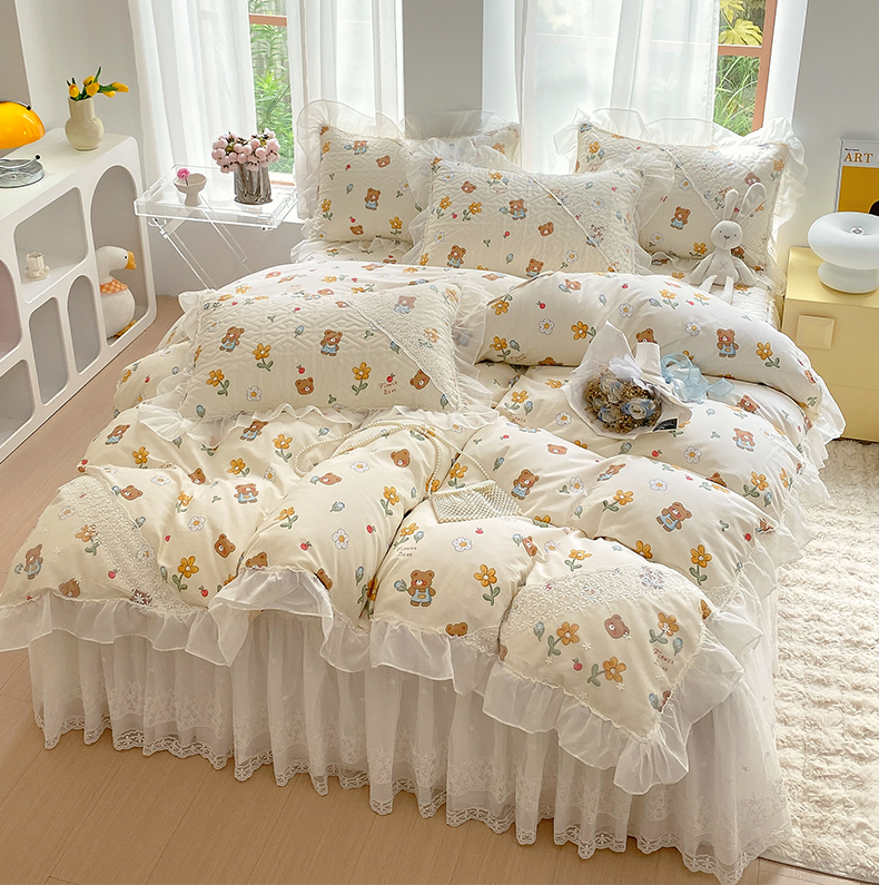 当前位置: 91家纺网 > 商品网购 > 床品套件 > 四件套 > 全棉普通四件套 > 罗艺轩家纺2024新款全棉蕾丝夹棉床裙忆江南系列-四件套 忆江南~安妮小熊