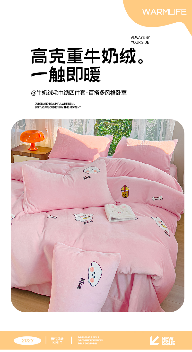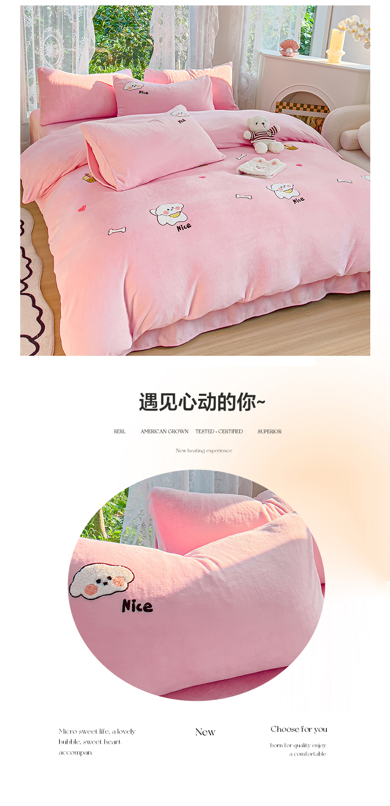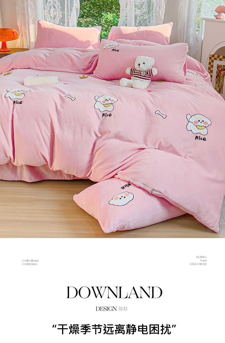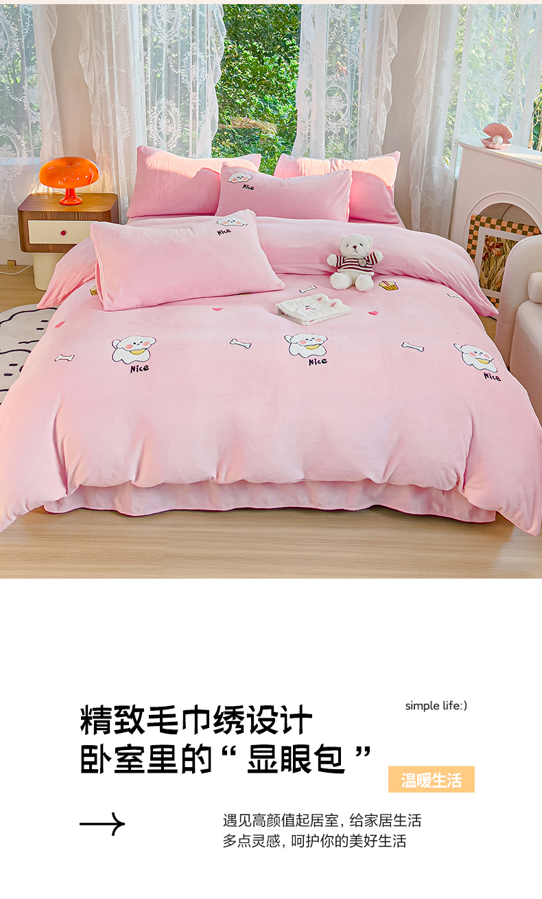 商品名称:米瑞娜 2024新款纯色毛巾绣牛奶绒四件套 皮皮狗-粉