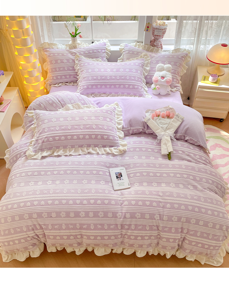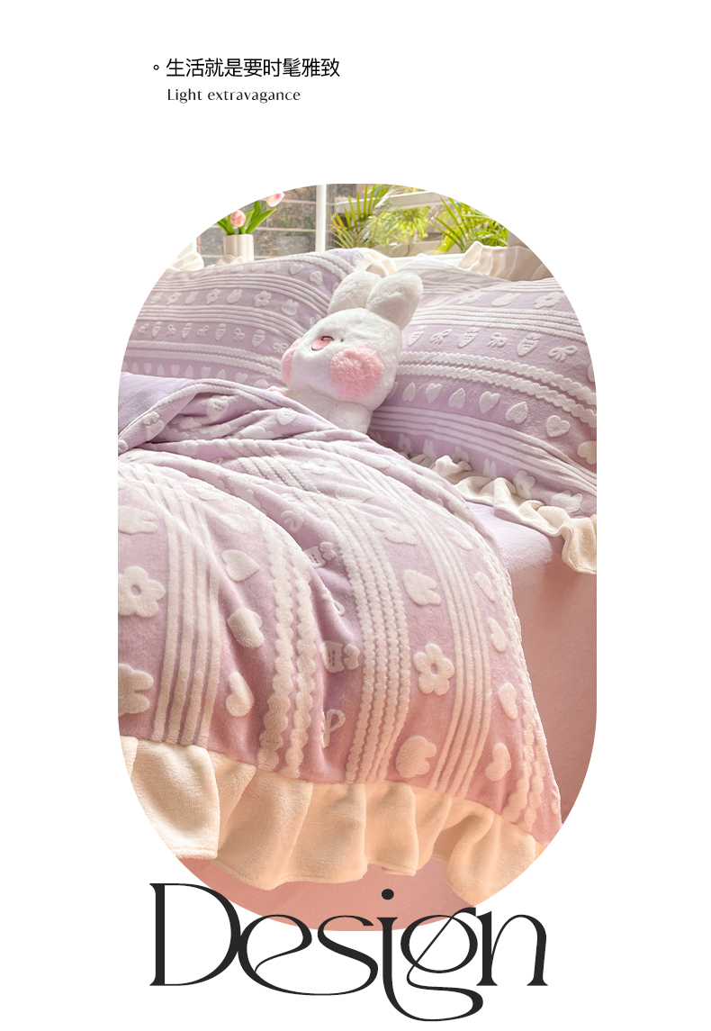 商品名称:如一 2023新款直播荷叶边雕花牛奶绒吊边床单工艺四件套 法莱绒珊瑚绒套件 花季-紫