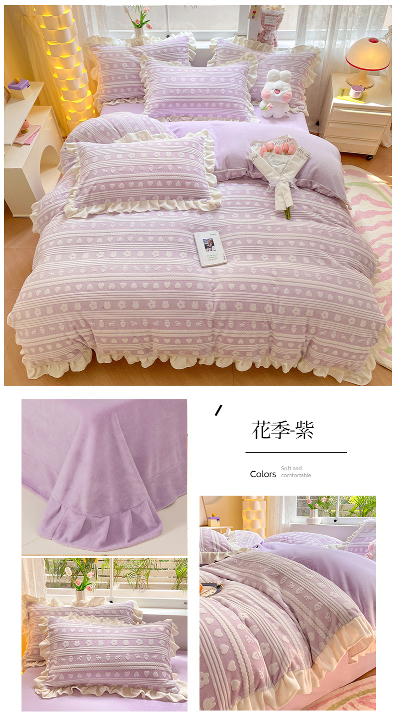 如一 2023新款直播荷叶边雕花牛奶绒吊边床单工艺四件套 法莱绒珊瑚绒套件 花季-紫