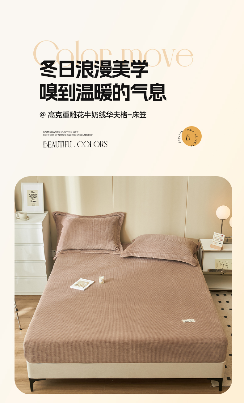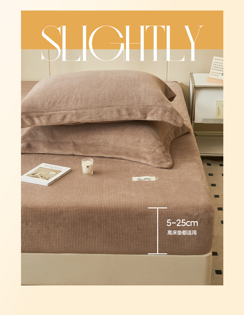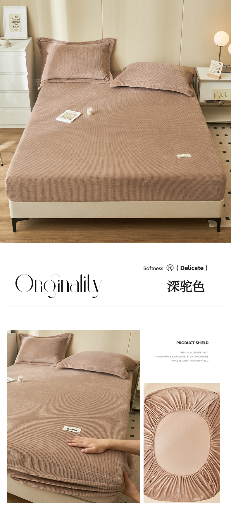 • 91家纺网 家纺一手货源 找家纺 吾诺 2023秋冬 华夫格牛奶绒毯子床单床笠单品系列-牛奶绒床笠 深驼色