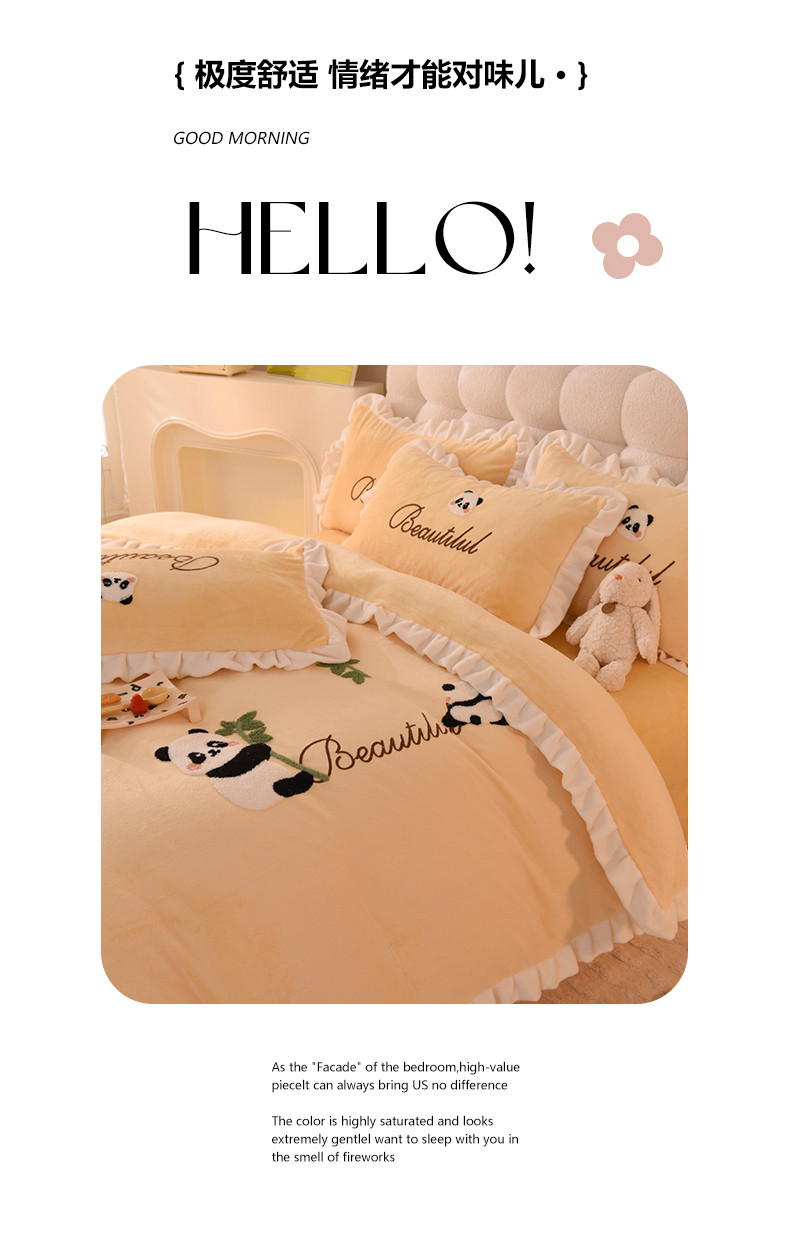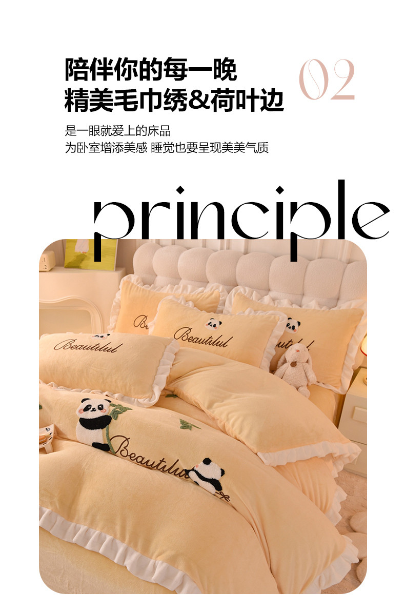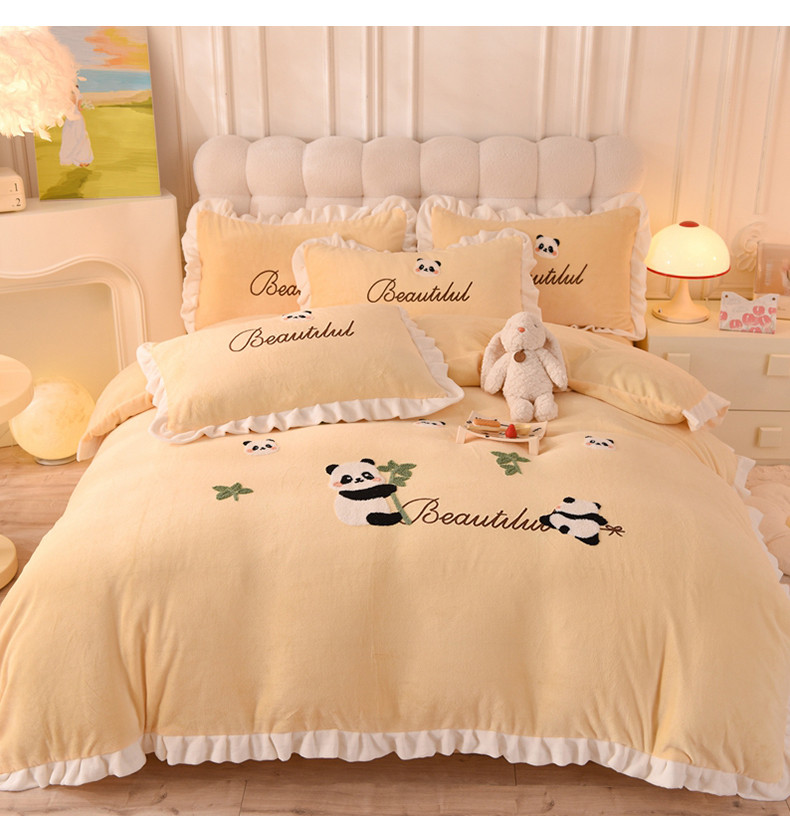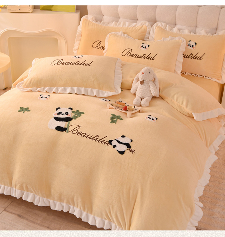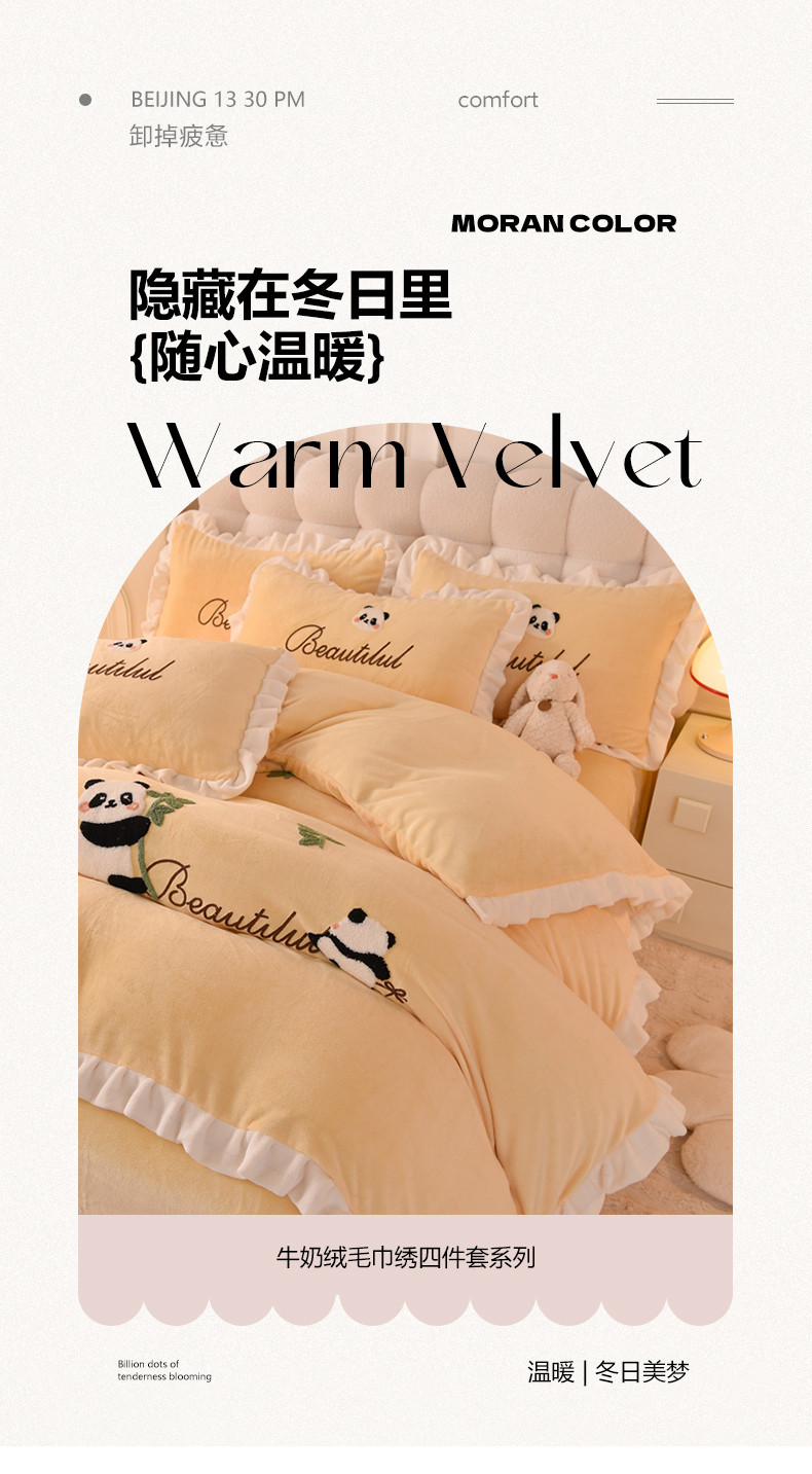 商品名称:菲儿家纺 2023新款牛奶绒毛巾绣四件套 小熊猫-奶黄