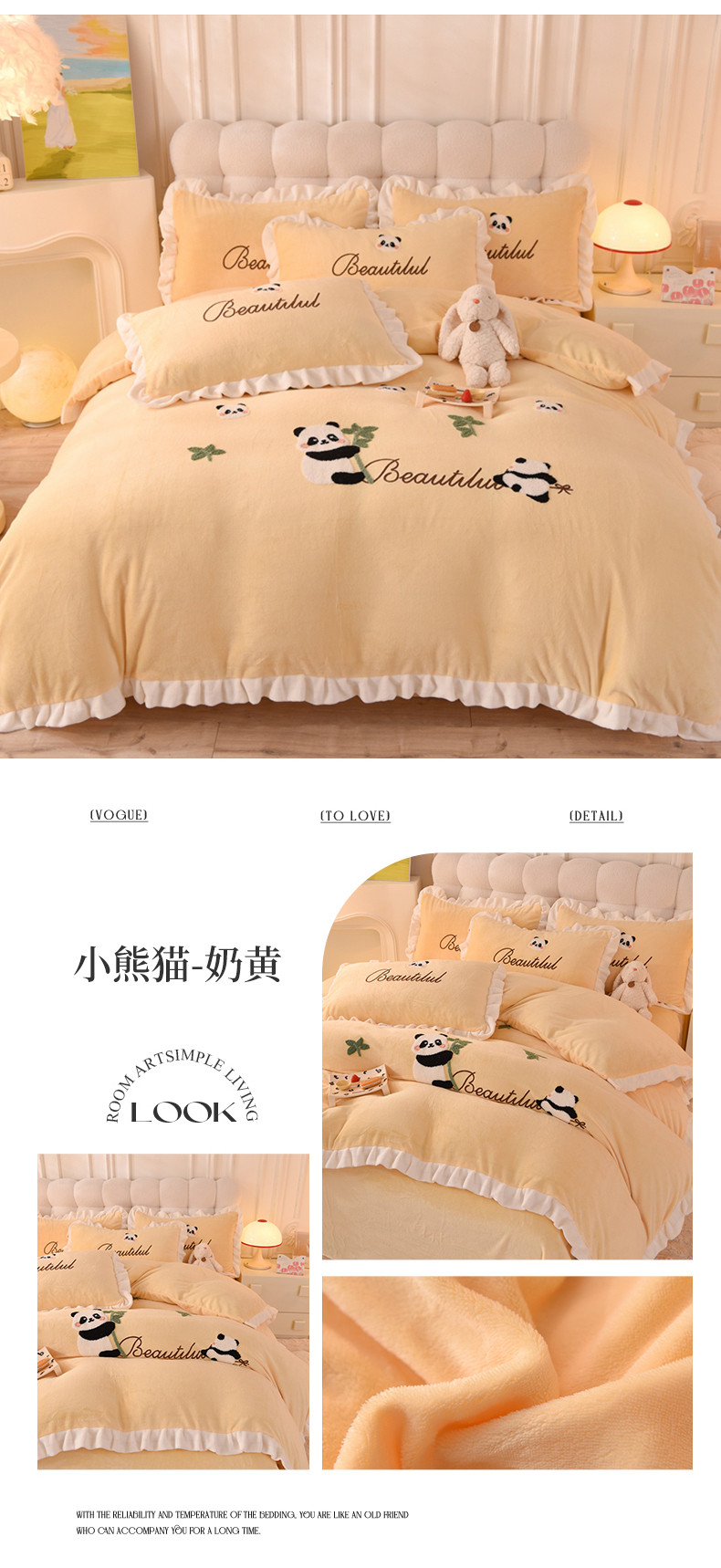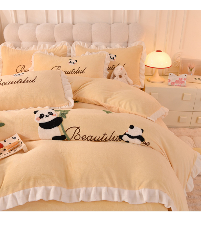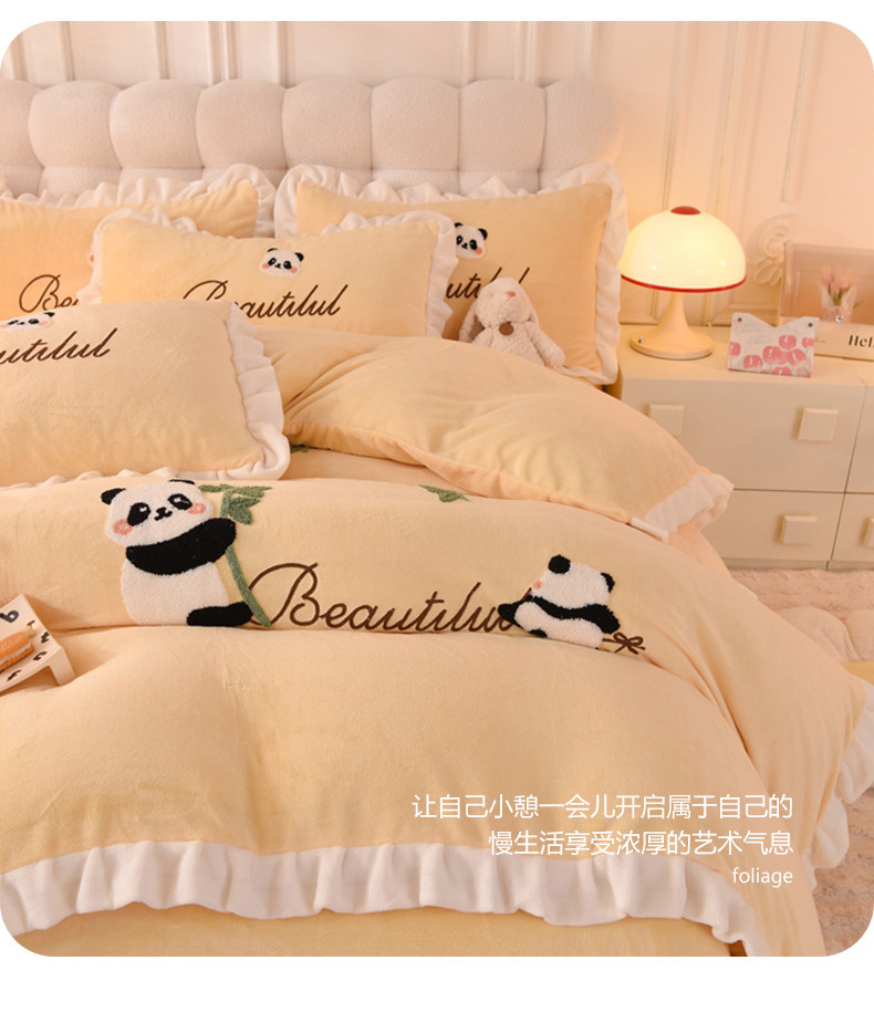 菲儿家纺 2023新款牛奶绒毛巾绣四件套 小熊猫-奶黄