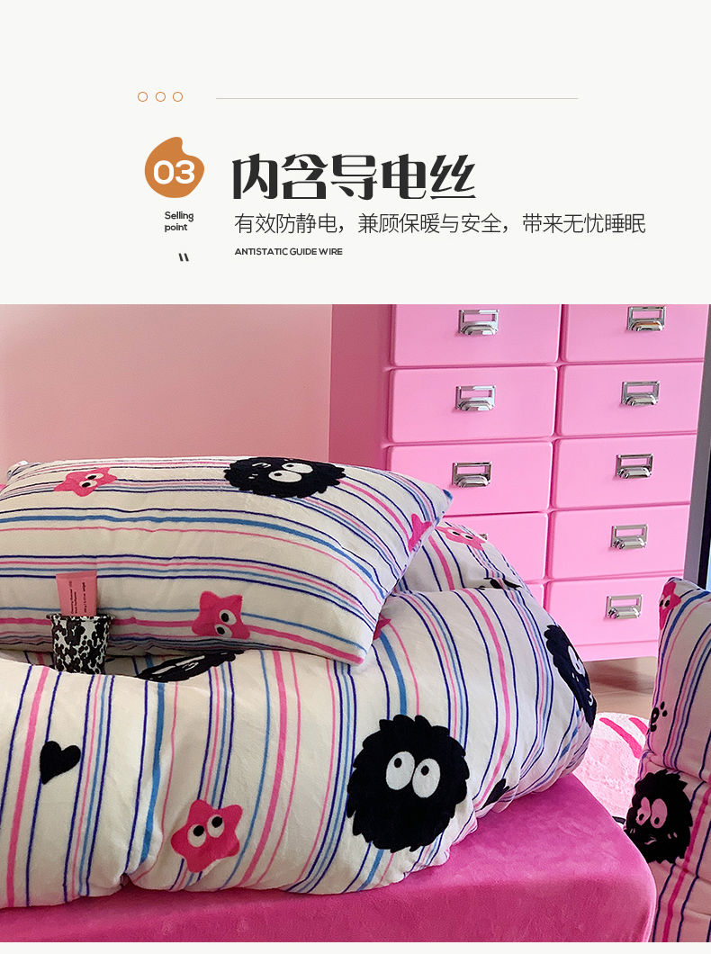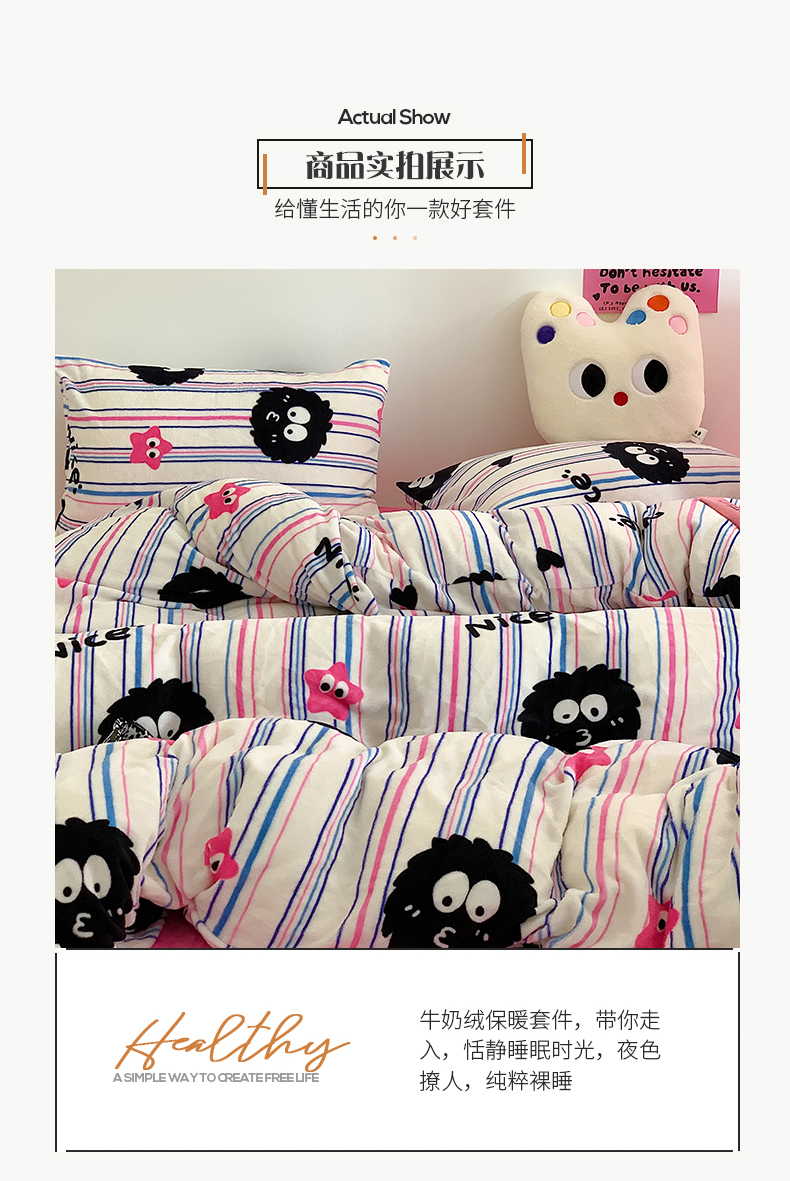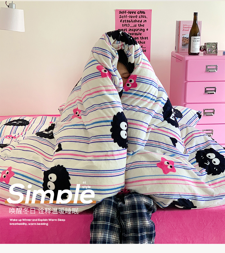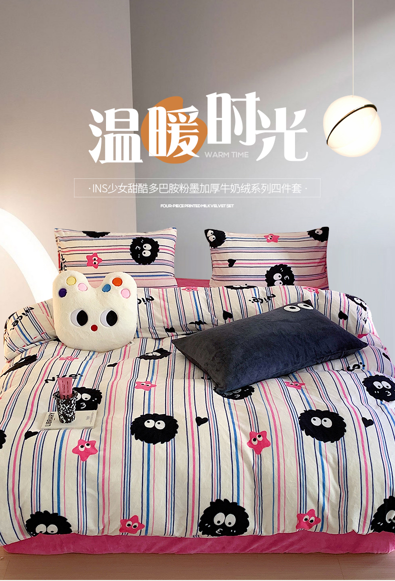 桃子家居 2023新款ins少女甜酷多巴胺粉墨加厚牛奶绒系列四件套 绒-条纹毛球