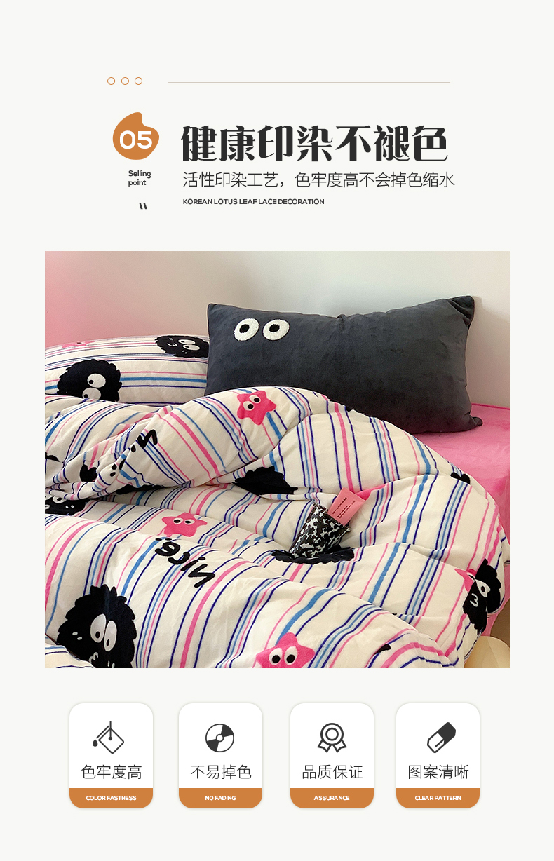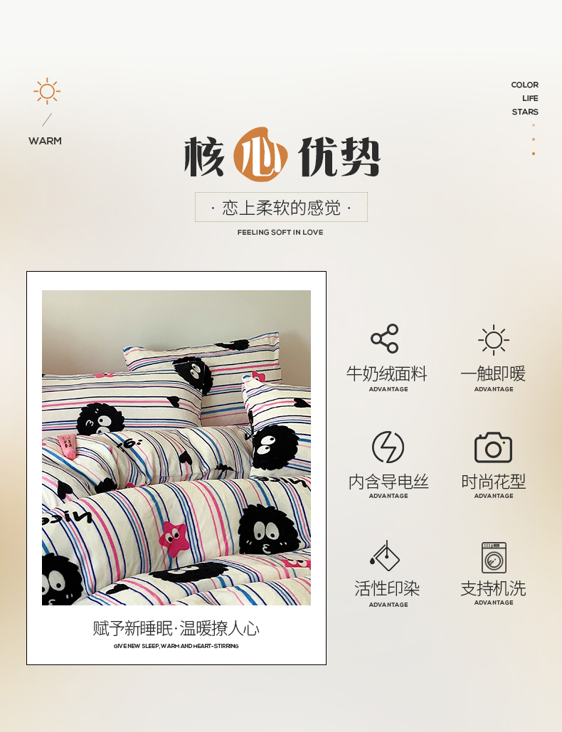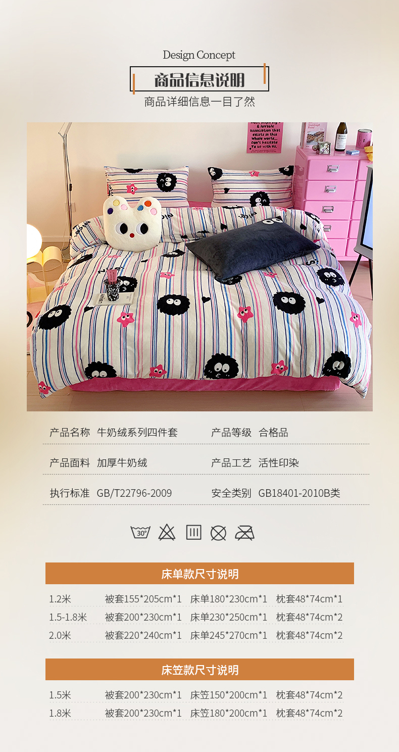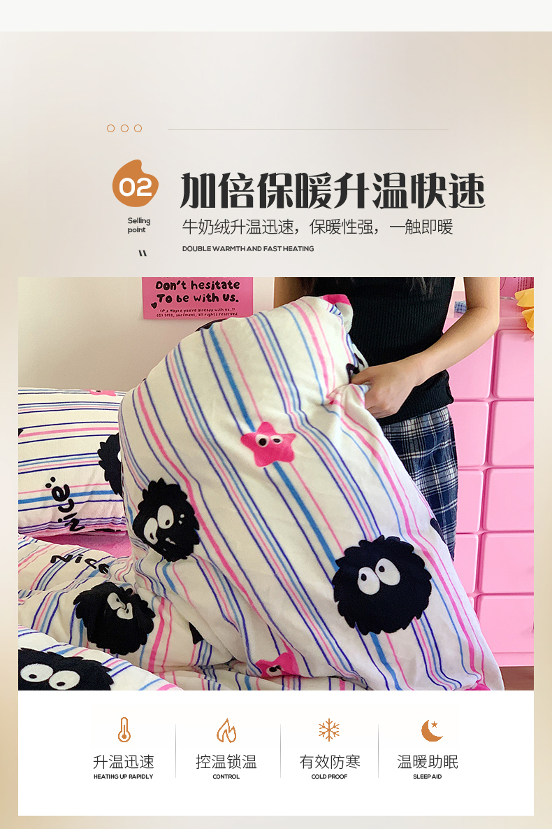 桃子家居 2023新款ins少女甜酷多巴胺粉墨加厚牛奶绒系列四件套 绒-条纹毛球