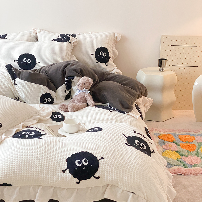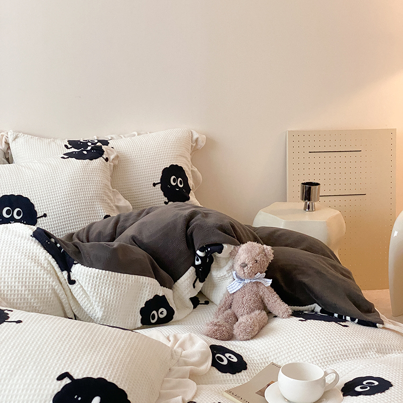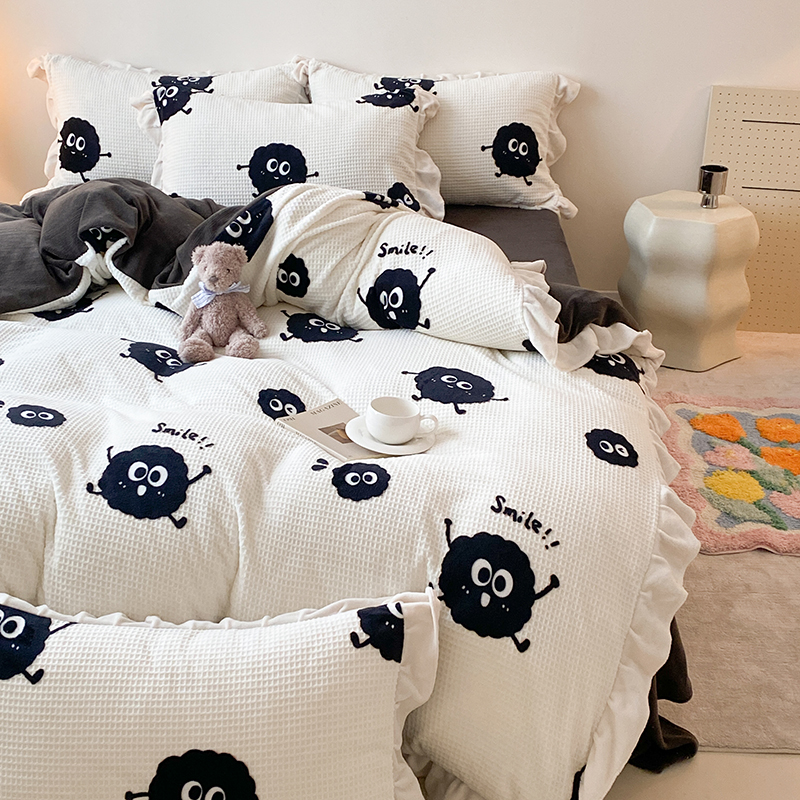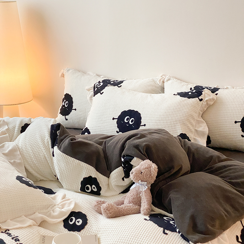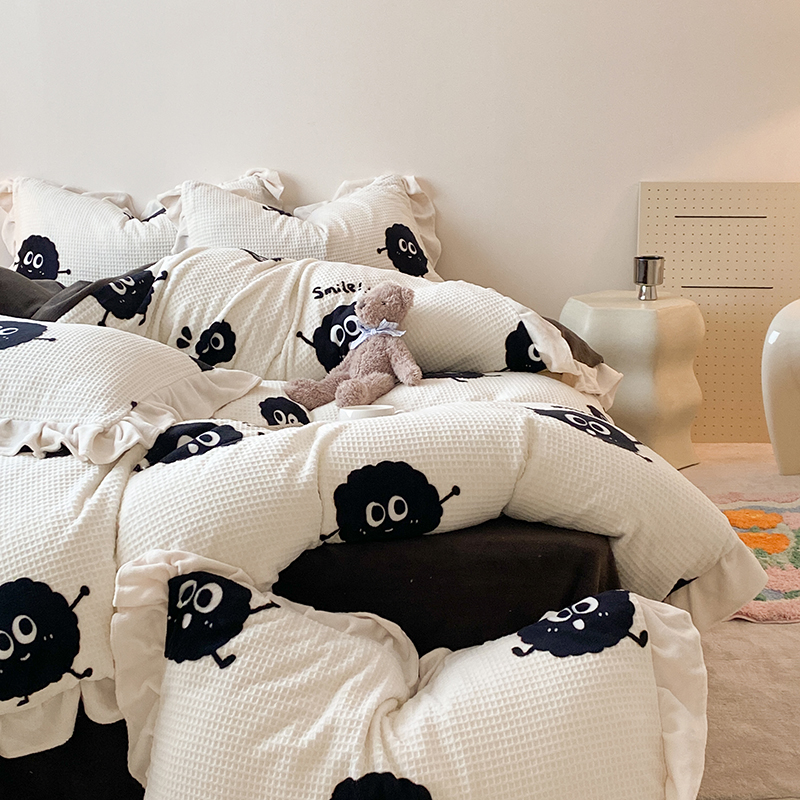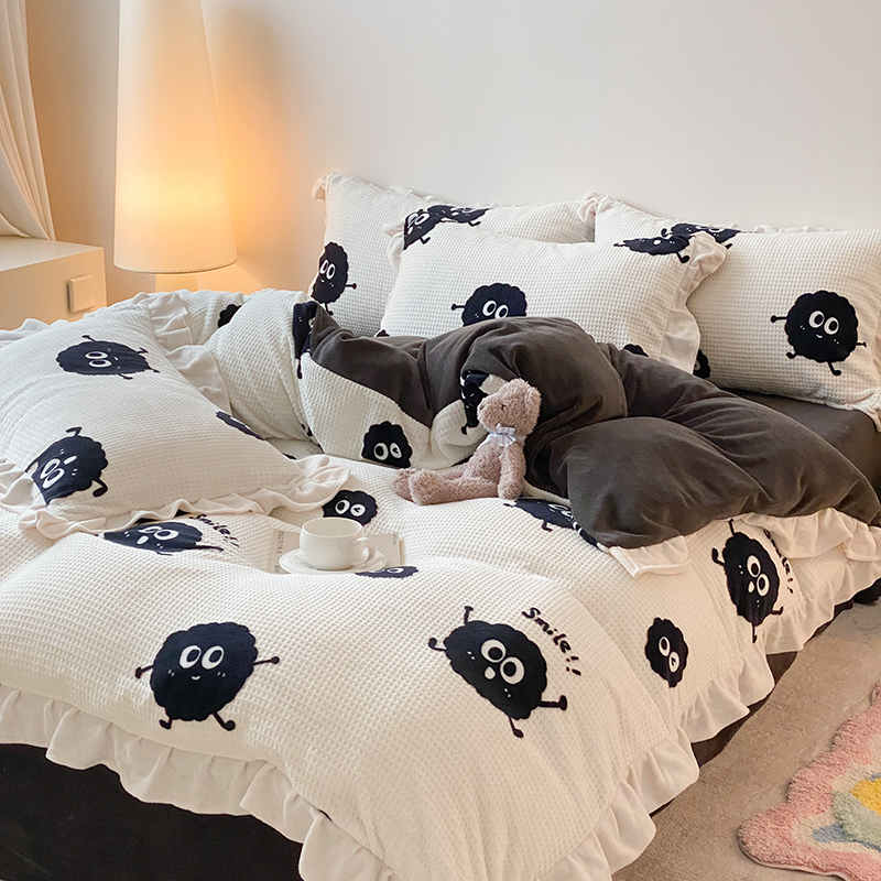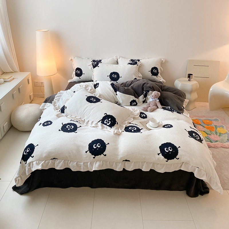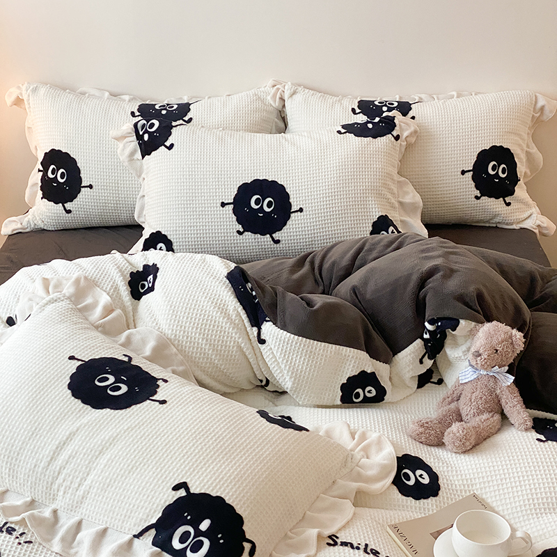 潘朵拉家纺 2023新款雕花韩式华夫格花边牛奶绒四件套 球球精灵