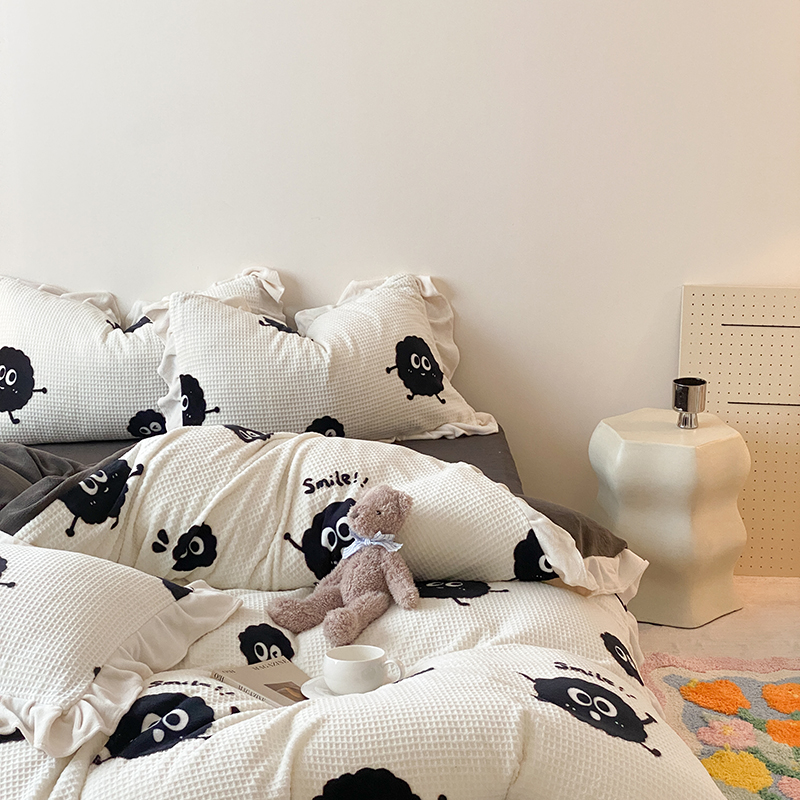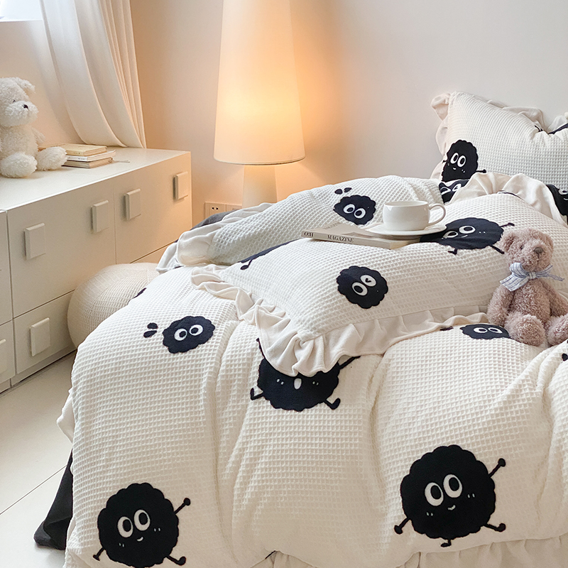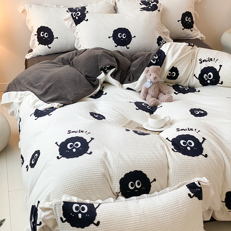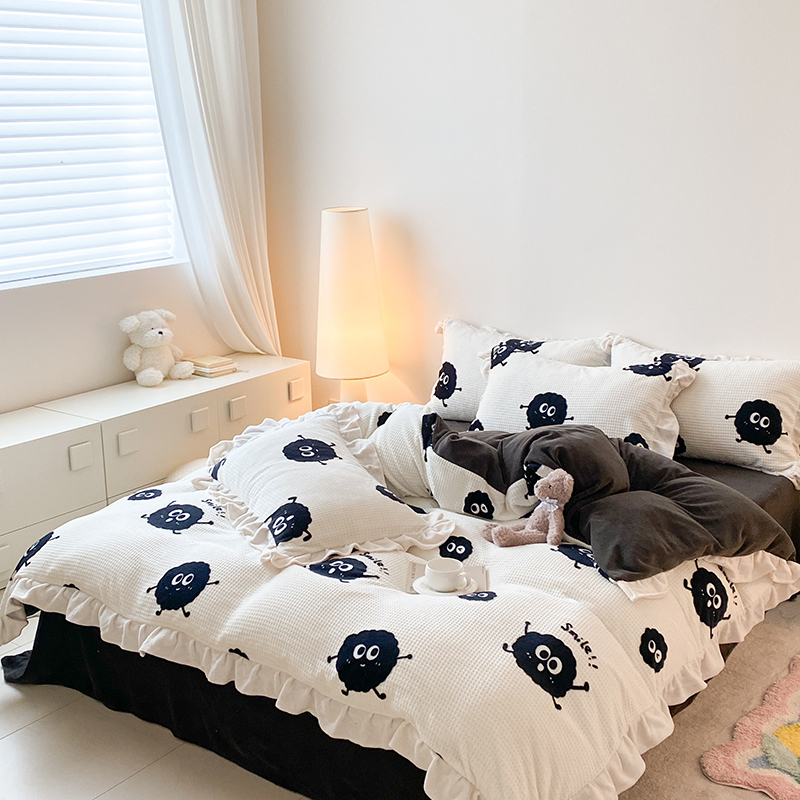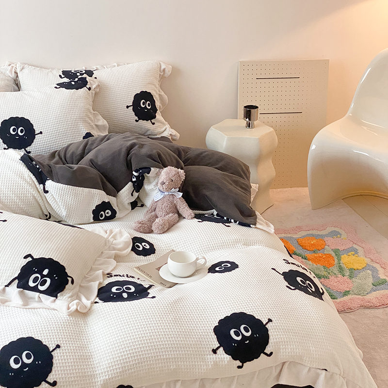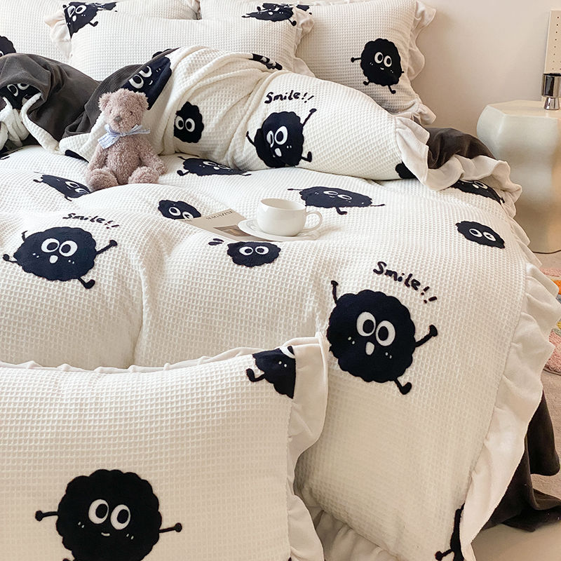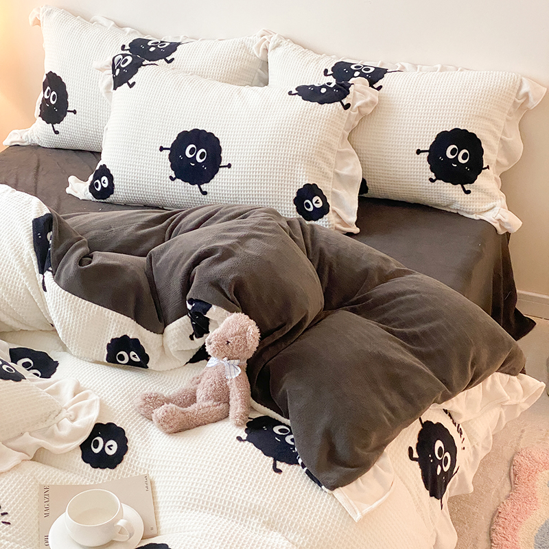 潘朵拉家纺 2023新款雕花韩式华夫格花边牛奶绒四件套 球球精灵