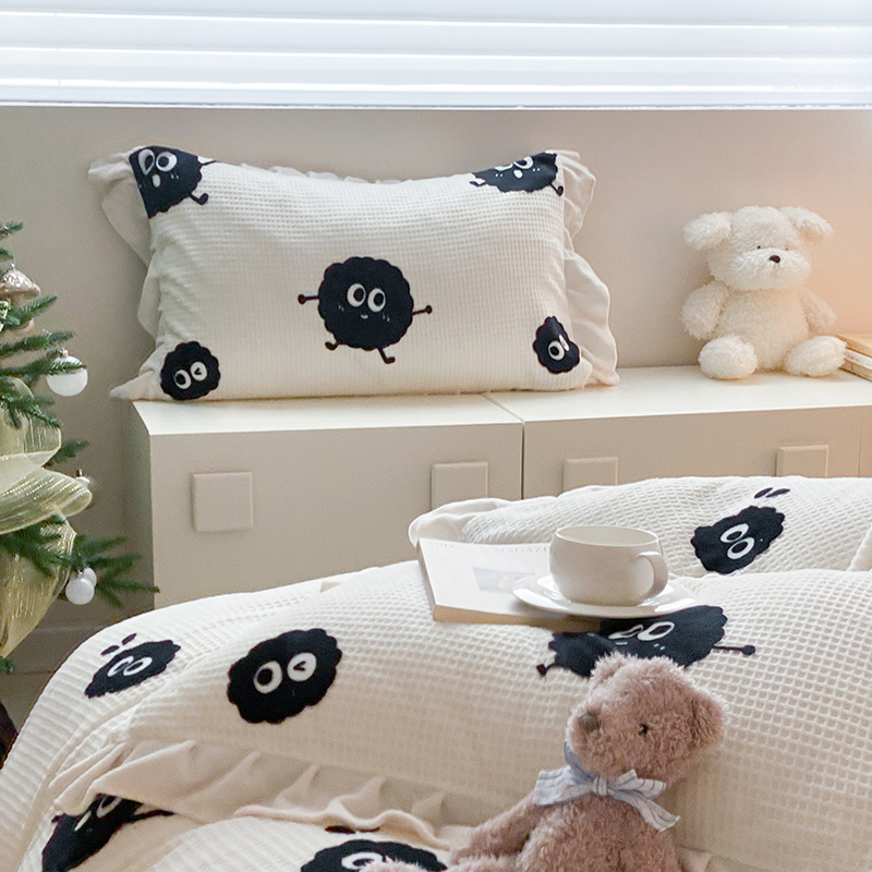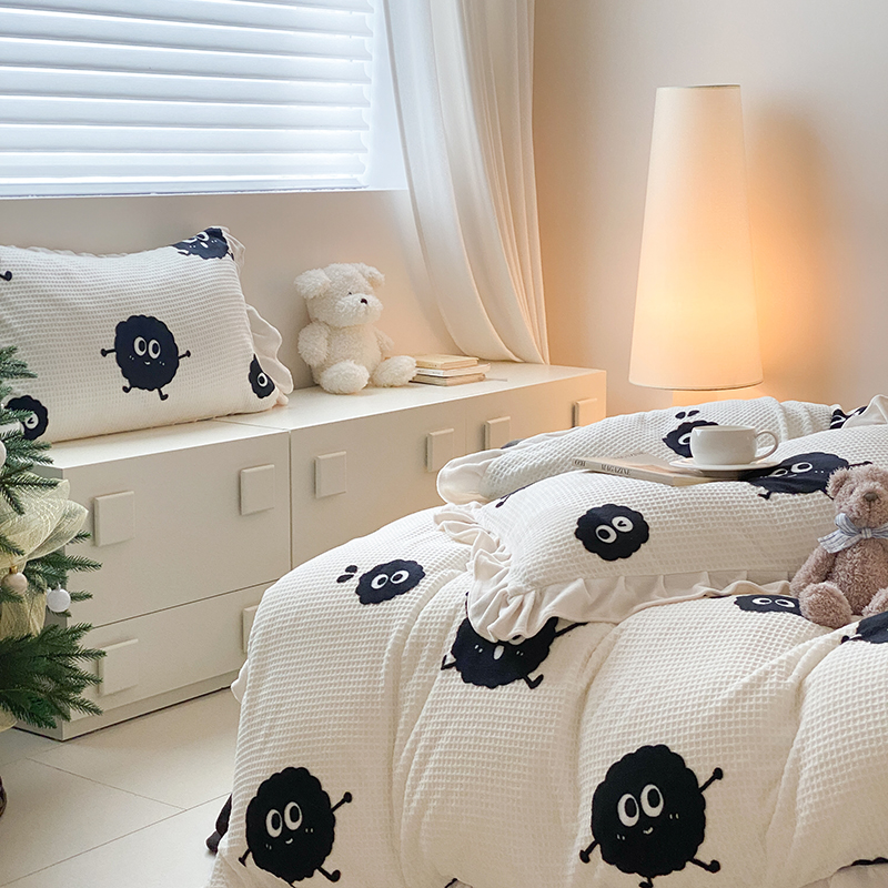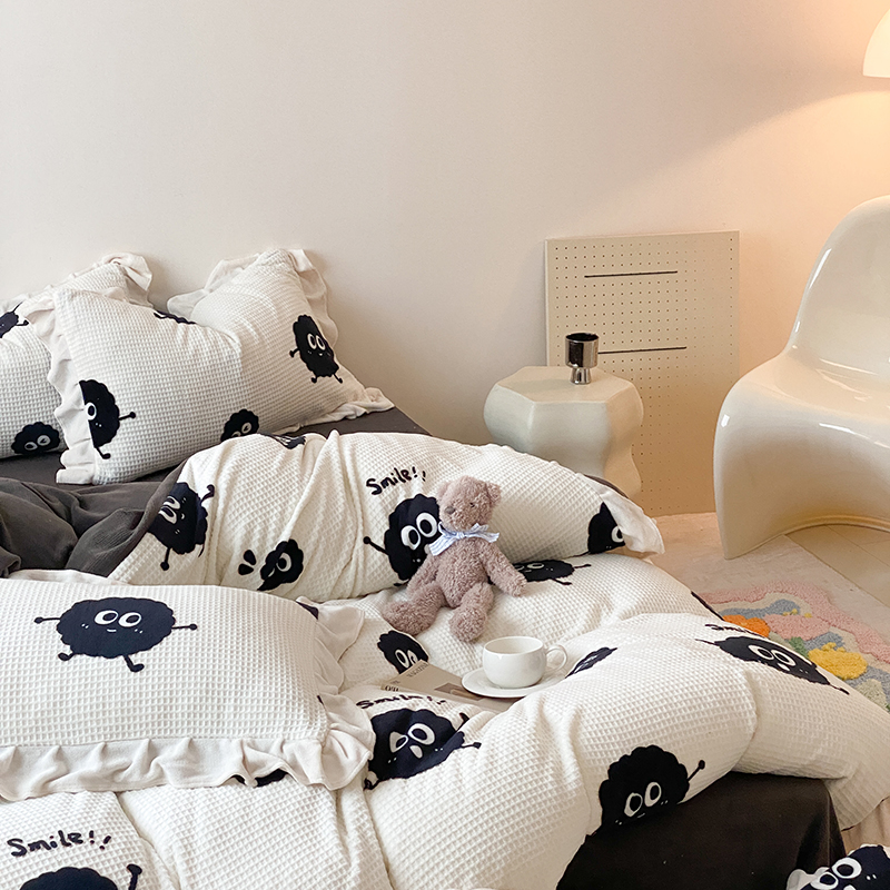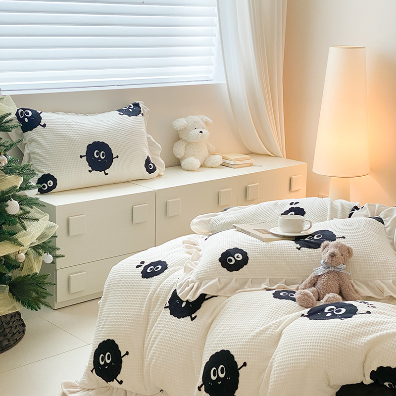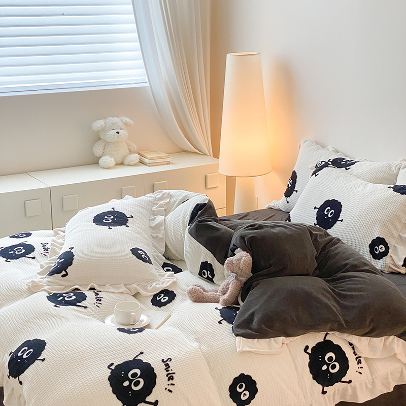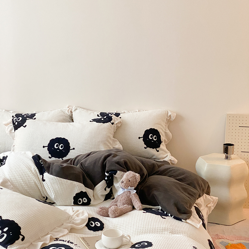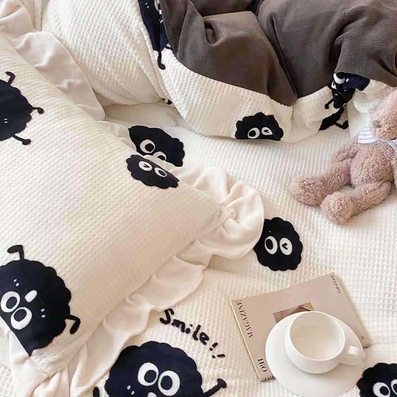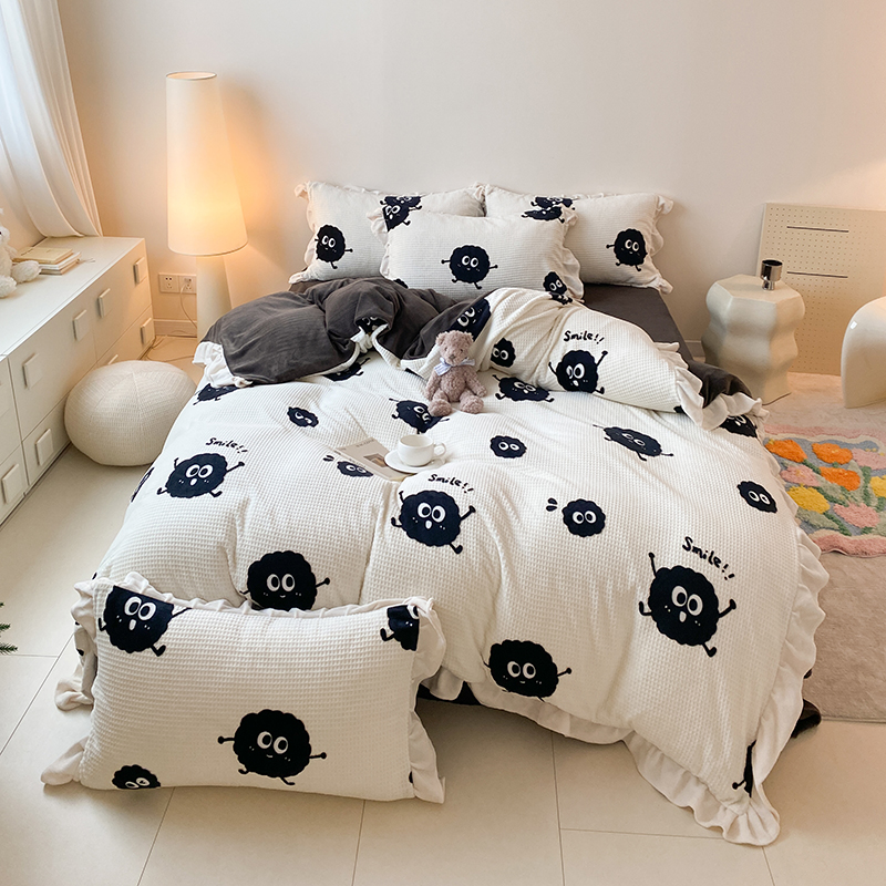 潘朵拉家纺 2023新款雕花韩式华夫格花边牛奶绒四件套 球球精灵