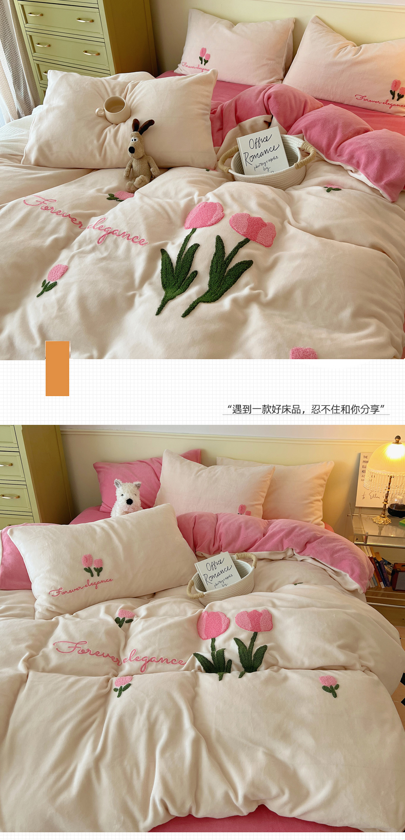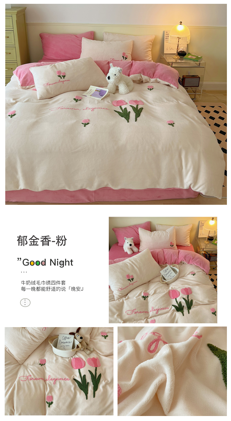 商品名称:三朵家纺 2023新款高克重牛奶绒毛巾绣绣花四件套 郁金香-粉