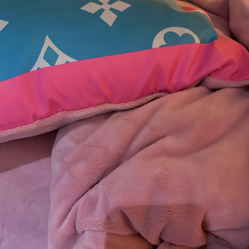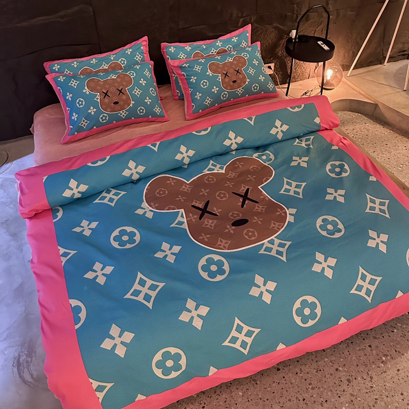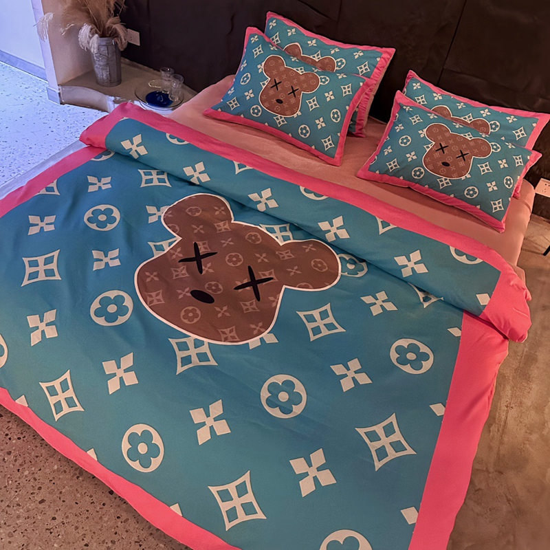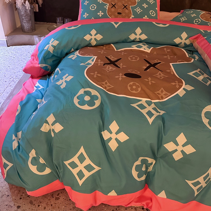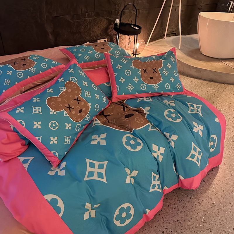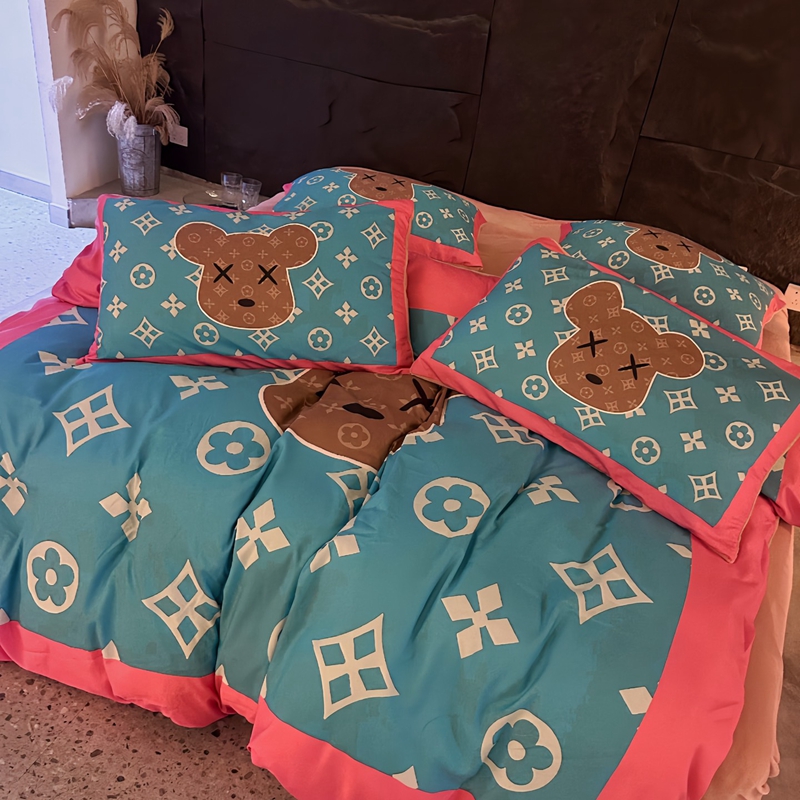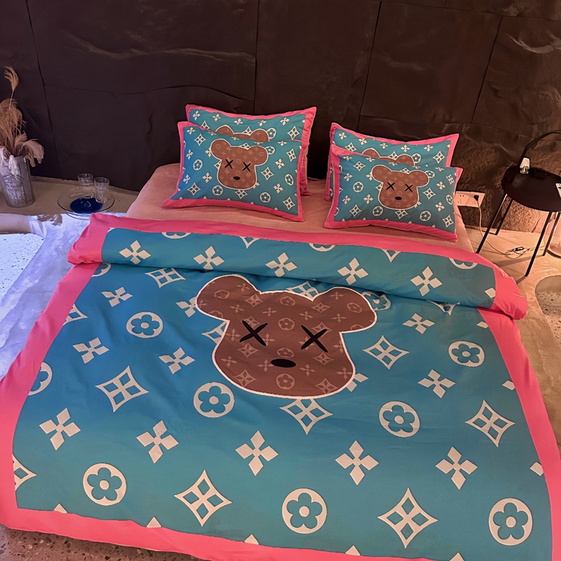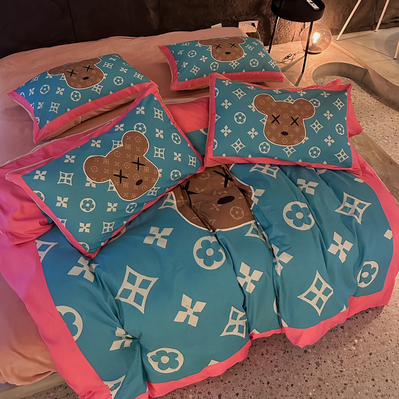 商品名称:色鬼 2023新款轻奢潮牌大牌风棉加绒四件套印花牛奶绒四件套 湖蓝熊