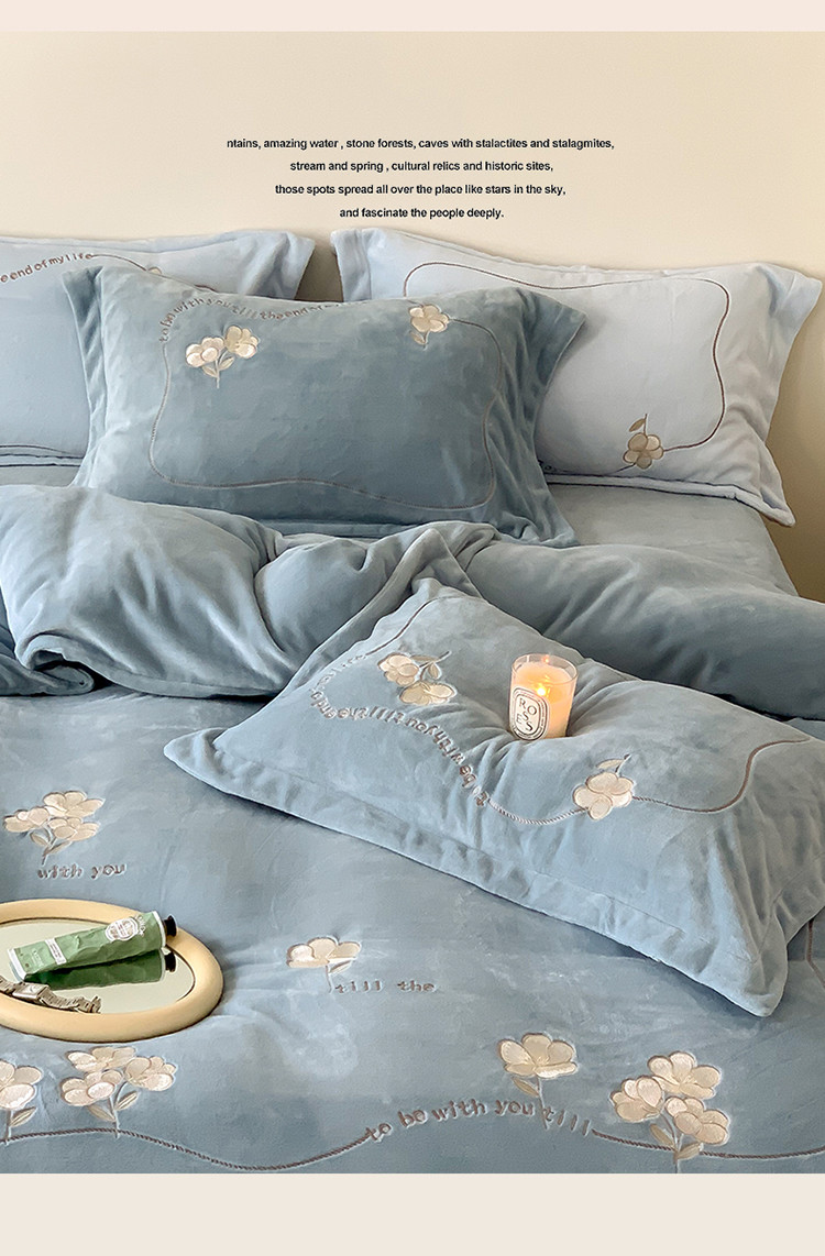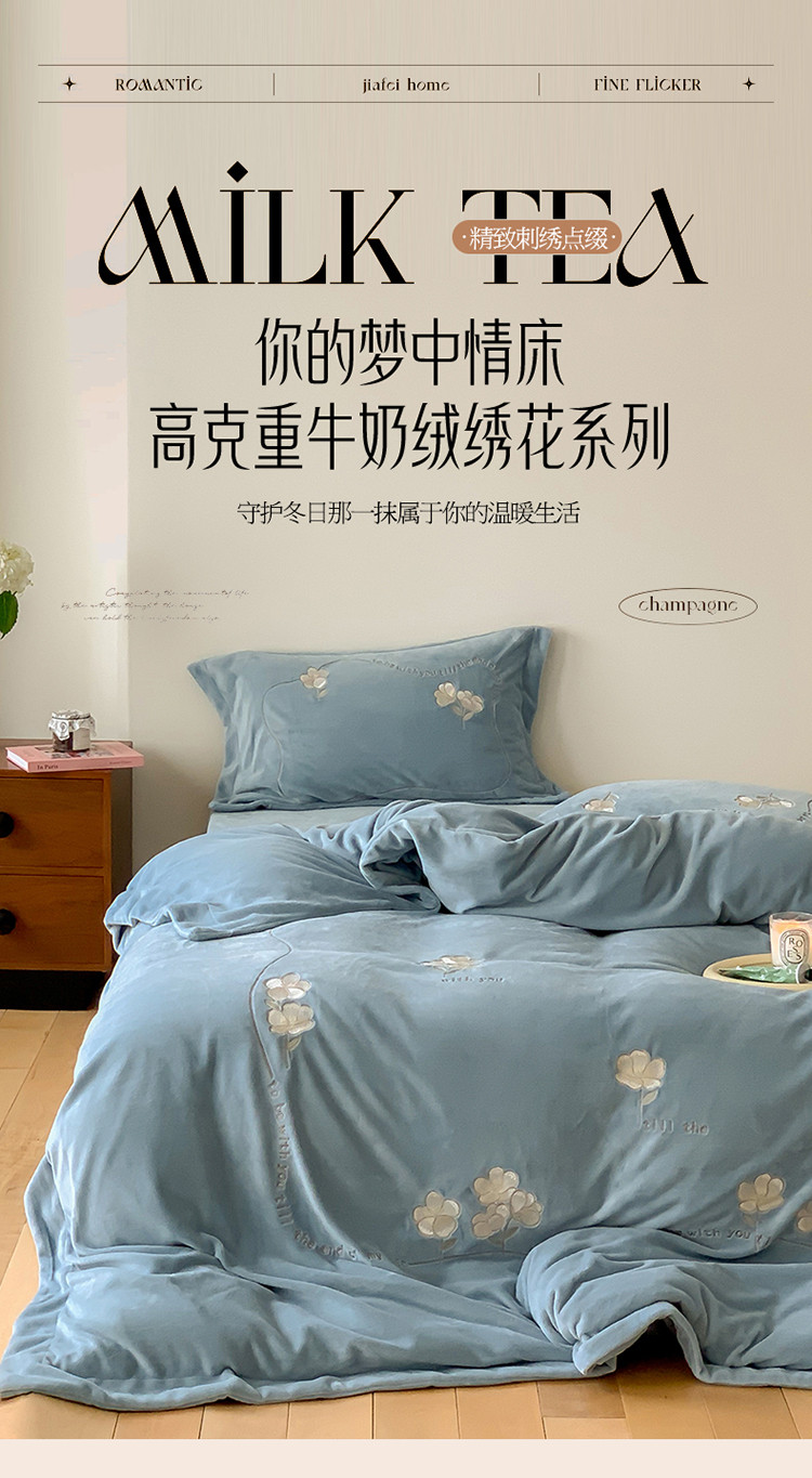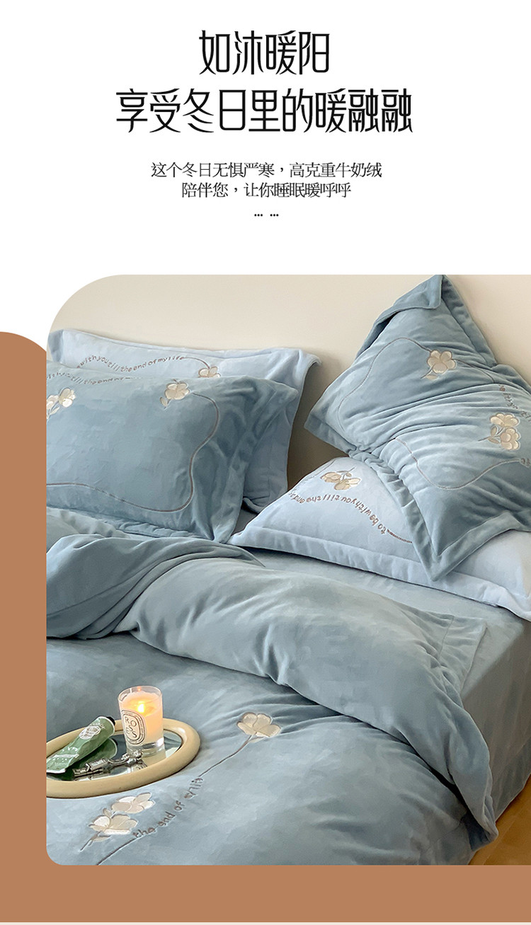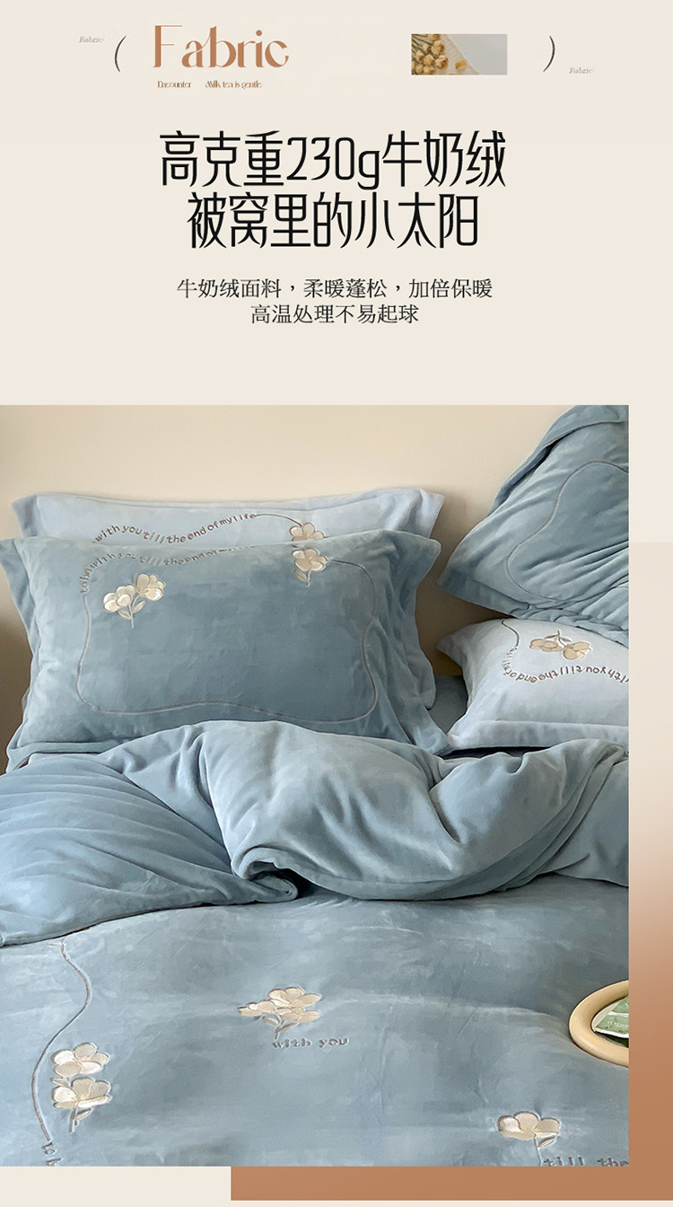 名品优仓 2023新款高克重230克牛奶绒绣花款四件套-小时光 小时光-湖蓝