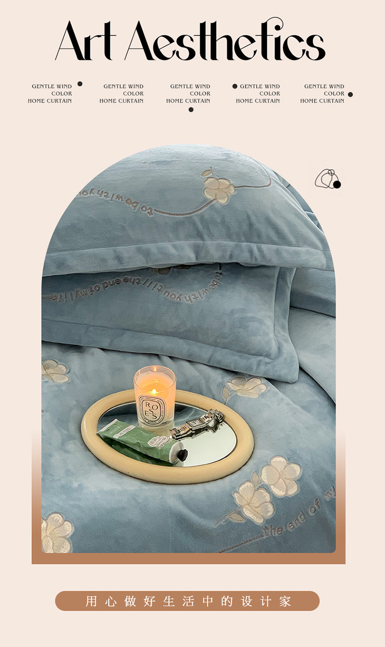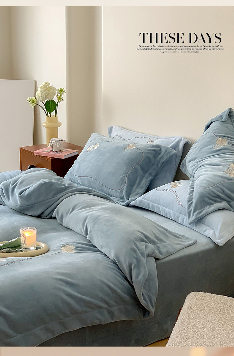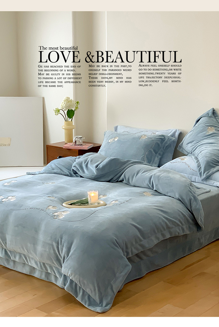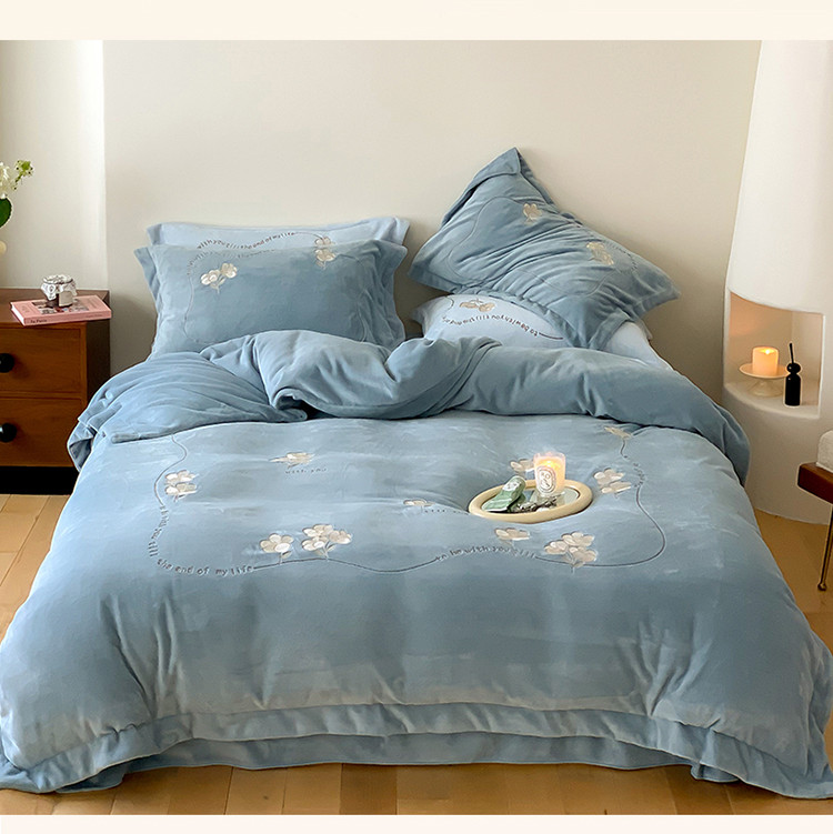 名品优仓 2023新款高克重230克牛奶绒绣花款四件套-小时光 小时光-湖蓝