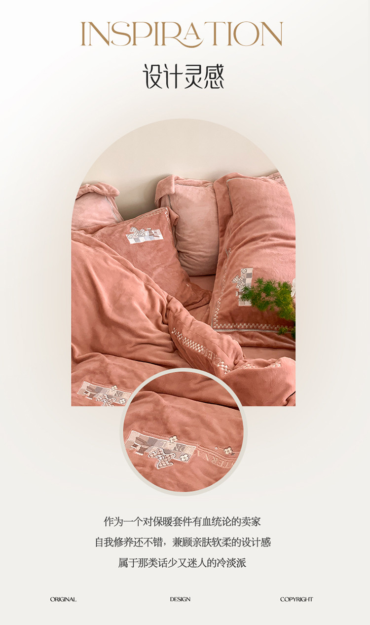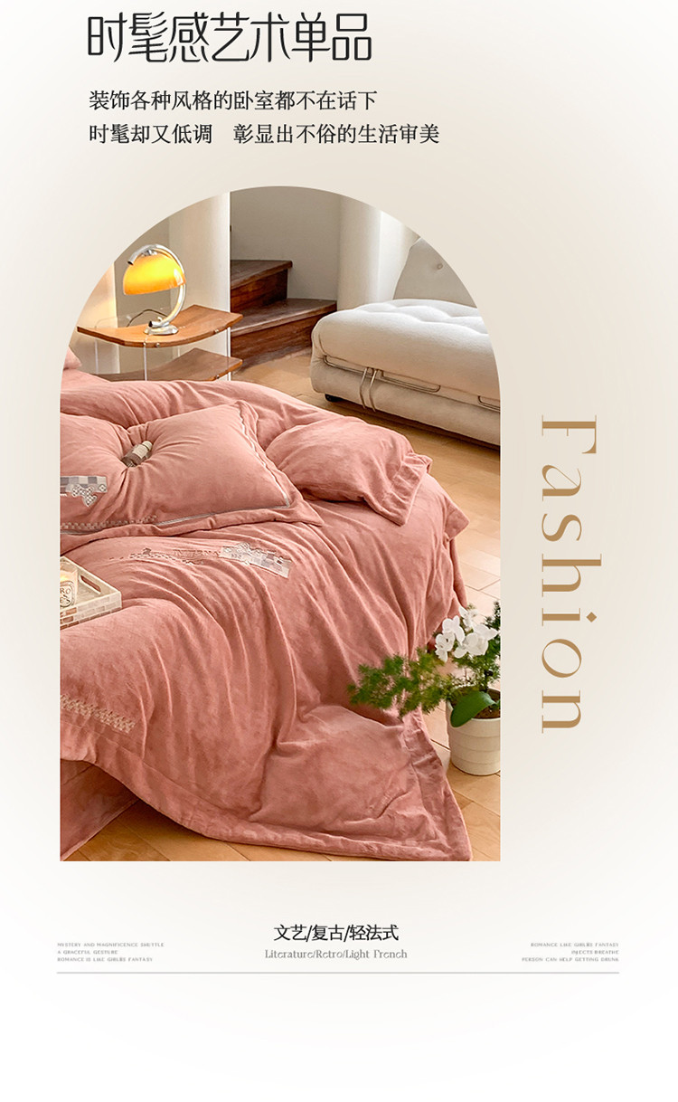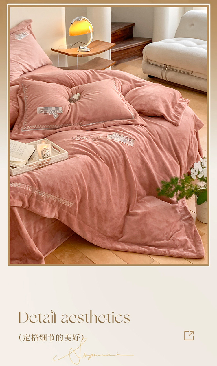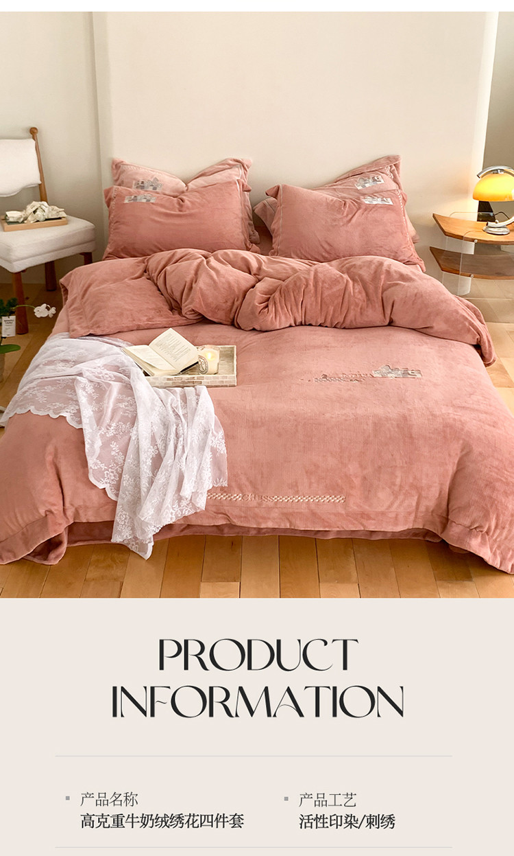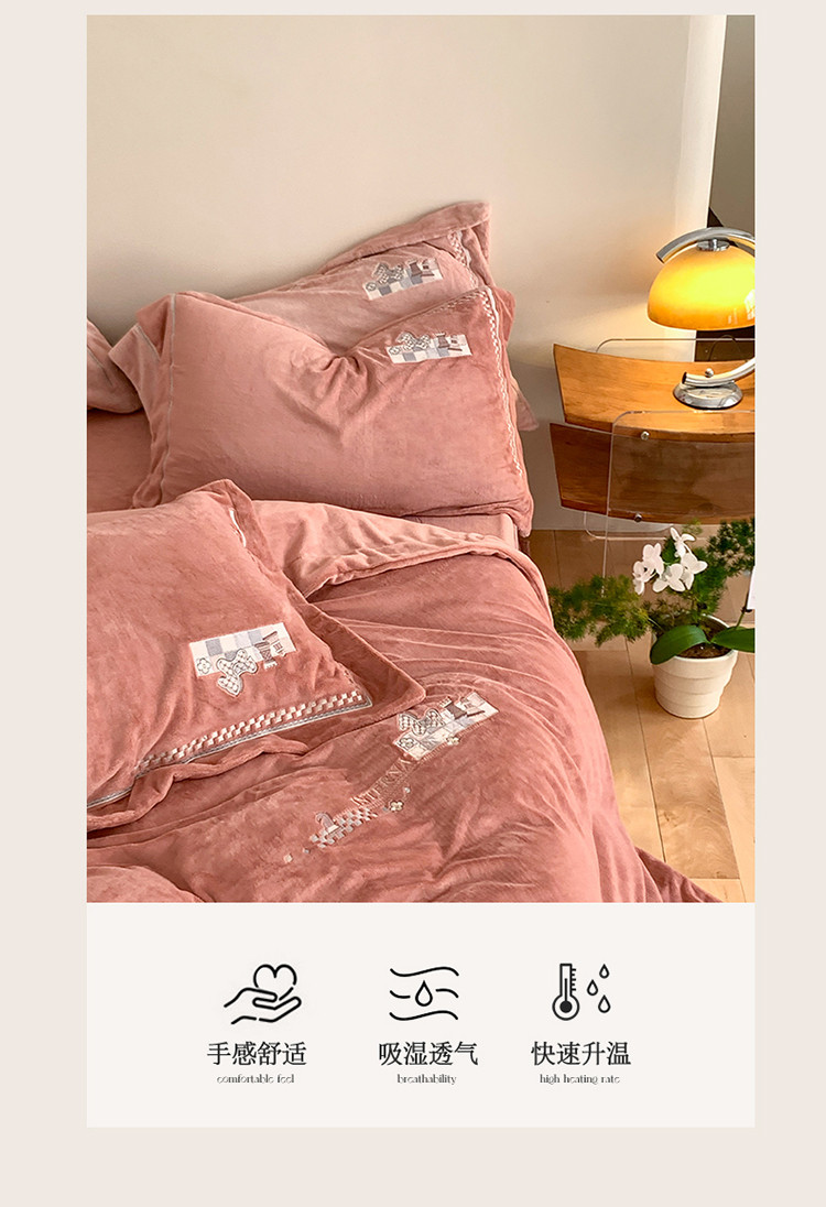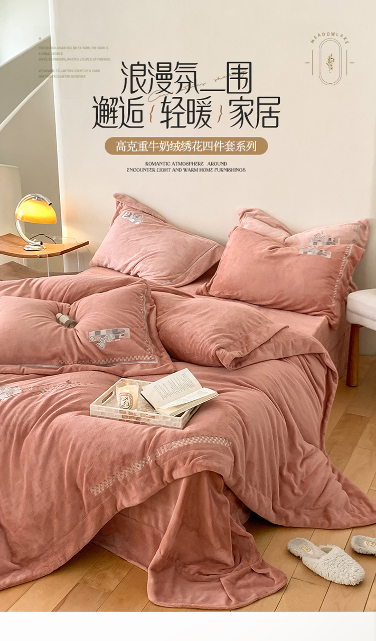 名品优仓 2023新款高克重230克牛奶绒绣花款四件套-极简 极简-仲夏粉