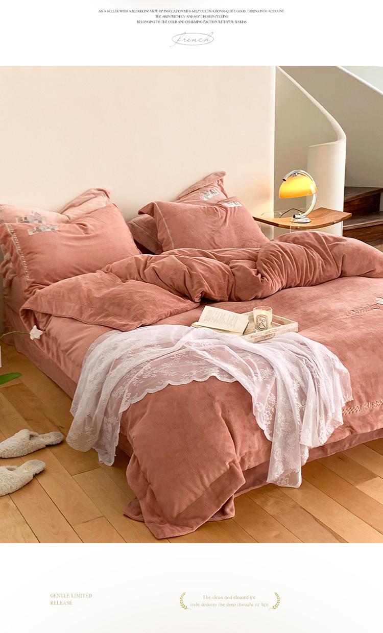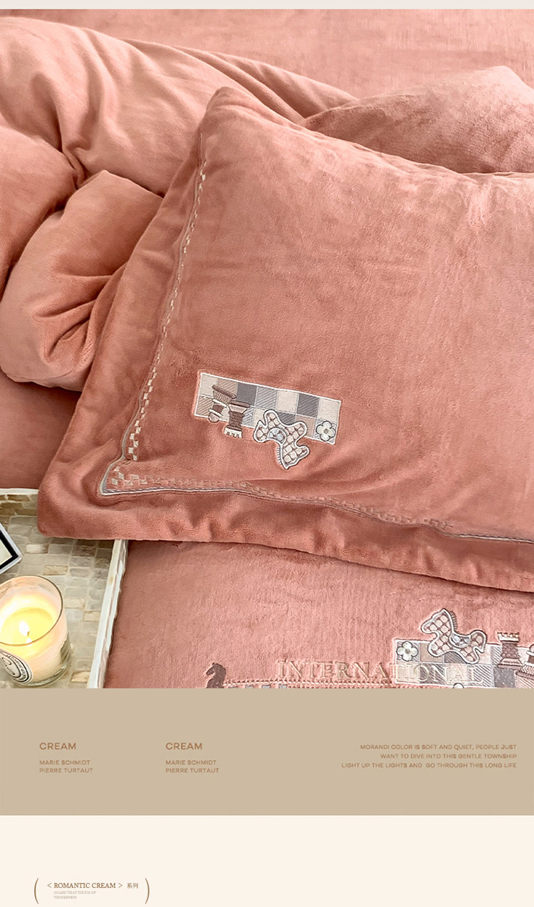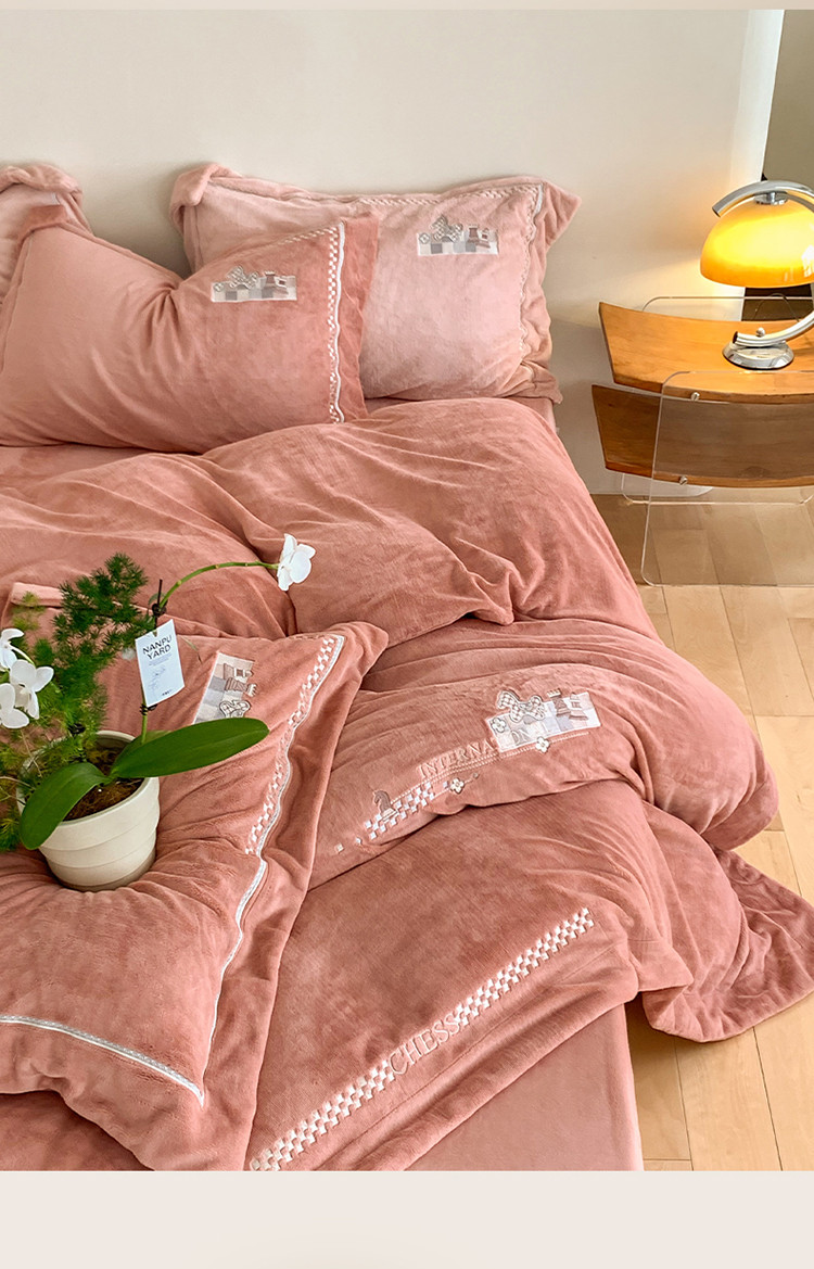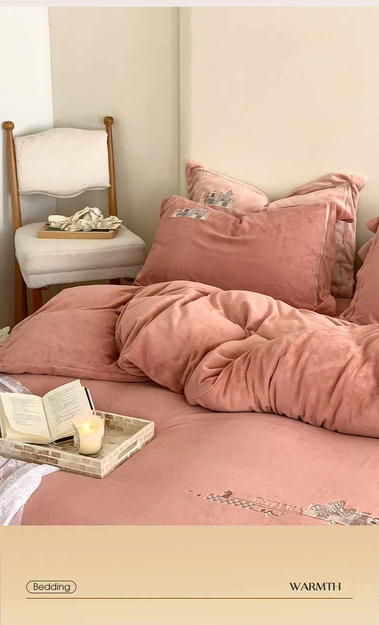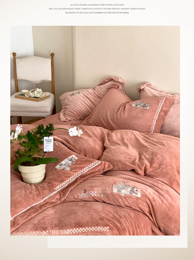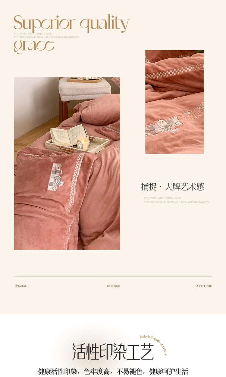 名品优仓 2023新款高克重230克牛奶绒绣花款四件套-极简 极简-仲夏粉