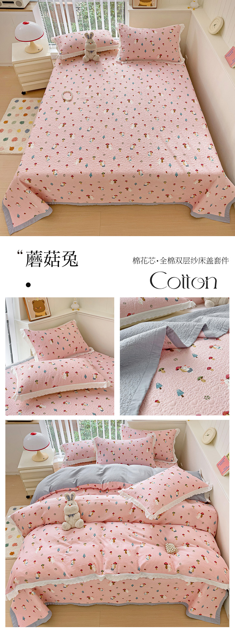 羽爱家纺 2024新款A类双层纱棉花芯床盖套件 蘑菇兔