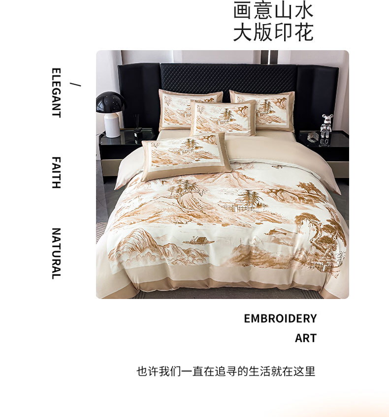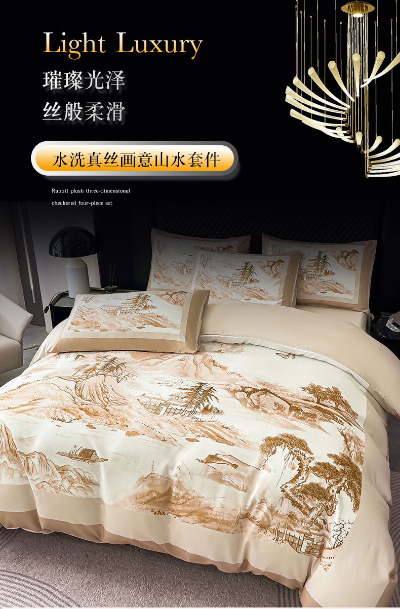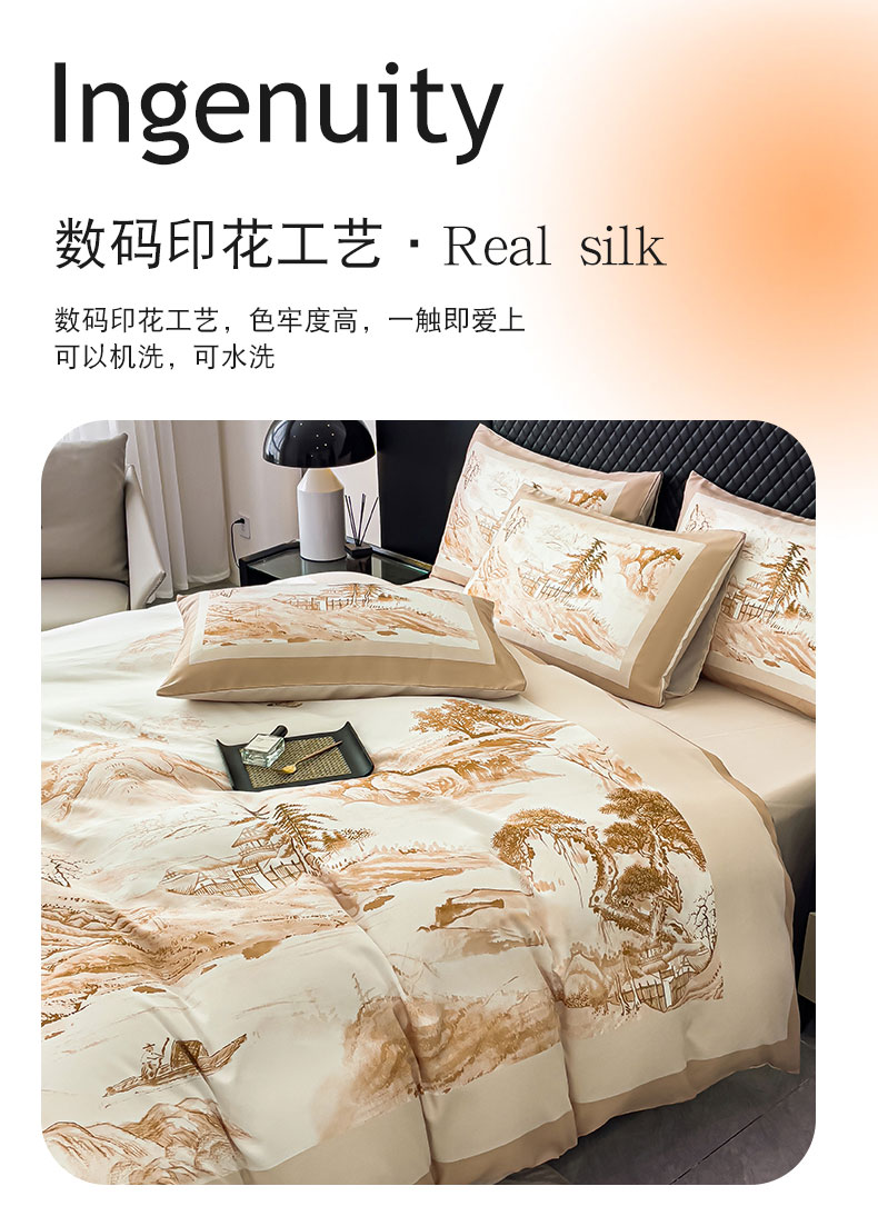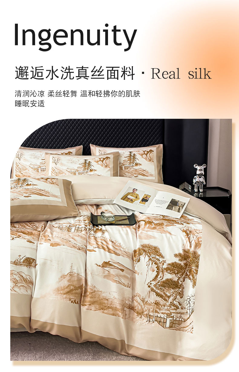 商品名称:2024新款水洗真丝画意山水系列四件套 画意山水-咖