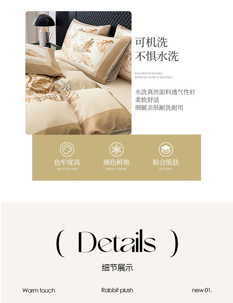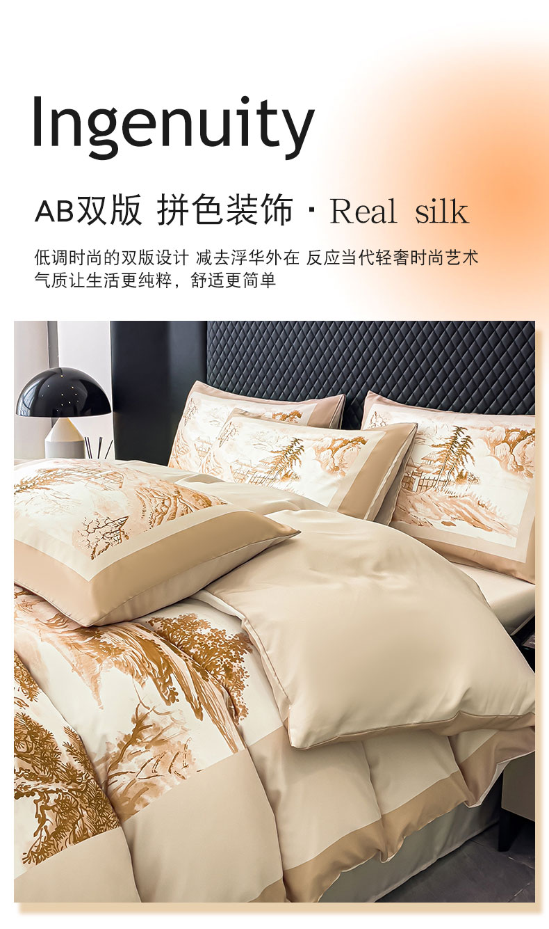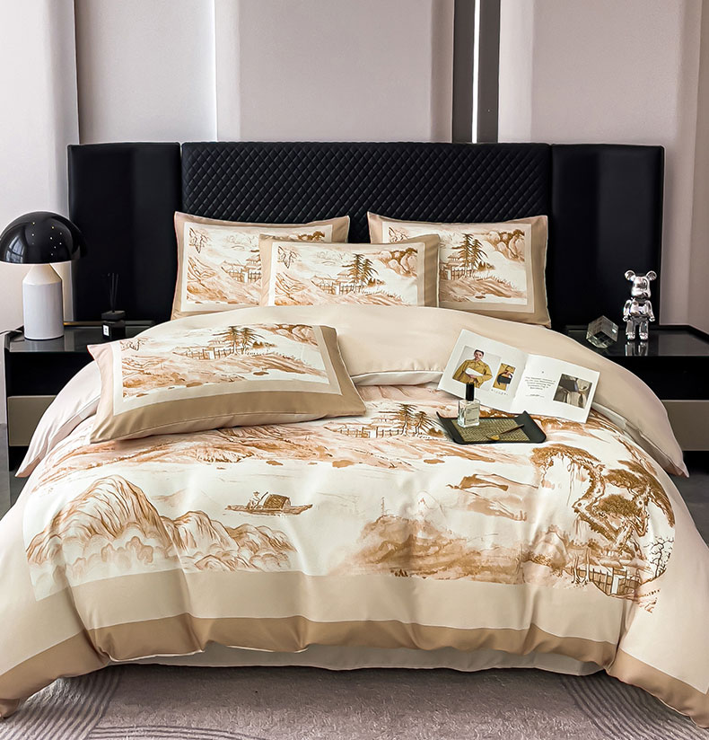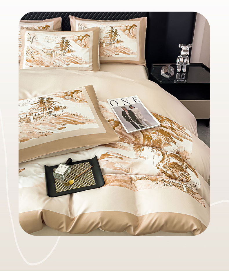 商品名称:2024新款水洗真丝画意山水系列四件套 画意山水-咖