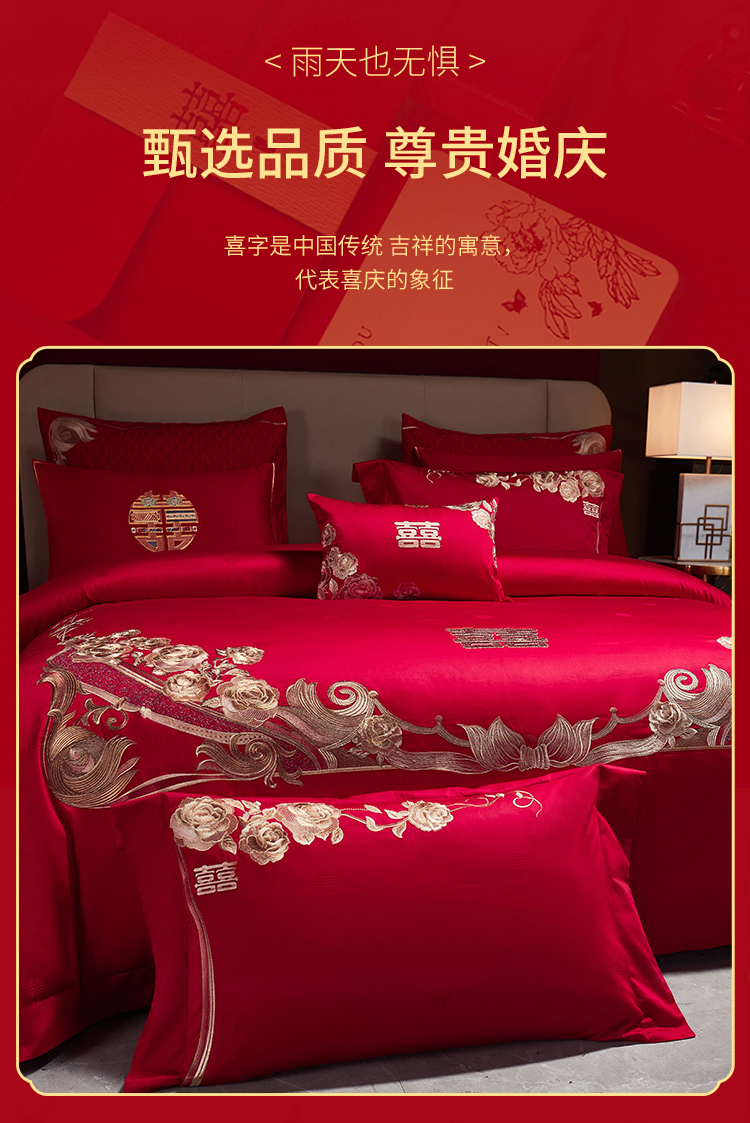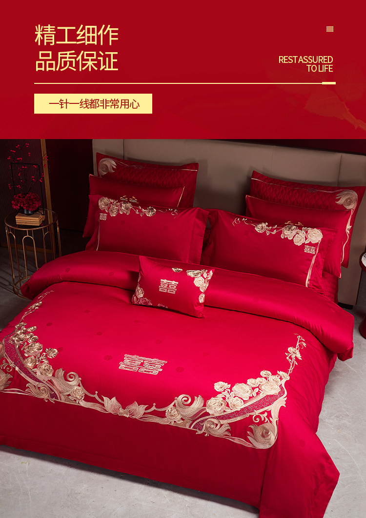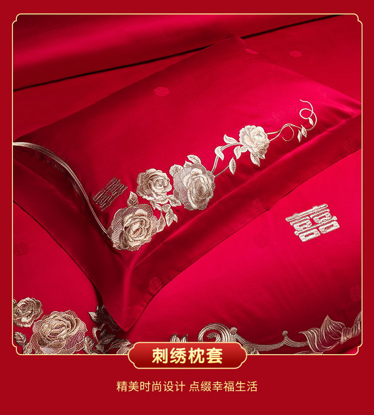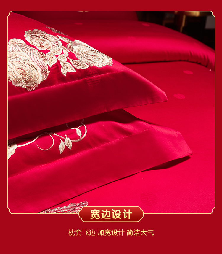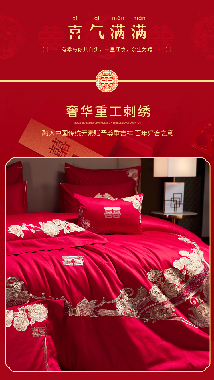 当前位置: 91家纺网 > 商品网购 > 床品套件 > 四件套 > 婚庆四件套 > 美娘阁 2025新款长绒棉贡缎提花古典新中式奢华精美刺绣四件套系列二 喜事连连