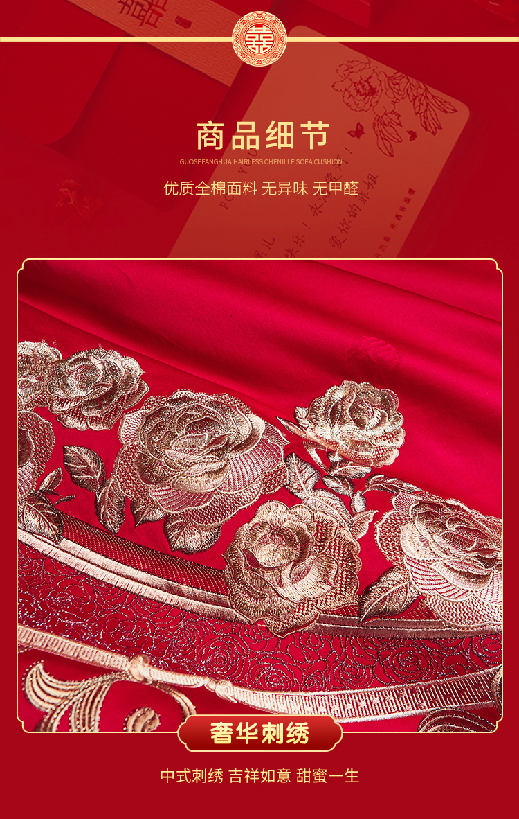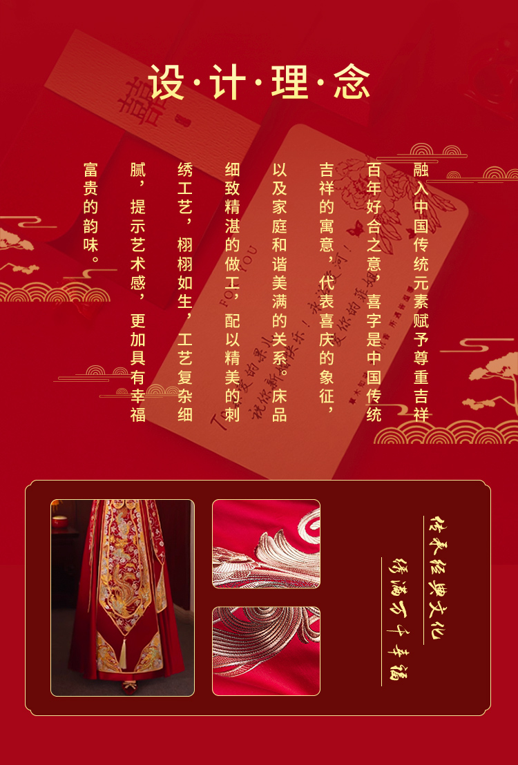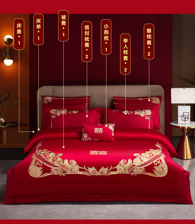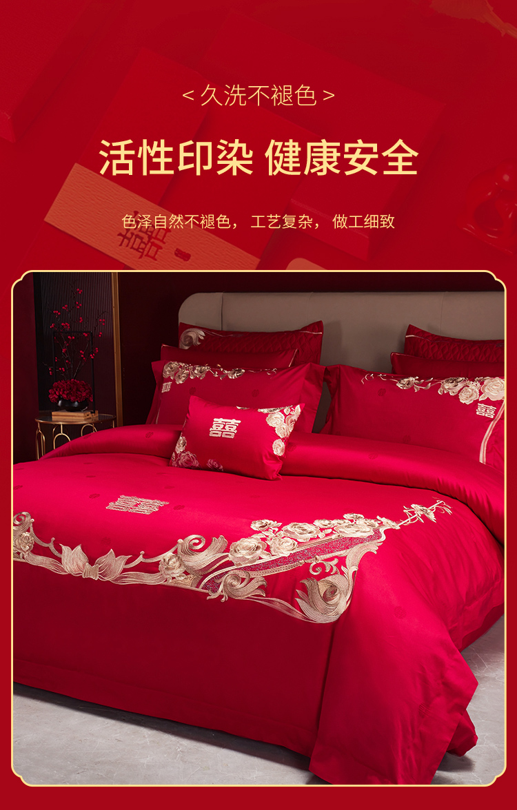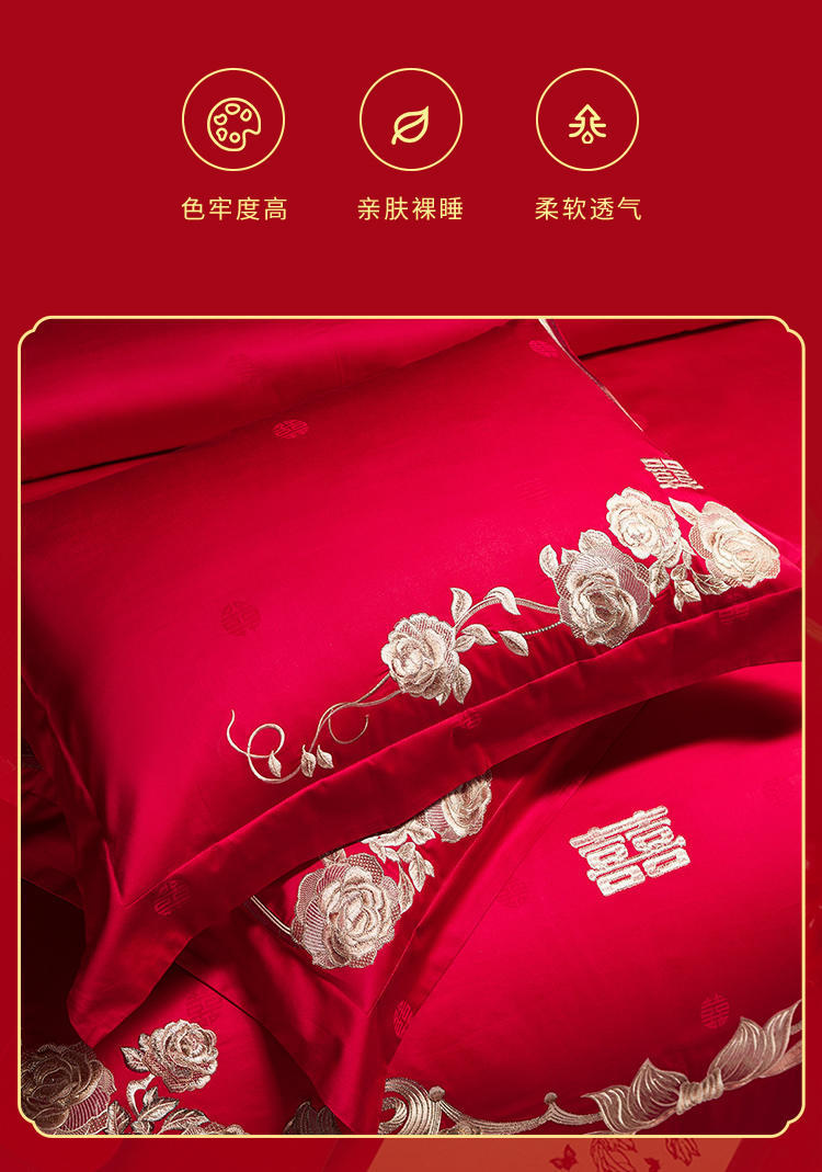 当前位置: 91家纺网 > 商品网购 > 床品套件 > 四件套 > 婚庆四件套 > 美娘阁 2025新款长绒棉贡缎提花古典新中式奢华精美刺绣四件套系列二 喜事连连