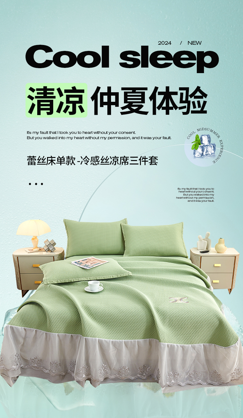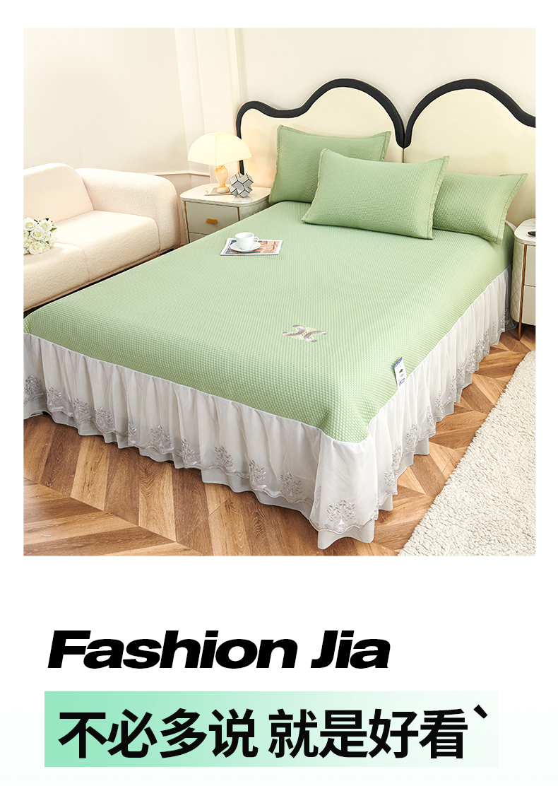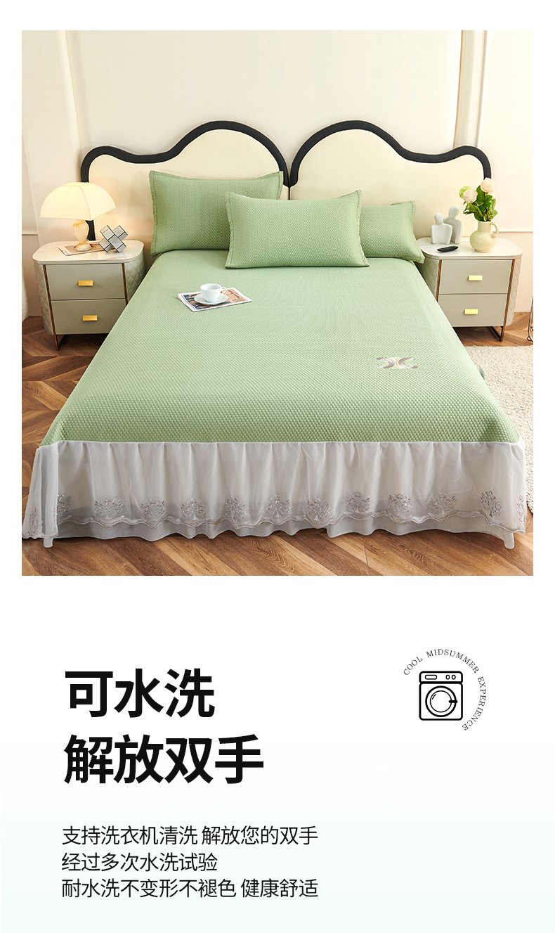 商品名称:宜派家纺 2024新款雪花冷感席三件套床单式床裙款 凤尾-绿