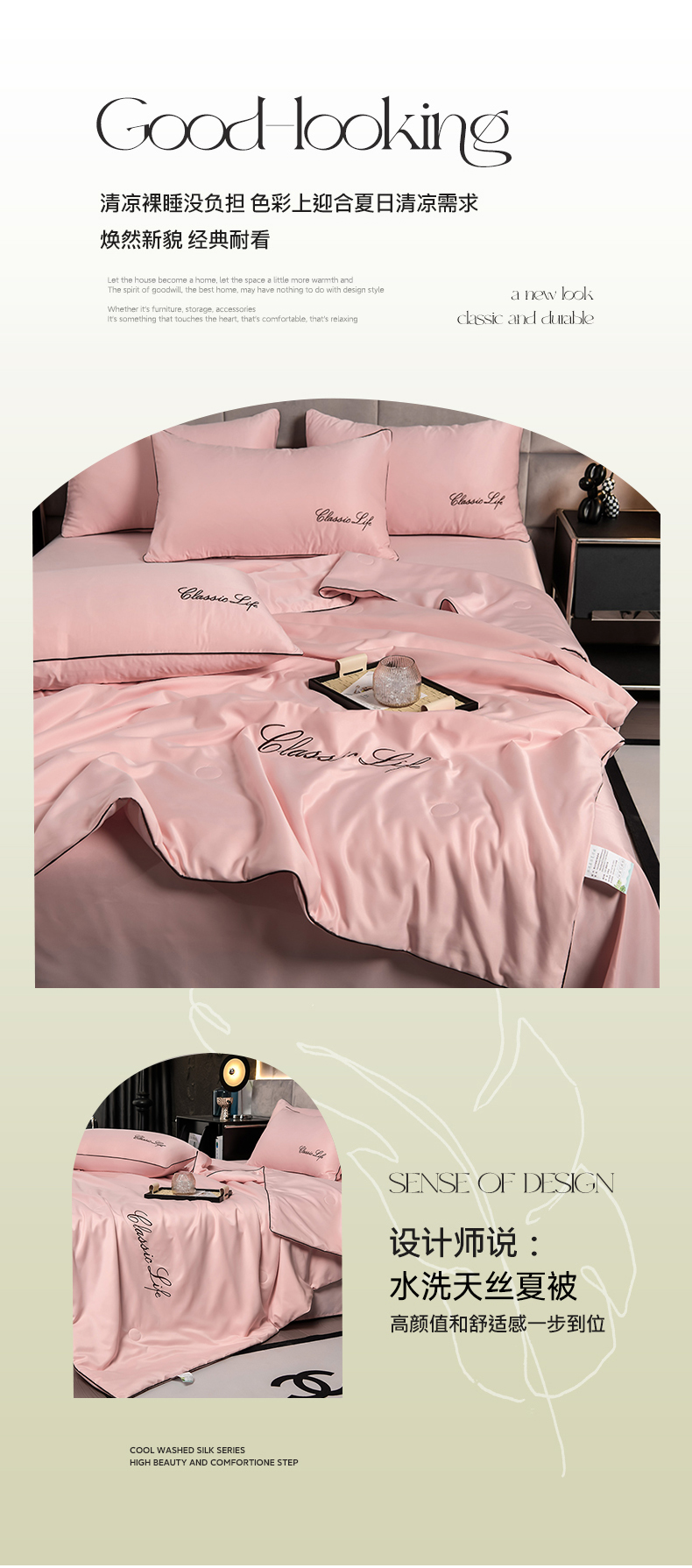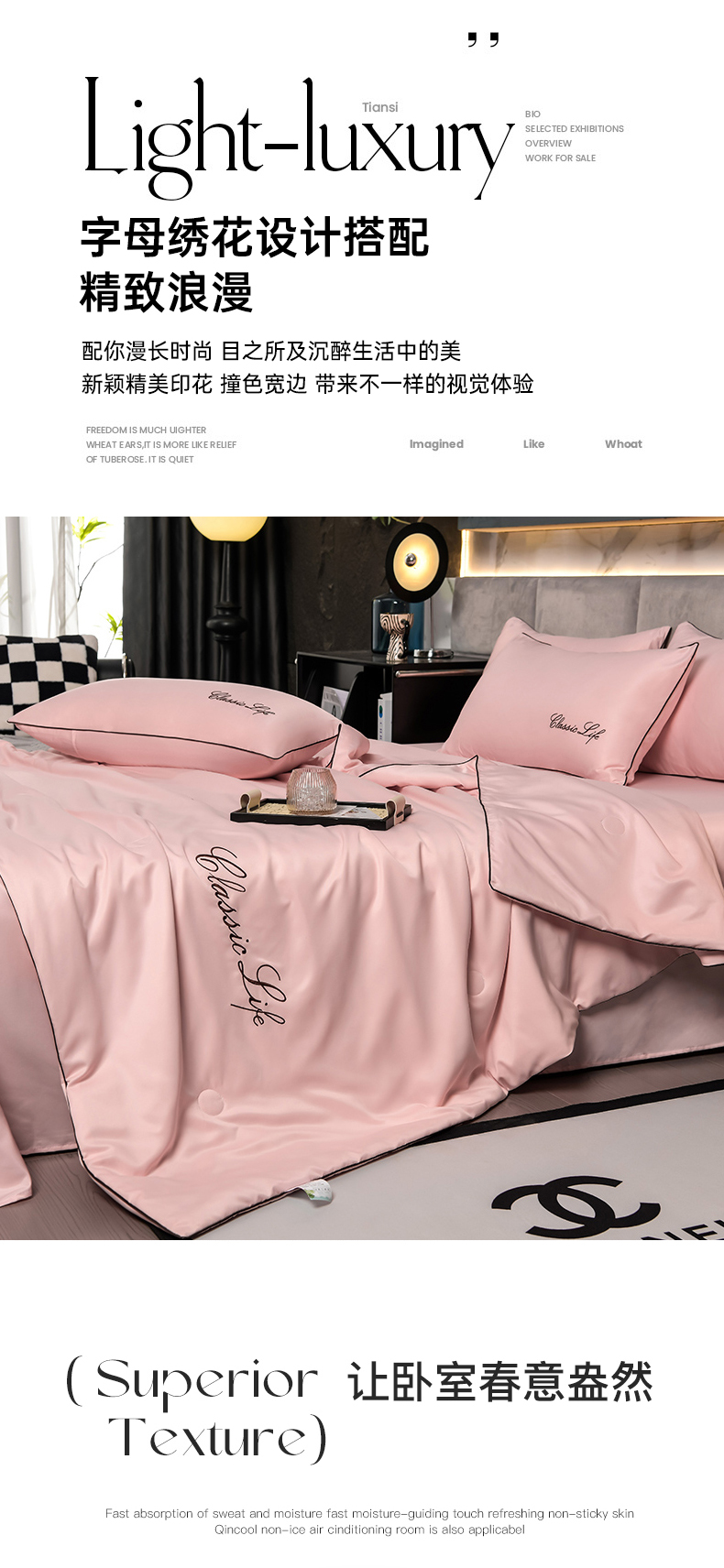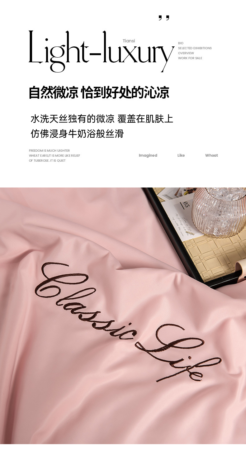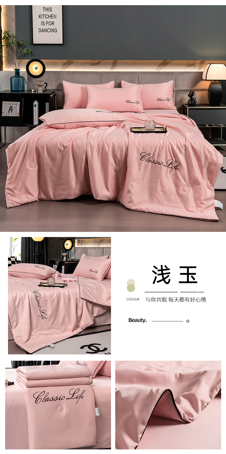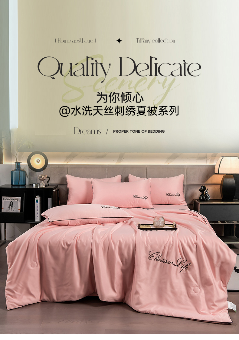 当前位置: 91家纺网 > 商品网购 > 床品套件 > 四件套 > 夏被四件套 > 益多眠 2024爆款水洗真丝夏被四件套冰丝夏被轻奢夏被空调被羽毛夏被四件套绣花夏被 字母---浅玉