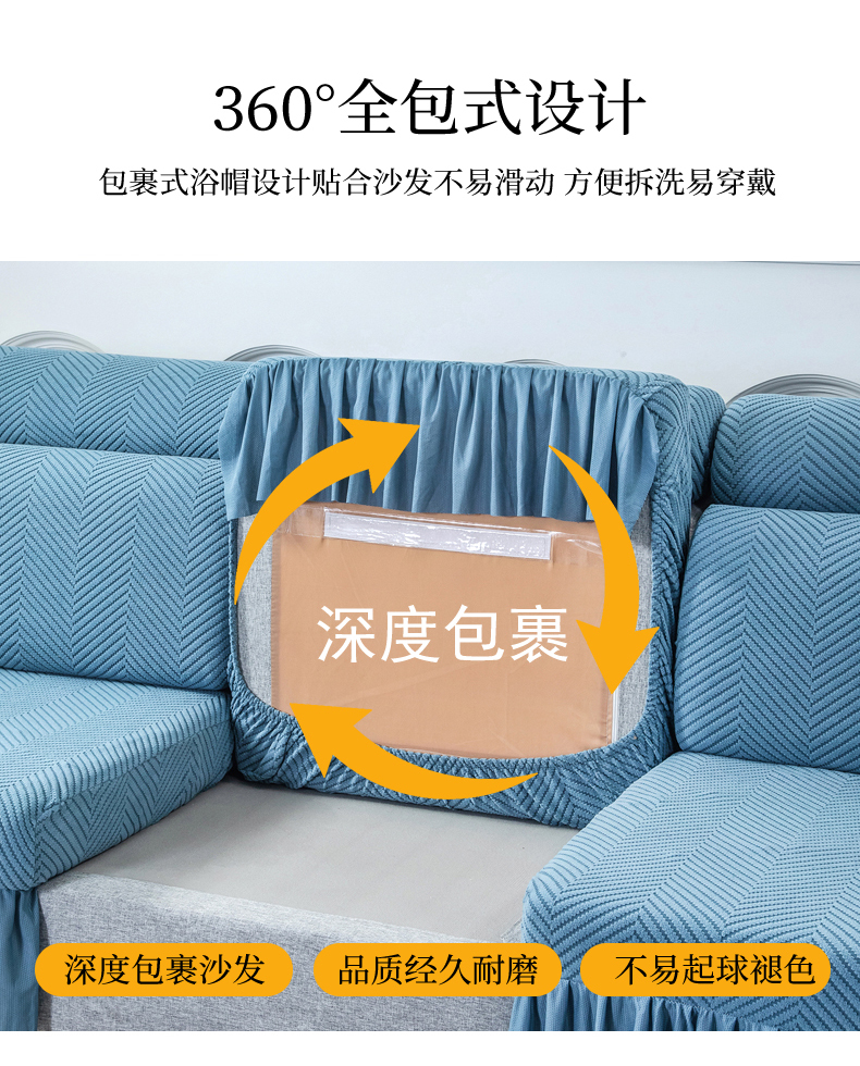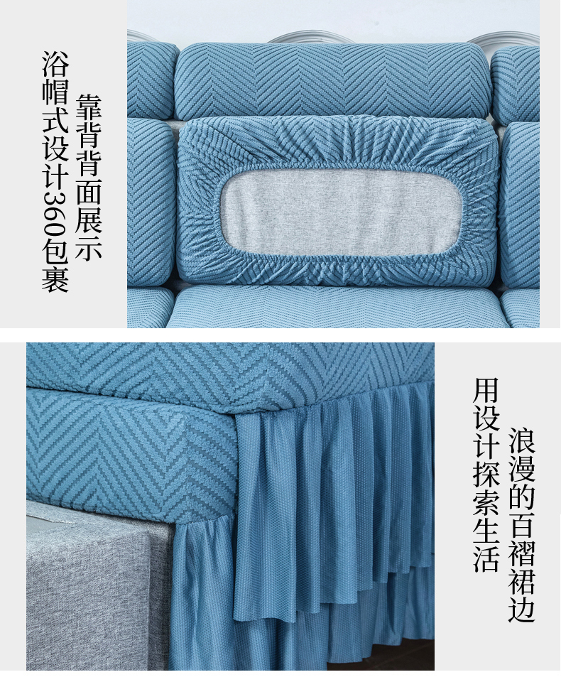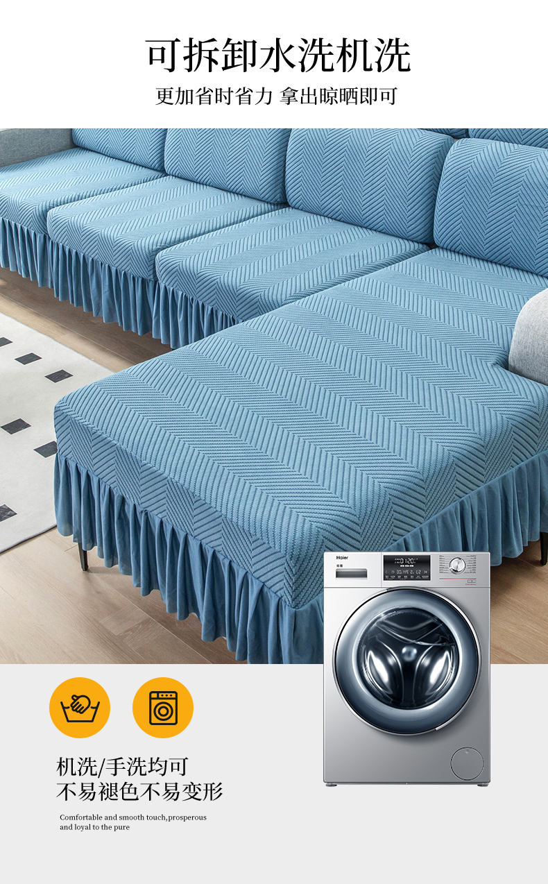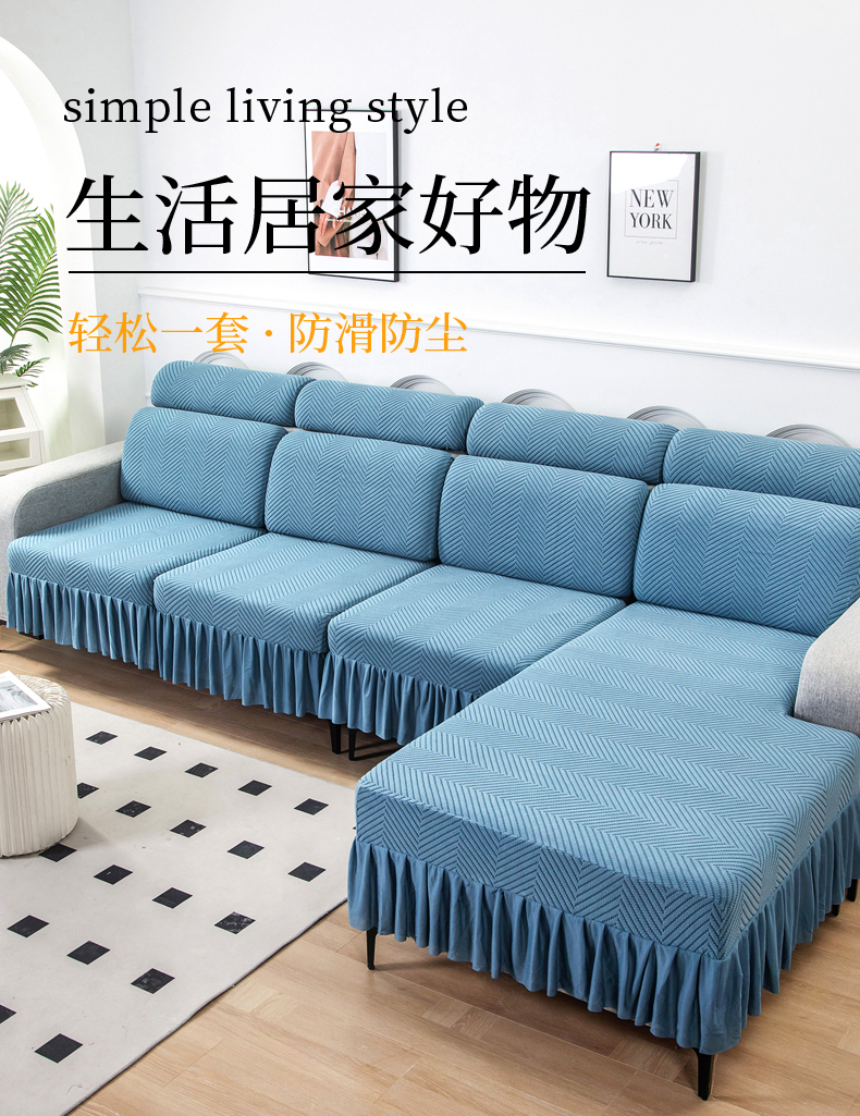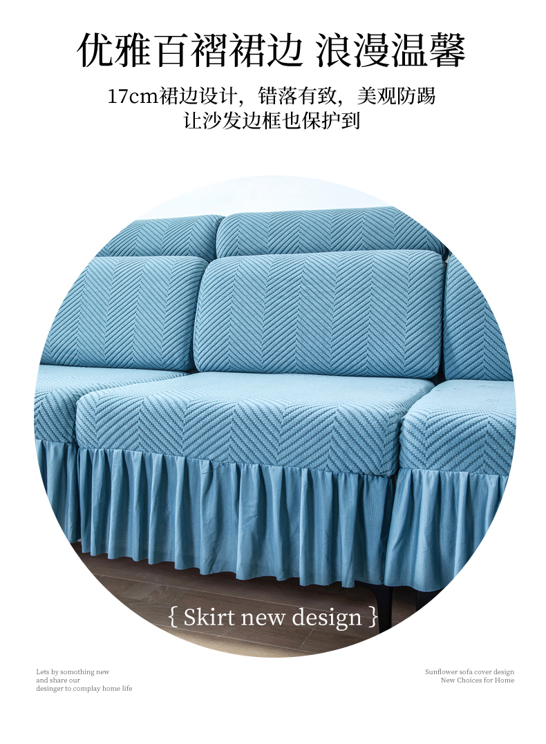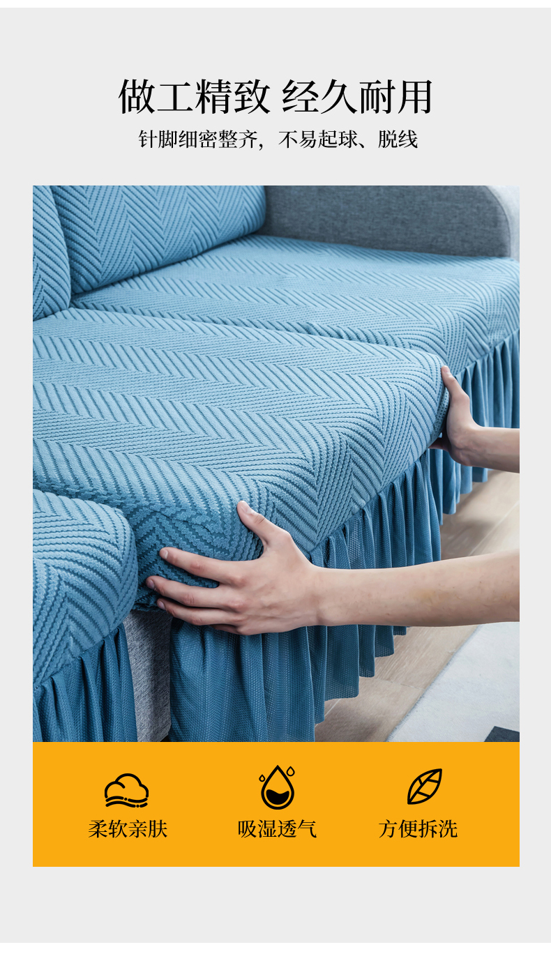 当前位置: 91家纺网 > 商品网购 > 居家布艺 > 坐垫/椅垫/沙发垫 > 沙发垫 > 千彤 2024新款裙边款弹力沙发套罩拉花绒人字纹系列沙发笠 水蓝