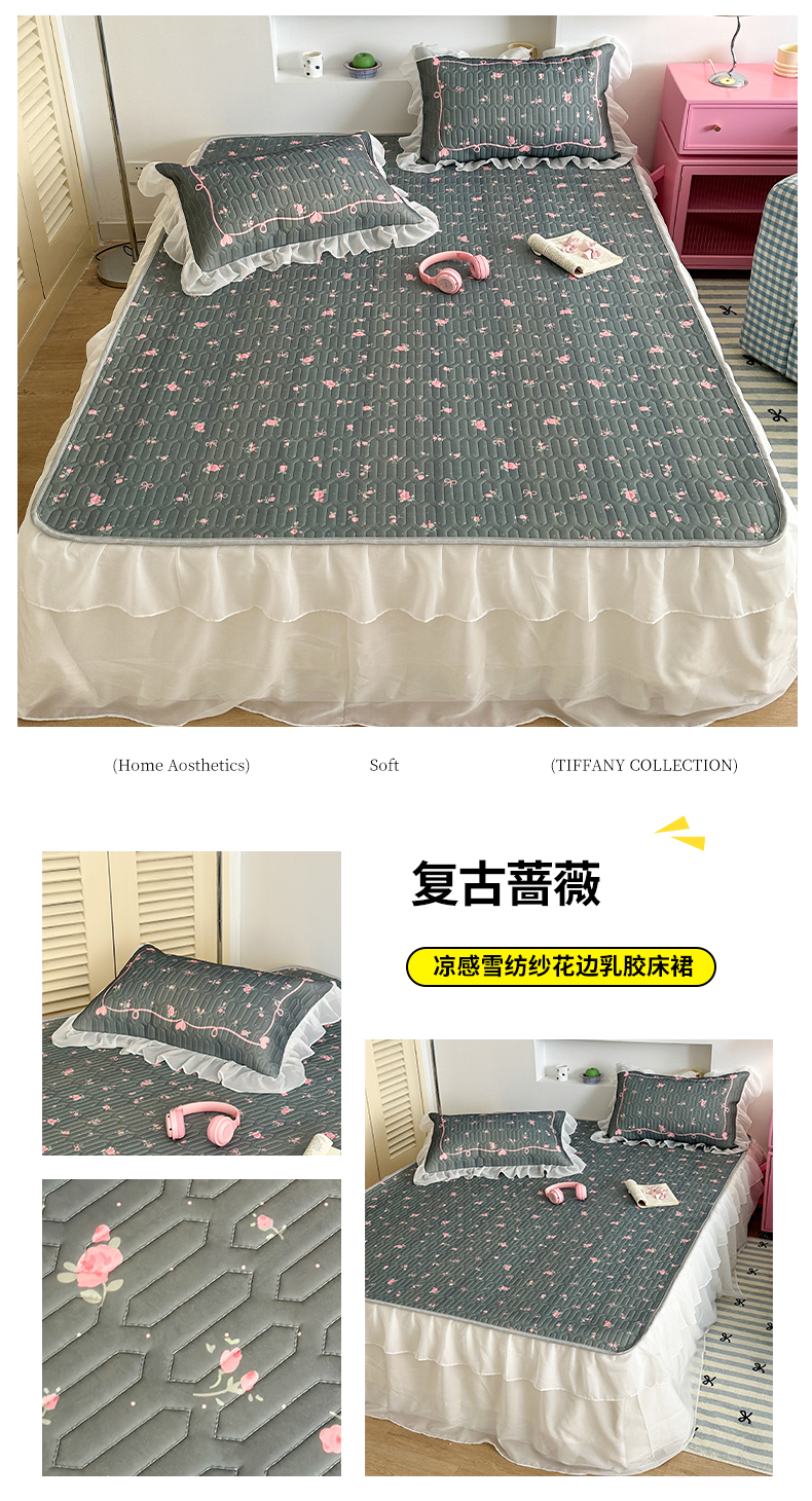 昔可 新款床裙款乳胶凉席双层雪纺纱乳胶凉席三件套 复古蔷薇